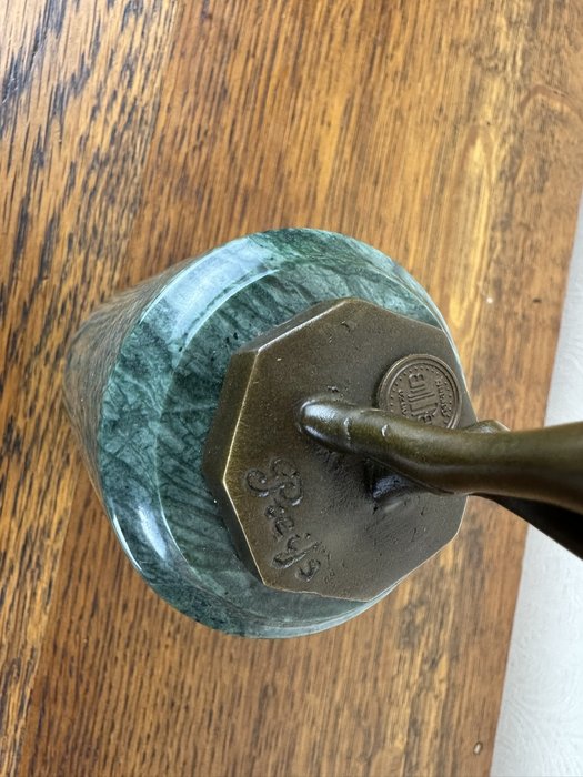 Jemne modelovaná bronzová socha putta s klasmi v náručí, inšpirovaná dielom H. Moreaua. Figúrka stojí na mramorovej základni o rozmere 20 × 20 cm, opatrené reprodukčným štítkom.