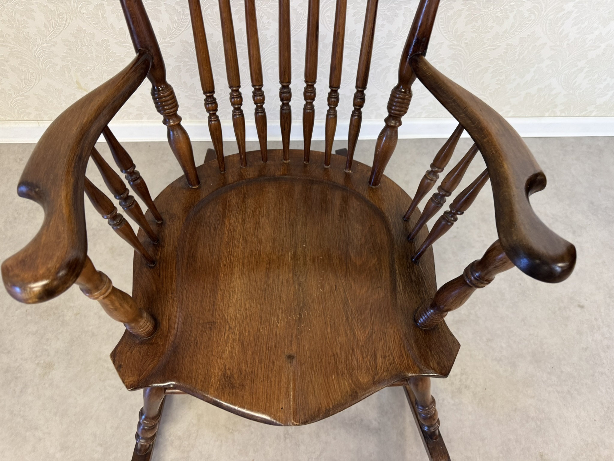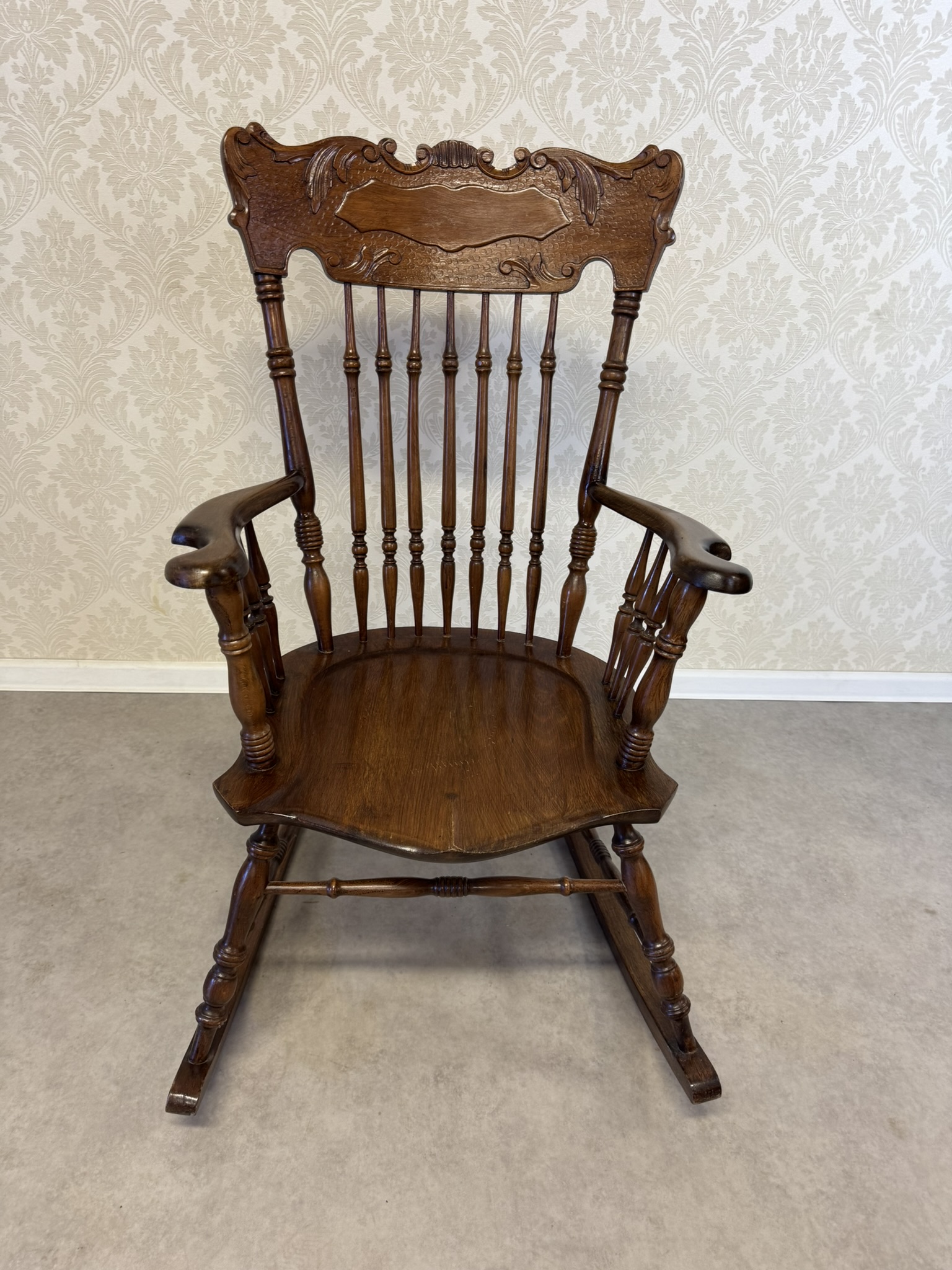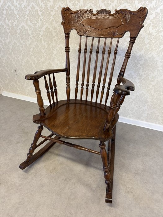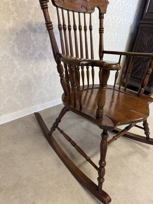 Hojdacie kreslo s vysokým operadlom, tvarovanými podrúčkami a sústruženými detailmi.