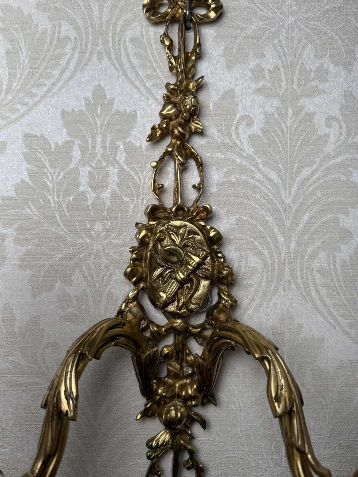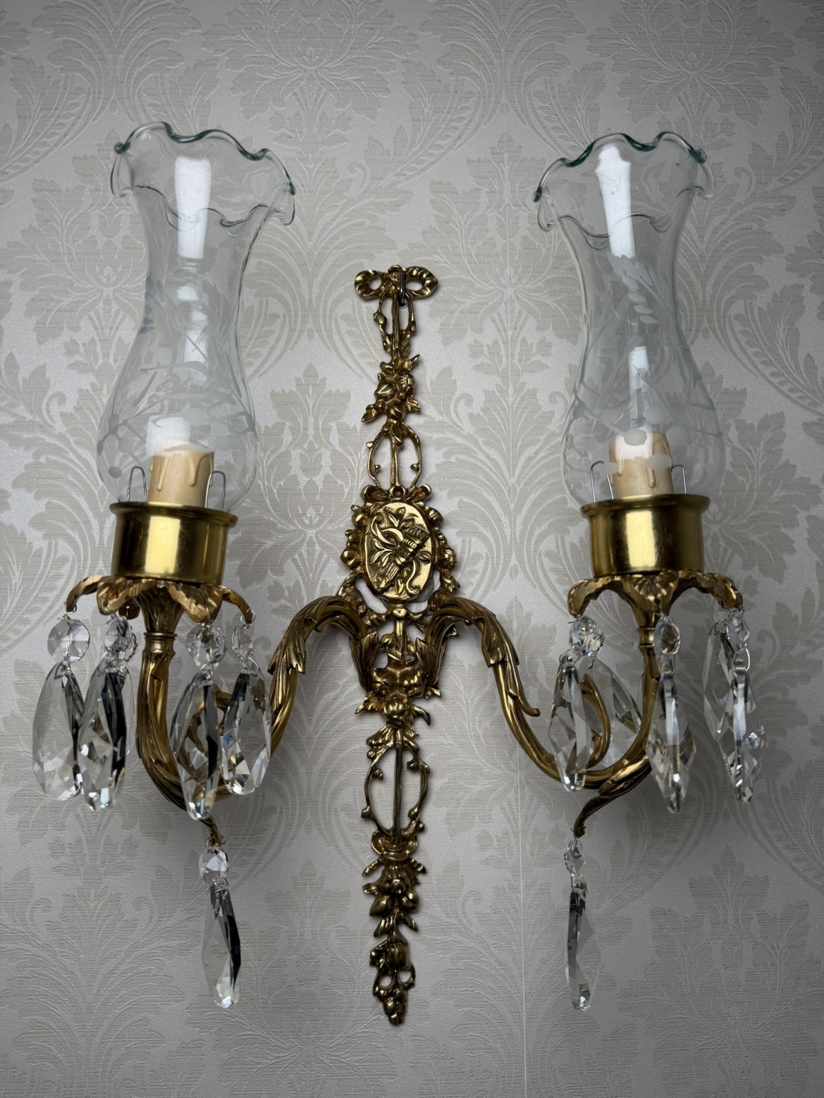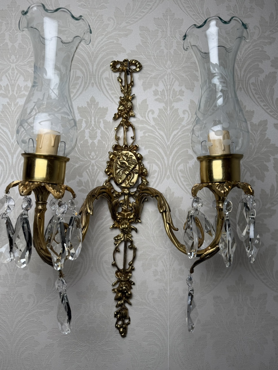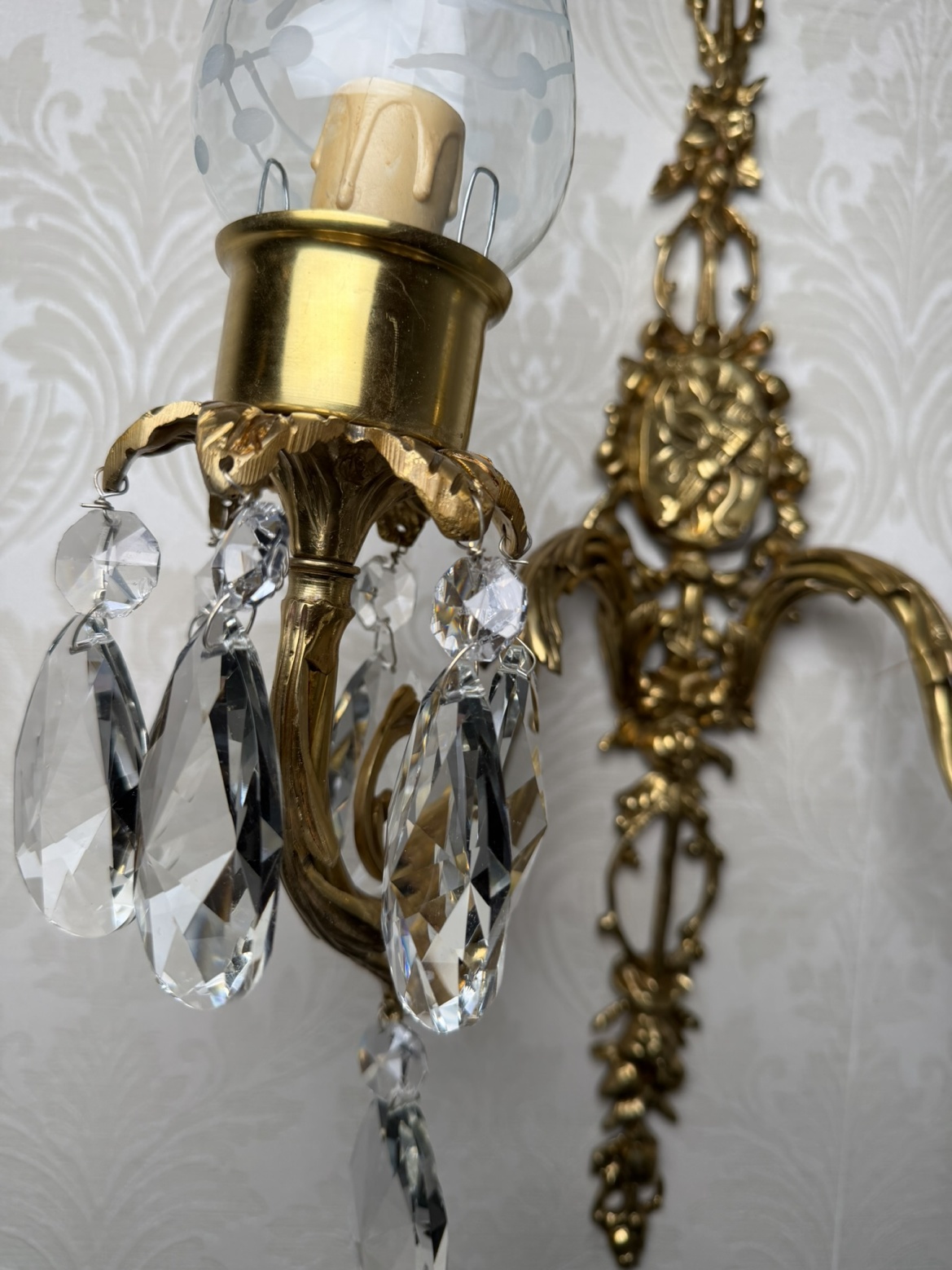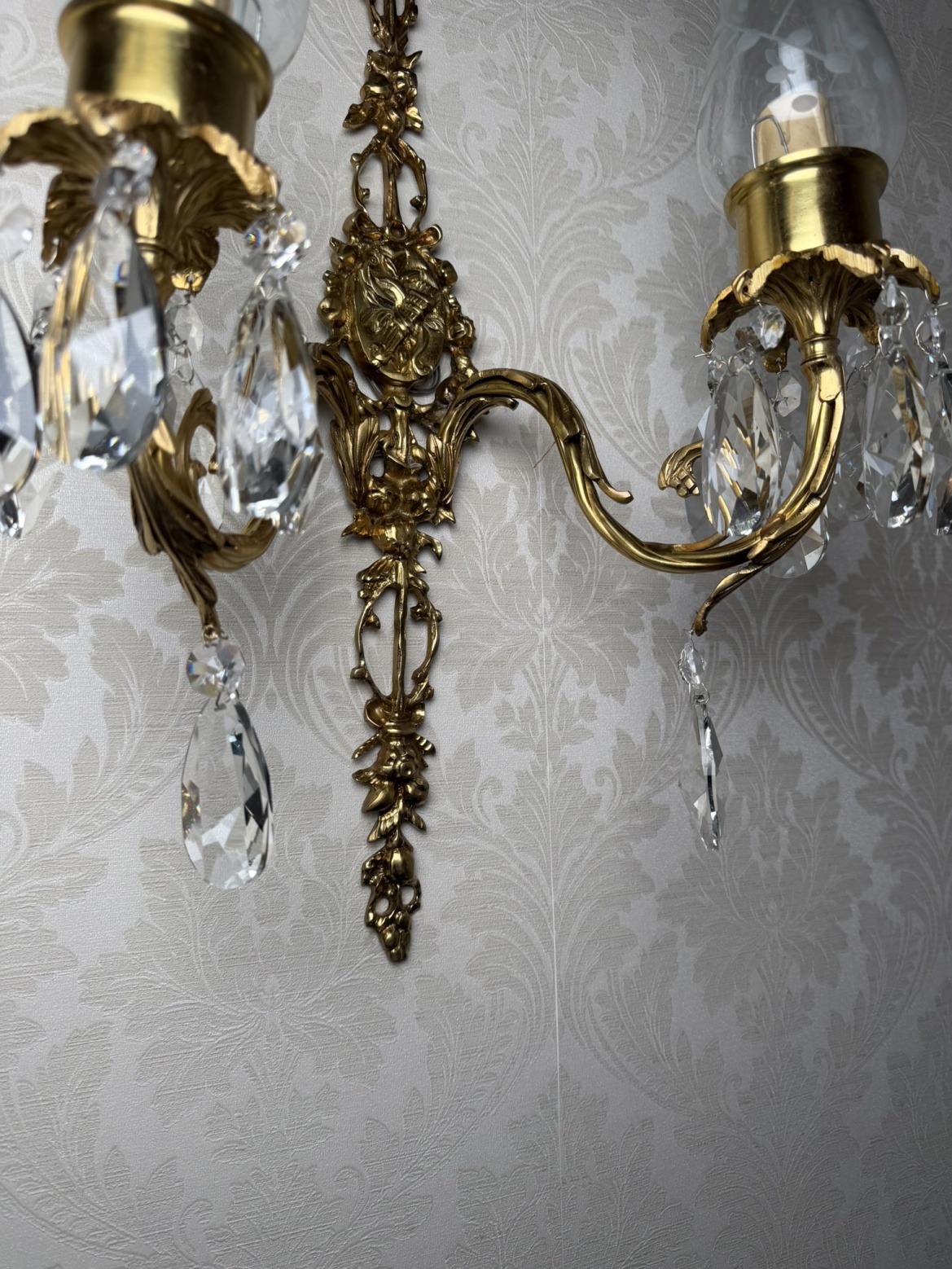 Dvojramenné nástenné svetlo z patinovanej mosadze s bohatým florálnym dekorom. Dve ramená zdobené krištáľovými ovesmi krásne rozptyľujú svetlo.