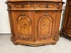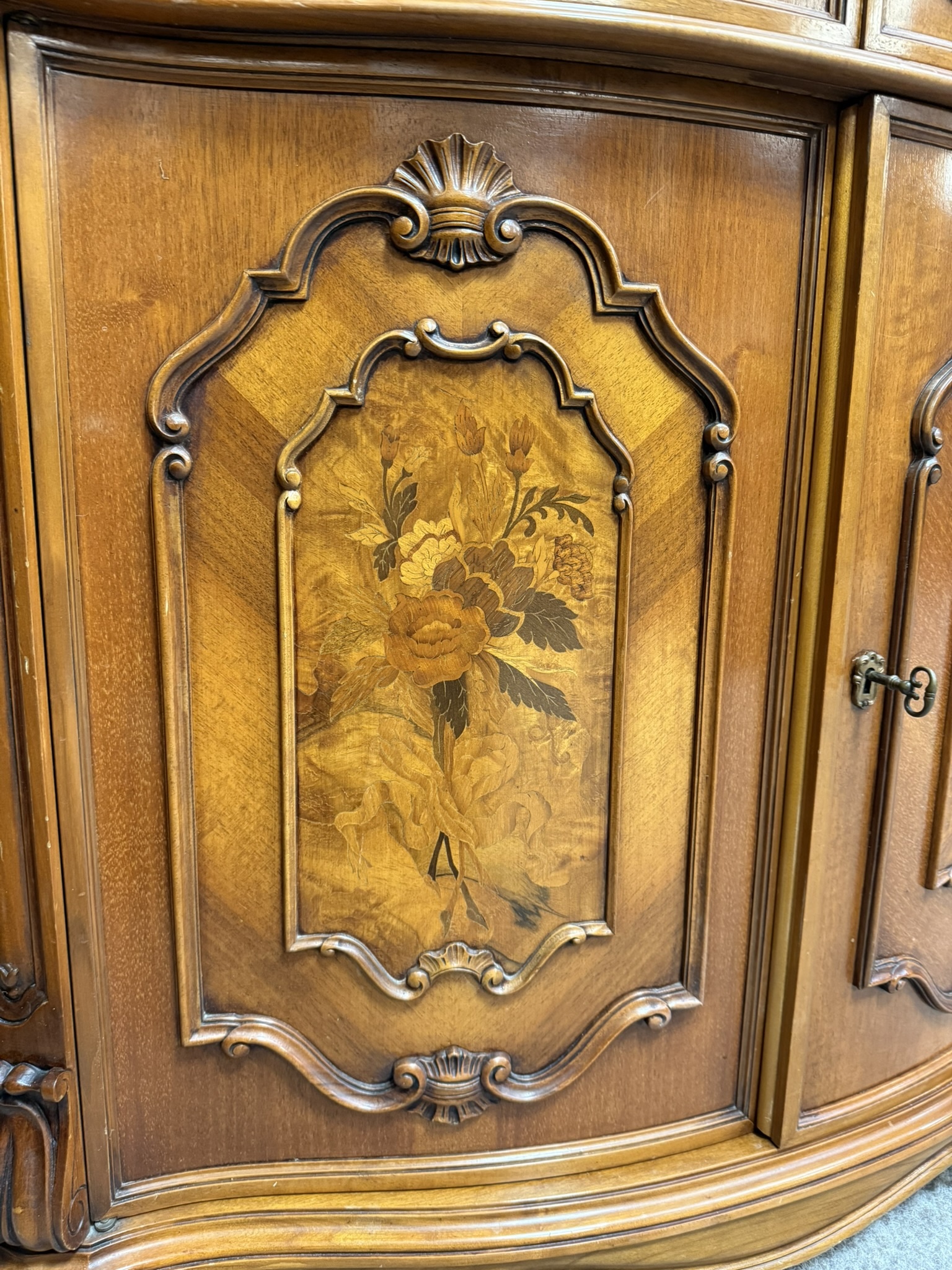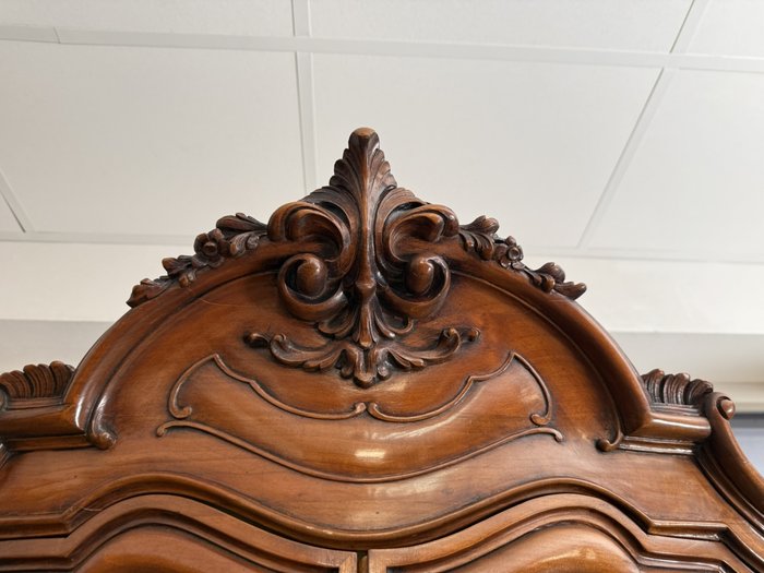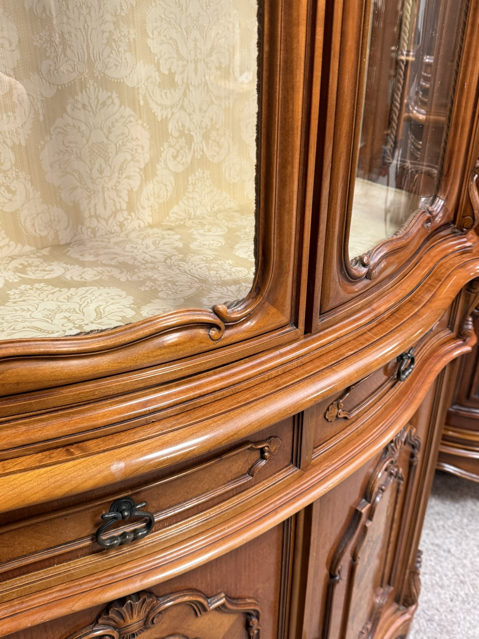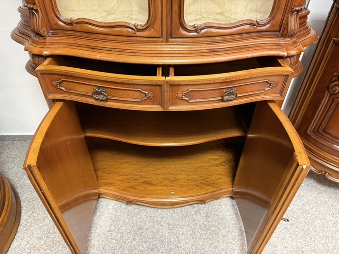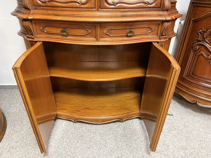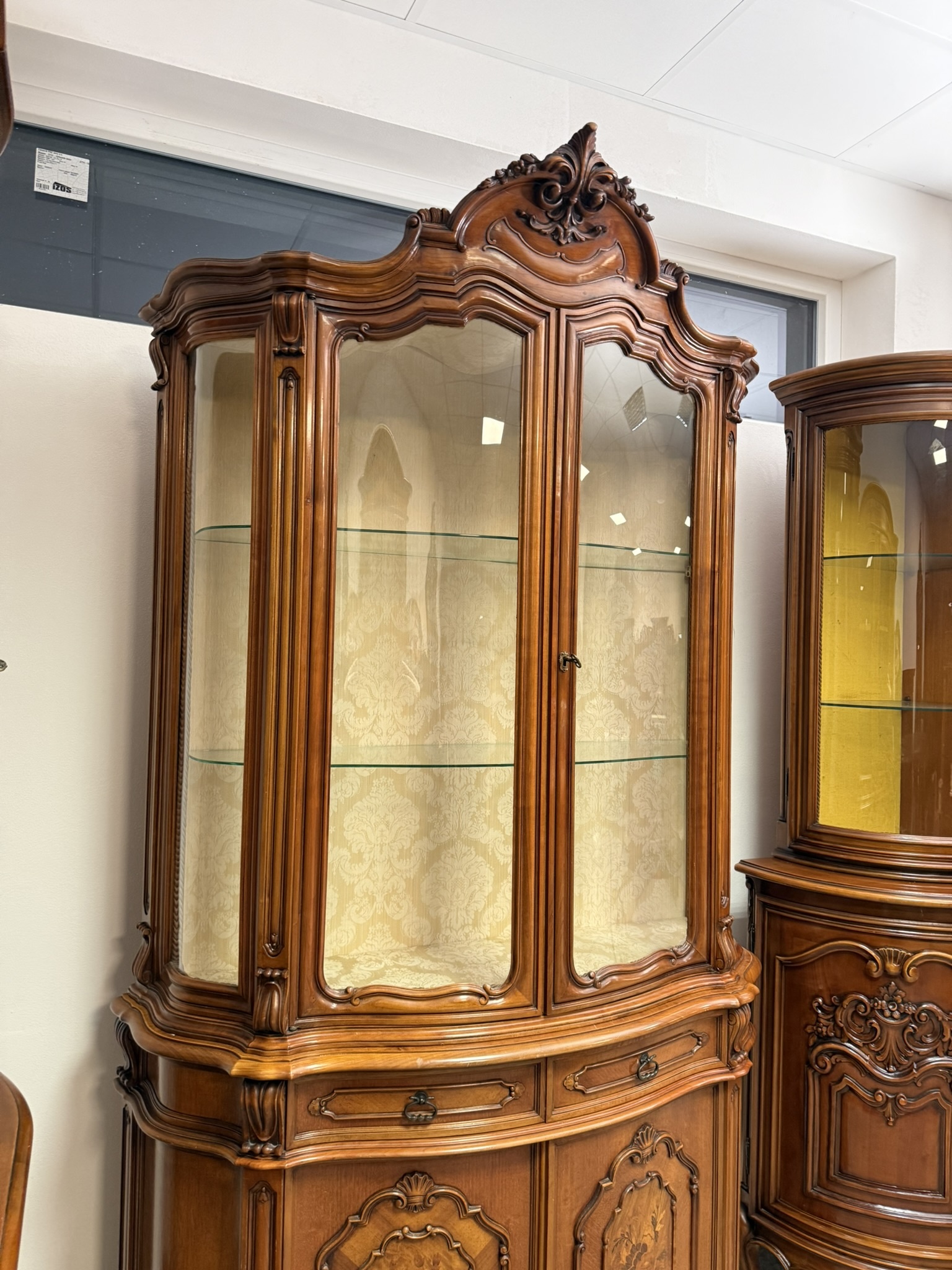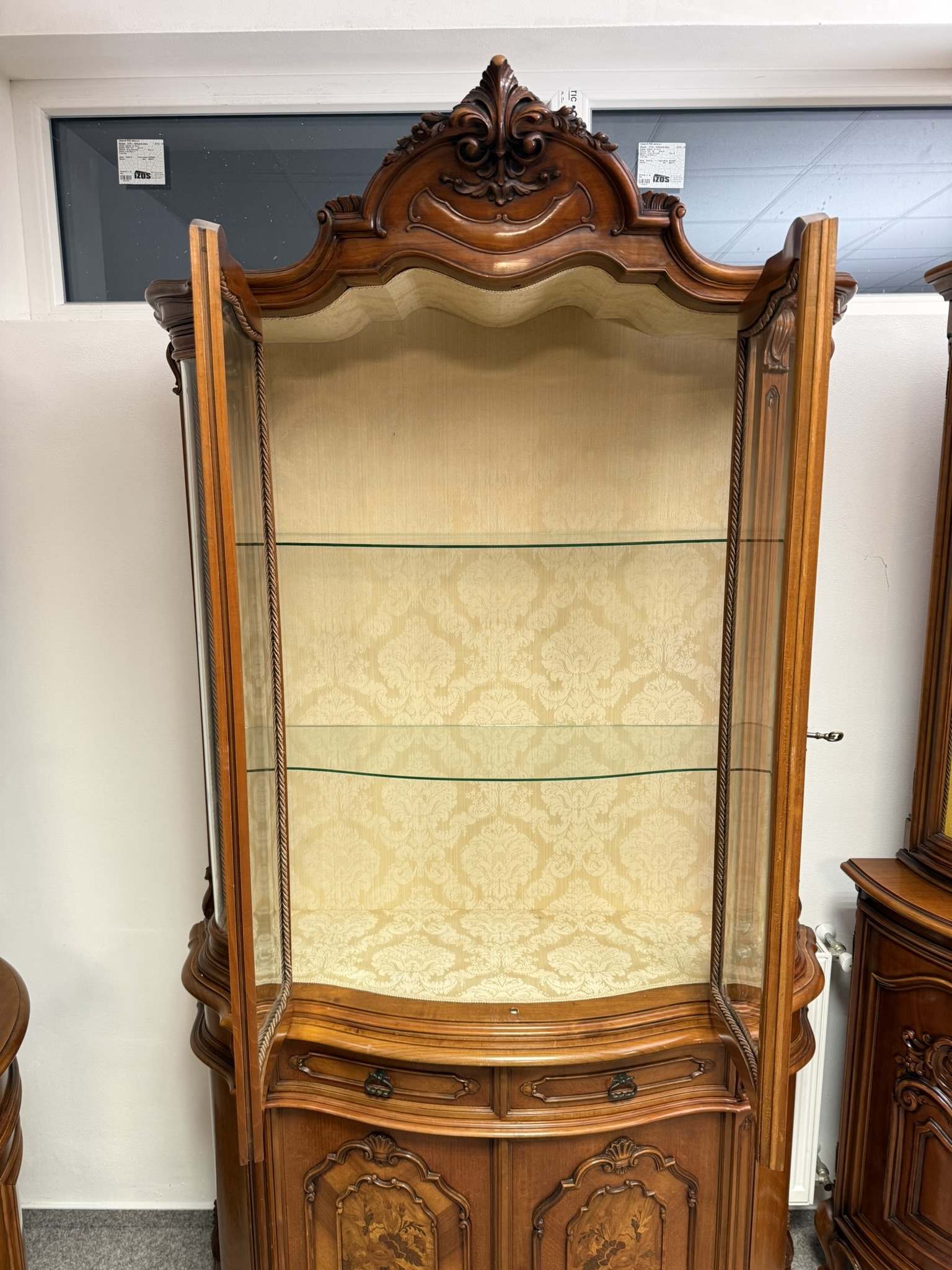 Vitrína s preskleným horným dielom so sklenenými policami. Spodnú časť tvoria intarzované dvierka s kvetinovými motívmi a zásuvky s ozdobným kovaním. Dominantným prvkom je bohato rezaná horná korunka s ladnými krivkami.1 138,89 €