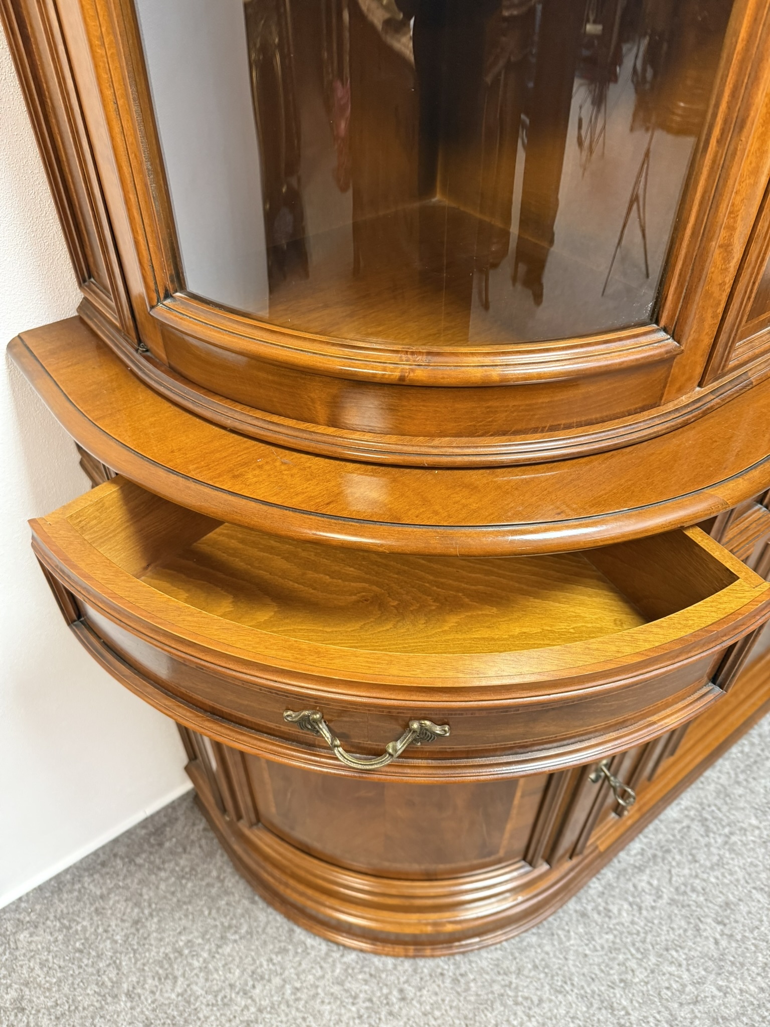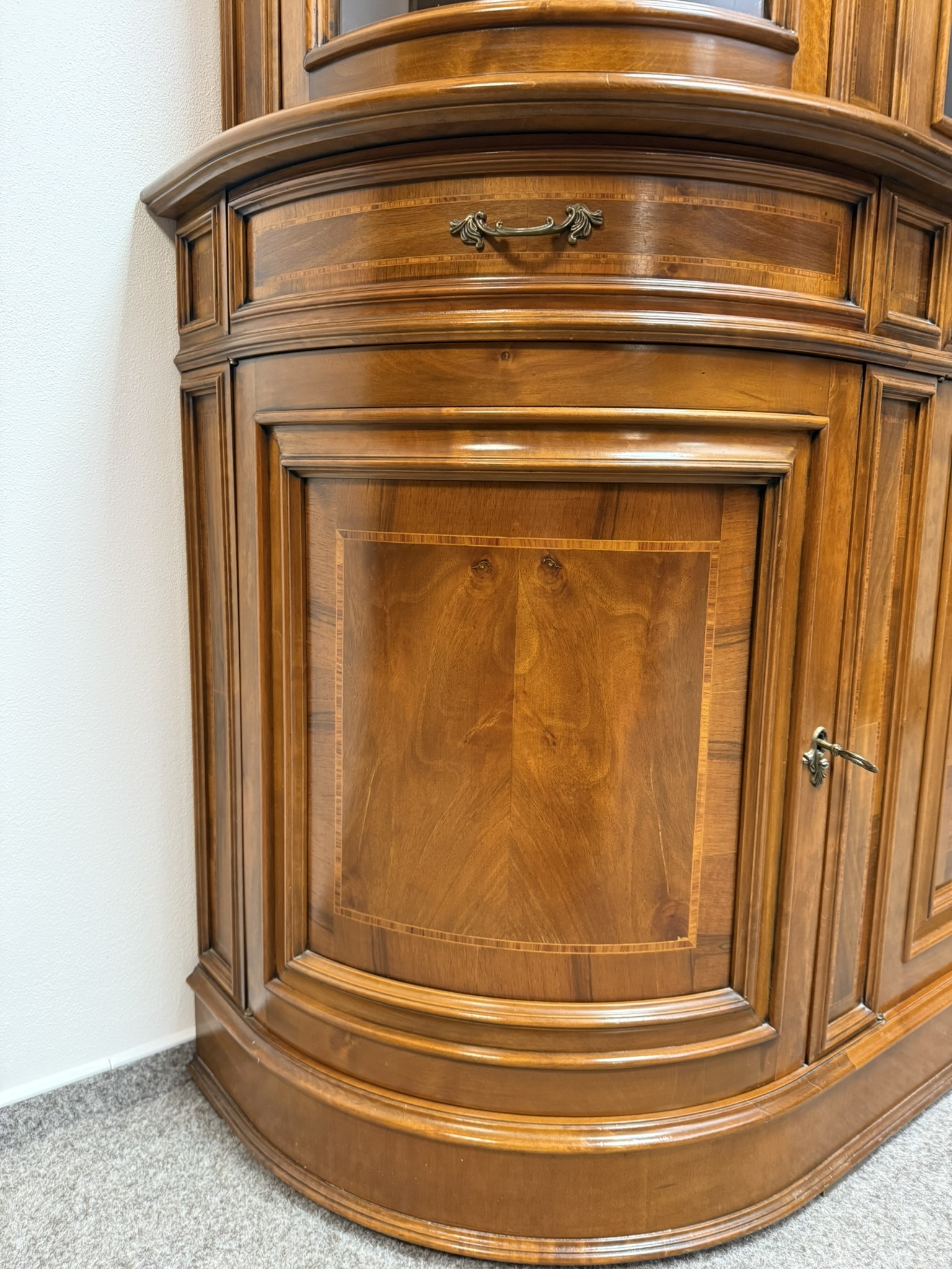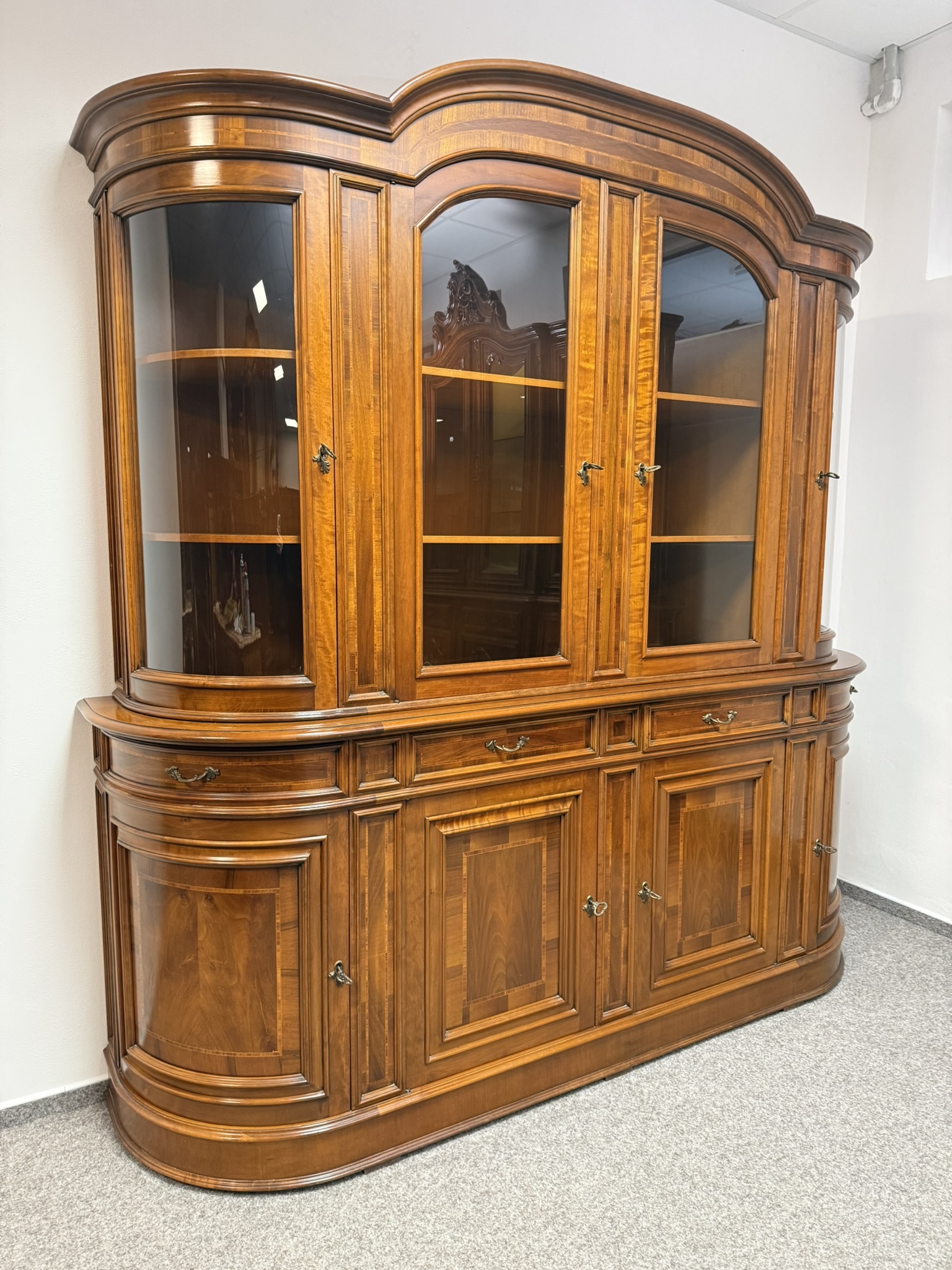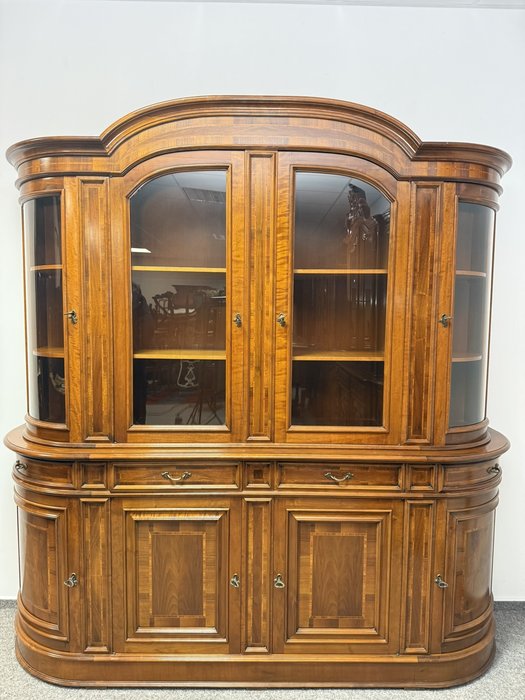 Precízne spracovaná vitrína s čistými líniami, jemnou intarziou a oblúkovým zakončením vrchnej časti. Presklený horný diel s policami je ideálny na vystavenie porcelánu či skla. Spodná časť s dvierkami a zásuvkami ponúka praktický úložný priestor. Harmonické proporcie a decentnú ozdobnosť.1 233,08 €