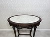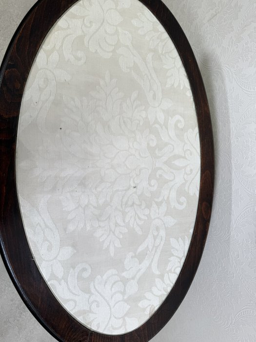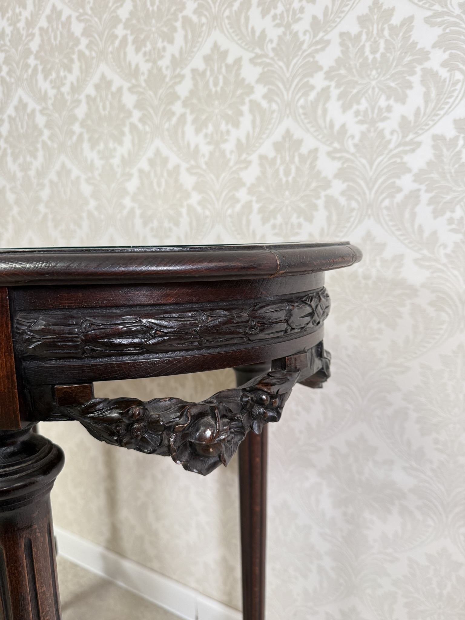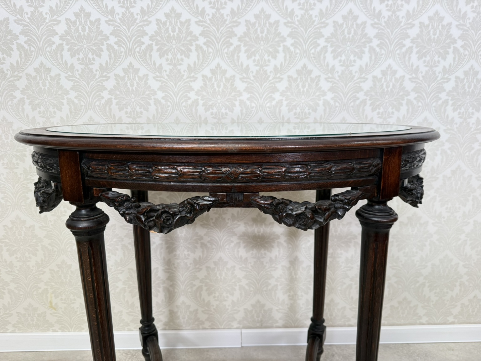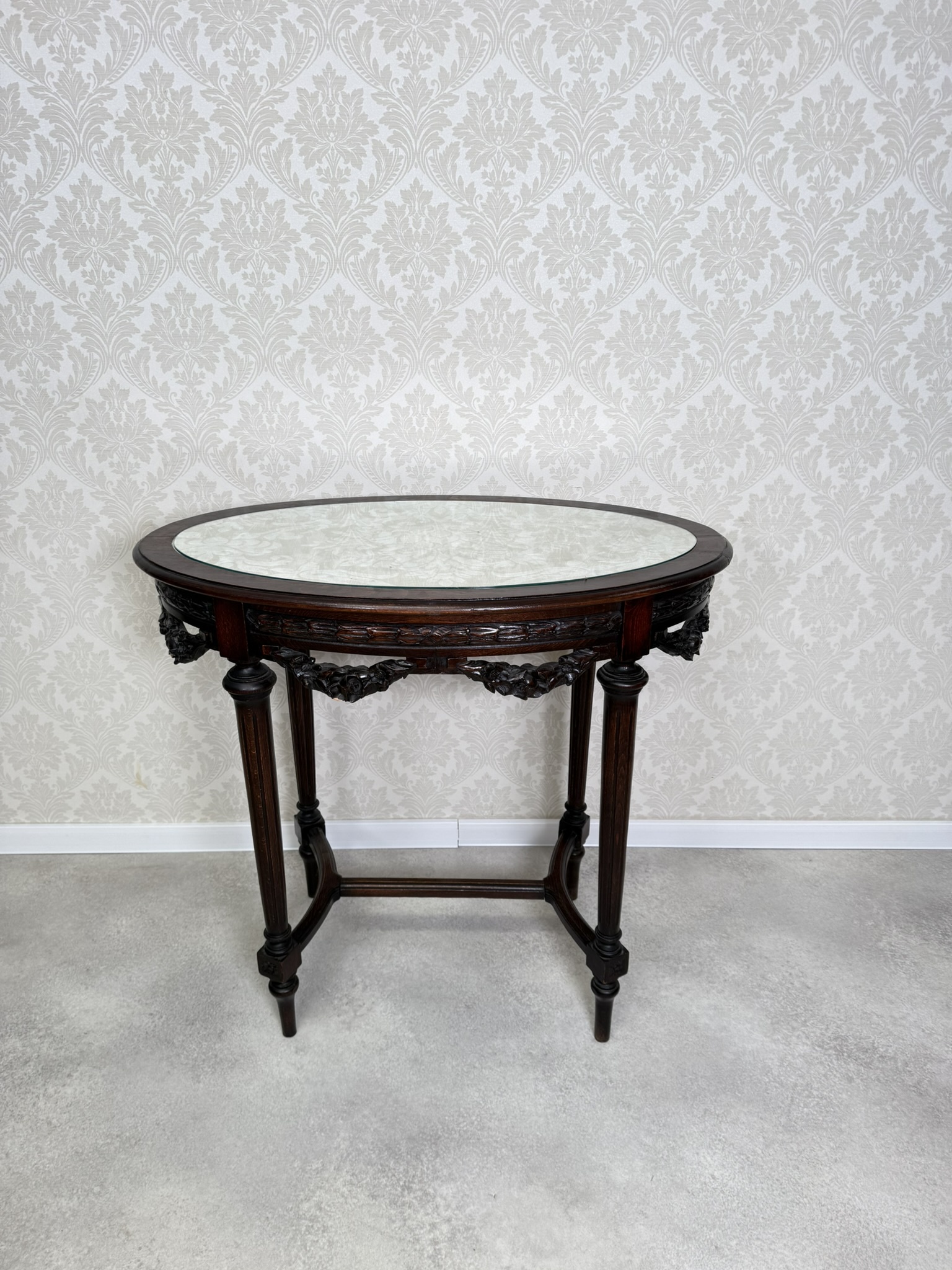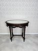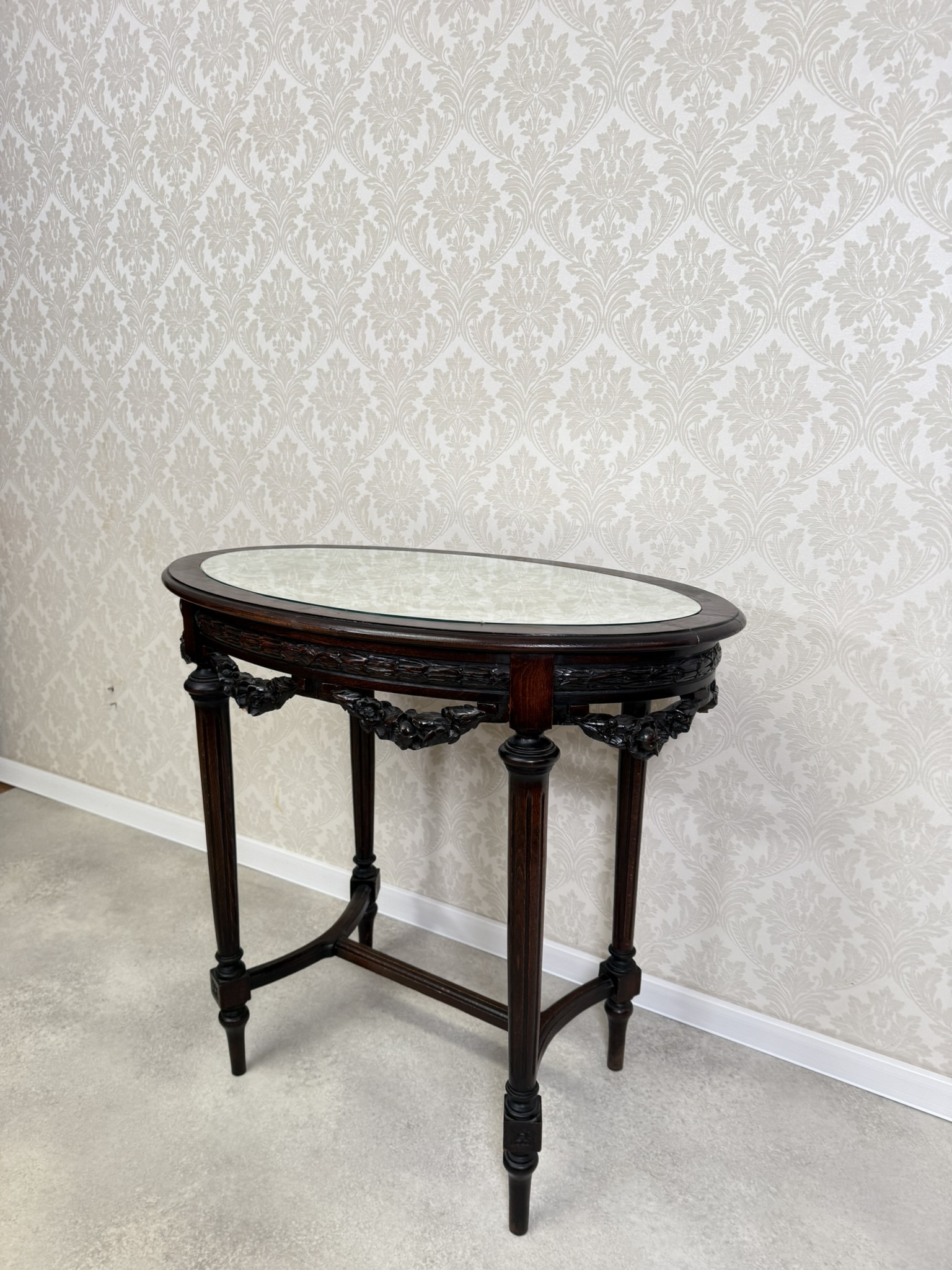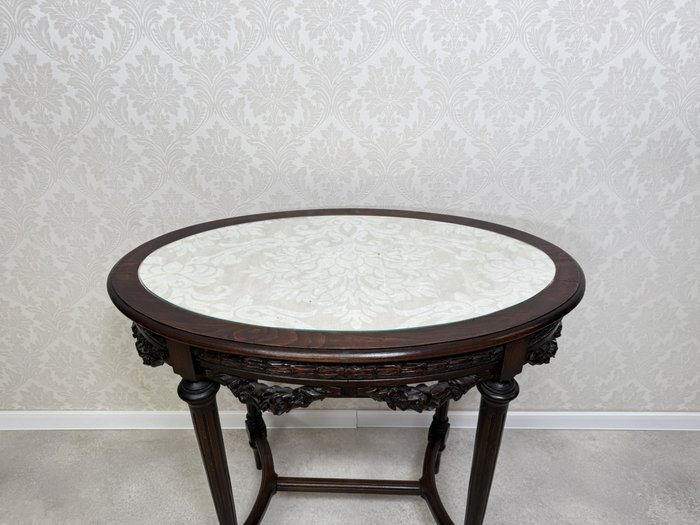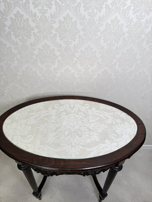 Elegantný oválny stolík s vyrezávanými detailmi. Tmavo morená konštrukcia vyniká kvalitným remeselným spracovaním a harmonickými proporciami. Doska je krytá sklom, pod ktorým sa nachádza dekoratívna textília s jemným vzorom.299,2 €