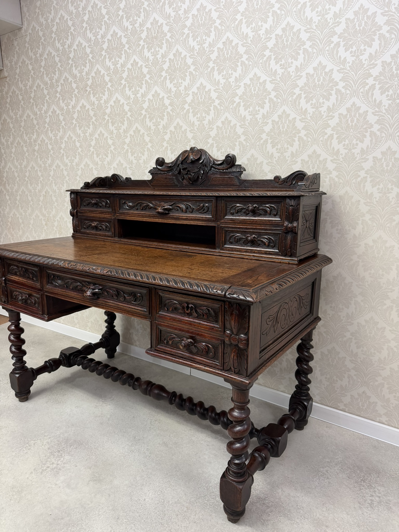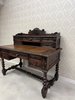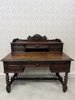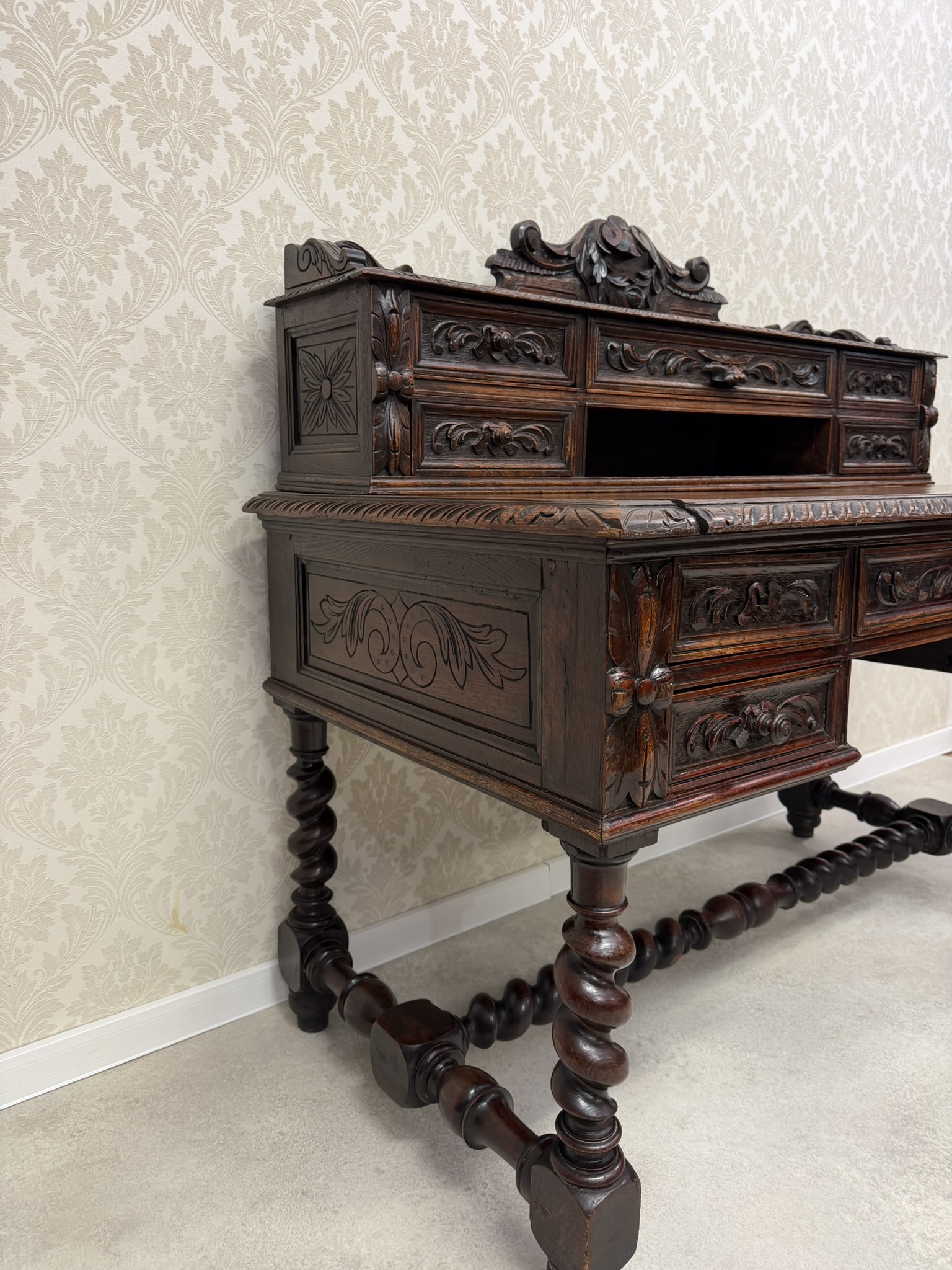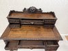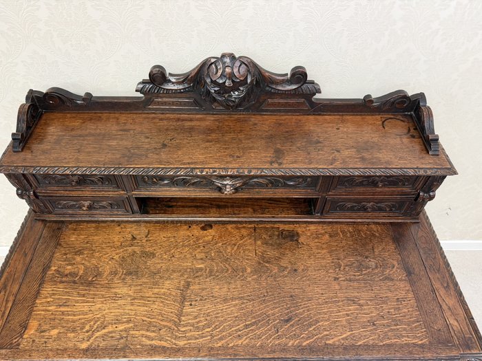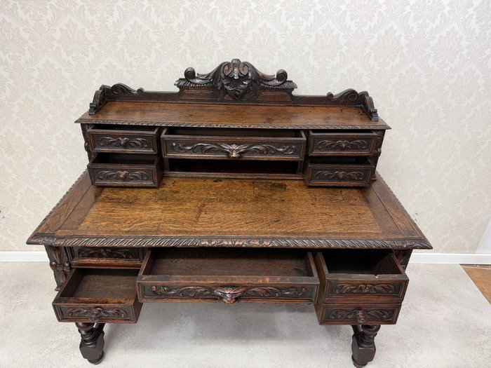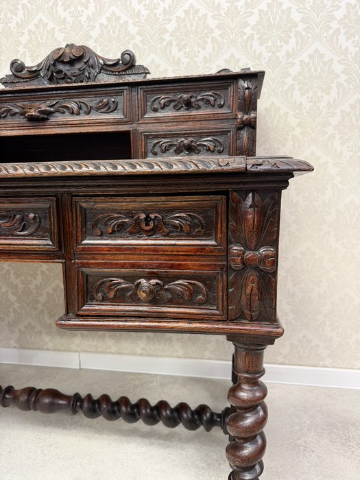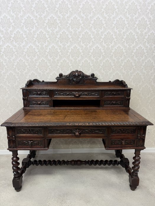 Písací stôl s rezbovaným dekorom s florálnymi motívmi a prepracovanými detailmi. Dominantou je vyvýšená zadná časť s reliéfom akantových listov a množstvom malých zásuviek po stranách aj uprostred. Rámovanie dosky stola je zdobené rezbou s motívom točeného ornamentu. Nohy stola sú prepojené priečkou.1 035,6 €