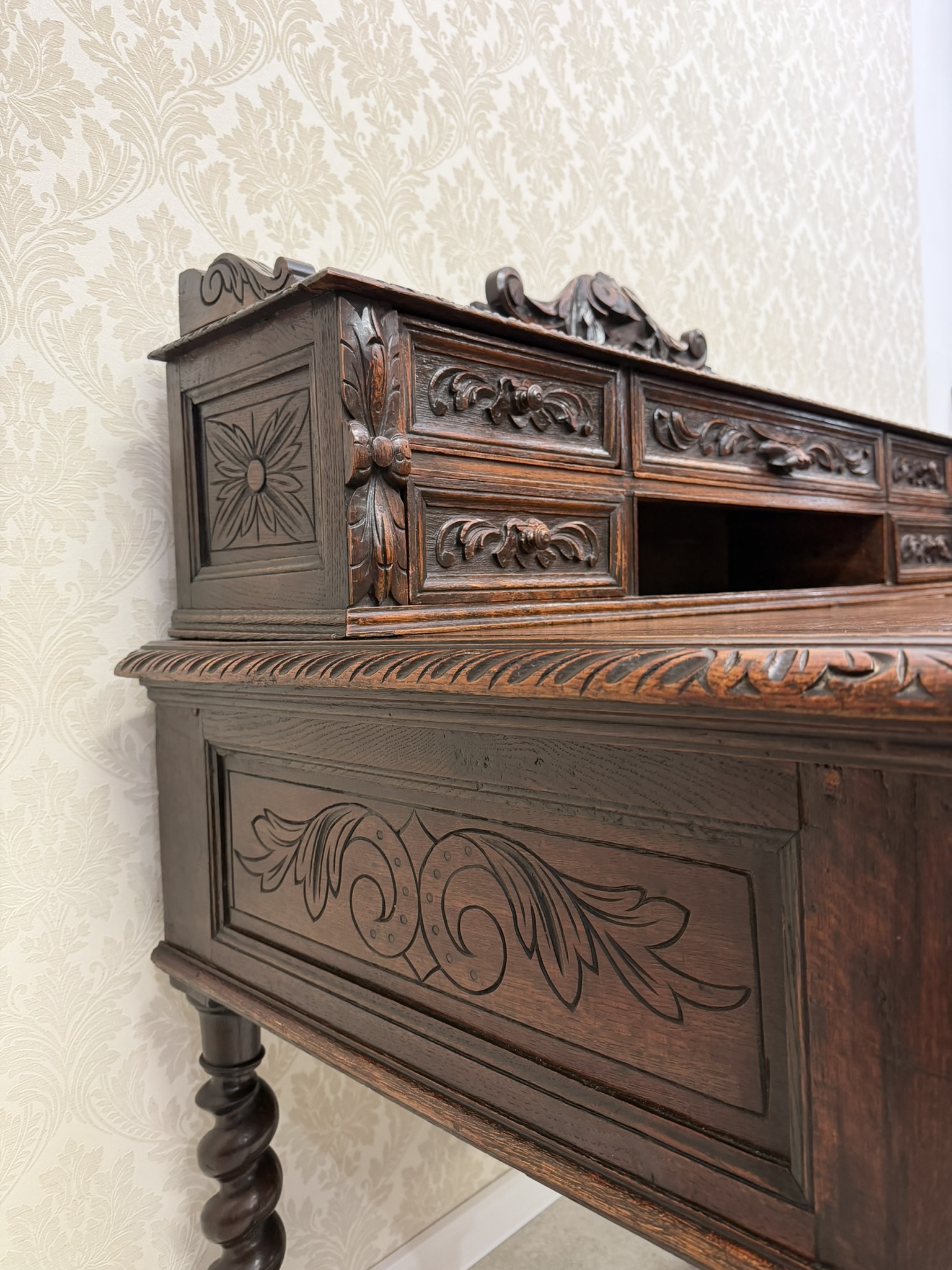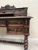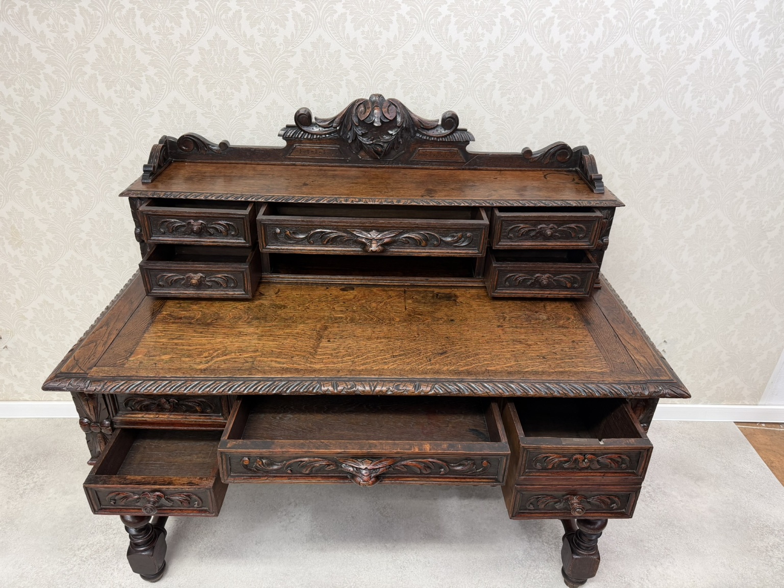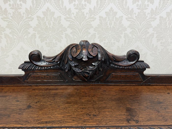 Písací stôl s rezbovaným dekorom s florálnymi motívmi a prepracovanými detailmi. Dominantou je vyvýšená zadná časť s reliéfom akantových listov a množstvom malých zásuviek po stranách aj uprostred. Rámovanie dosky stola je zdobené rezbou s motívom točeného ornamentu. Nohy stola sú prepojené priečkou.1 035,6 €
