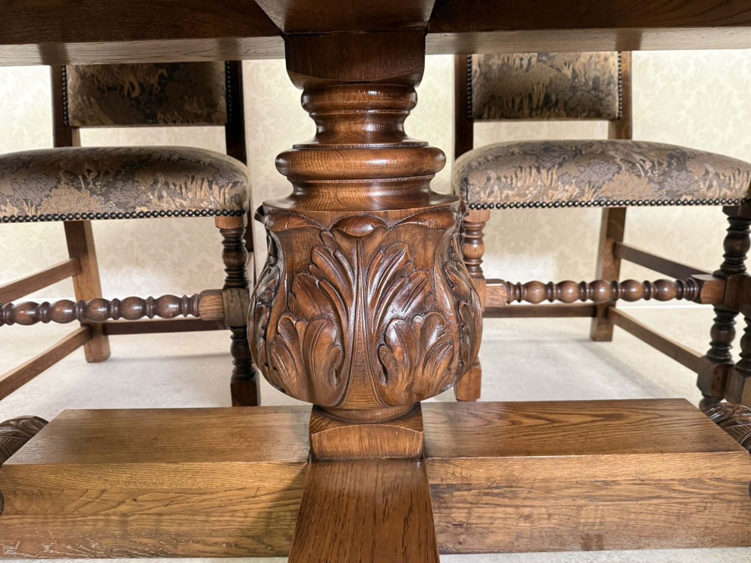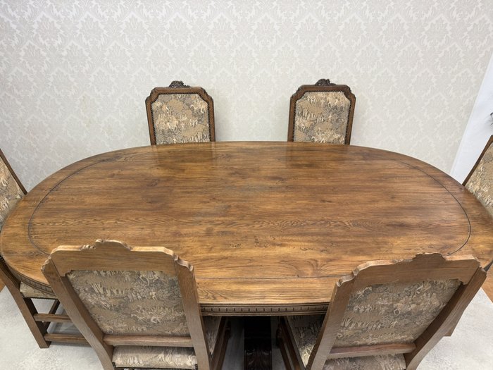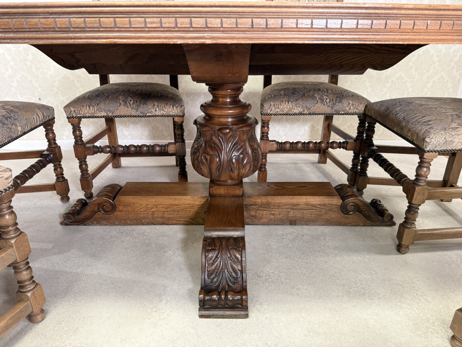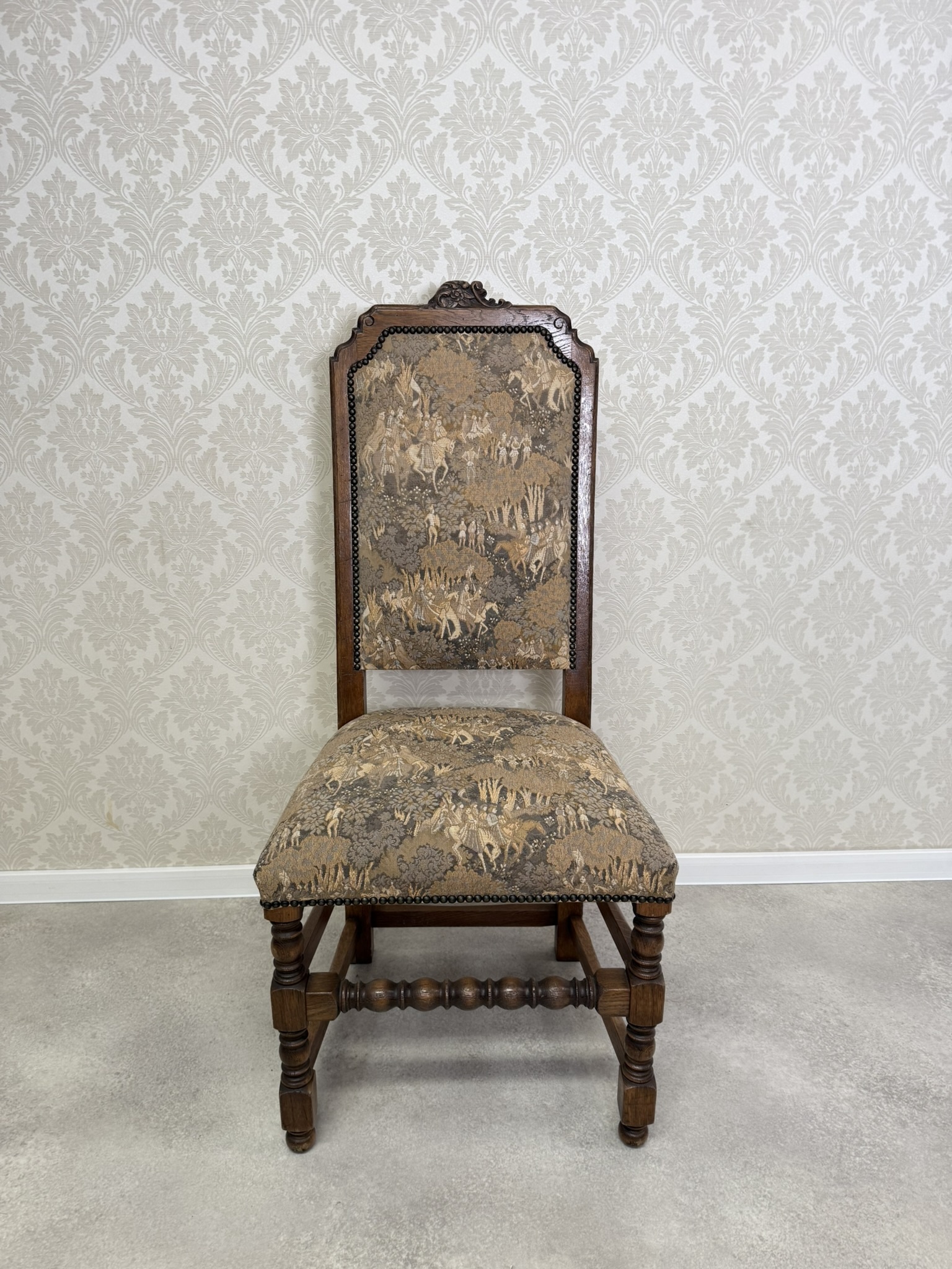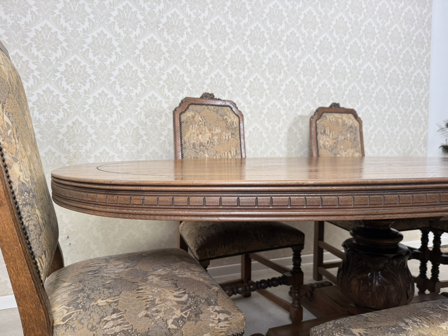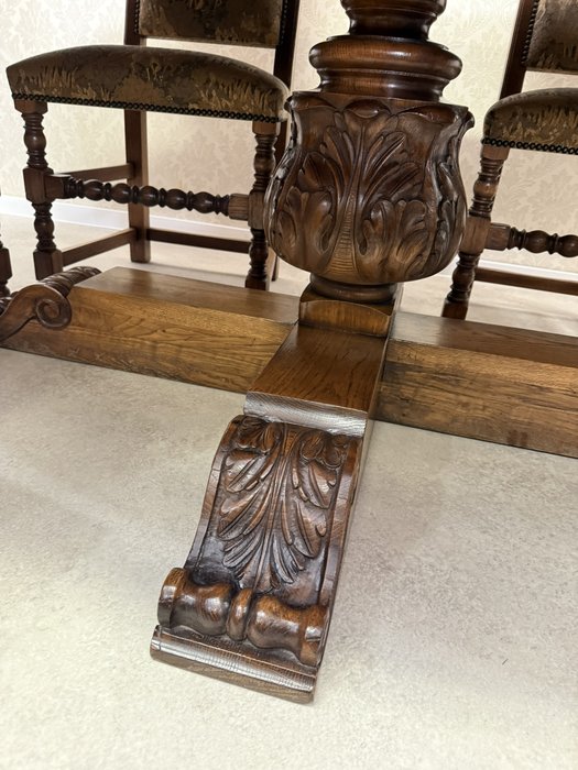 Jedálenská súprava pozostávajúca z veľkého oválneho stola a 6 čalúnených stoličiek s vysokými operadlami. Stôl s výraznou centrálnou nohou s bohatou rezbou akantových listov a pevnou krížovou základňou. Stoličky majú dekoratívne tvarované operadlá a čalúnenie s figurálnymi a poľovníckymi motívmi.982,8 €