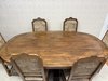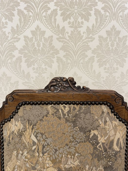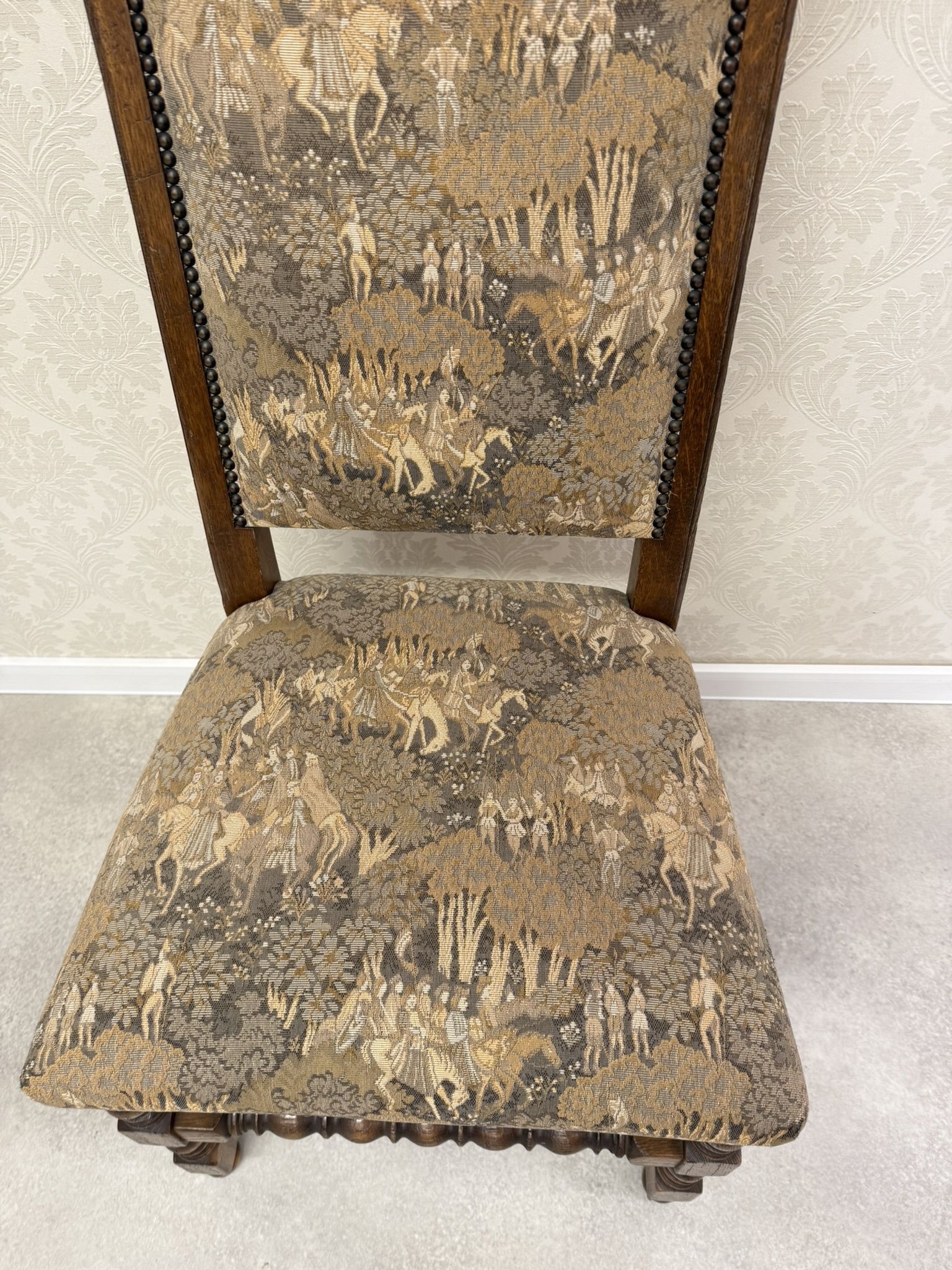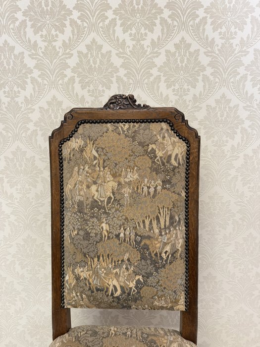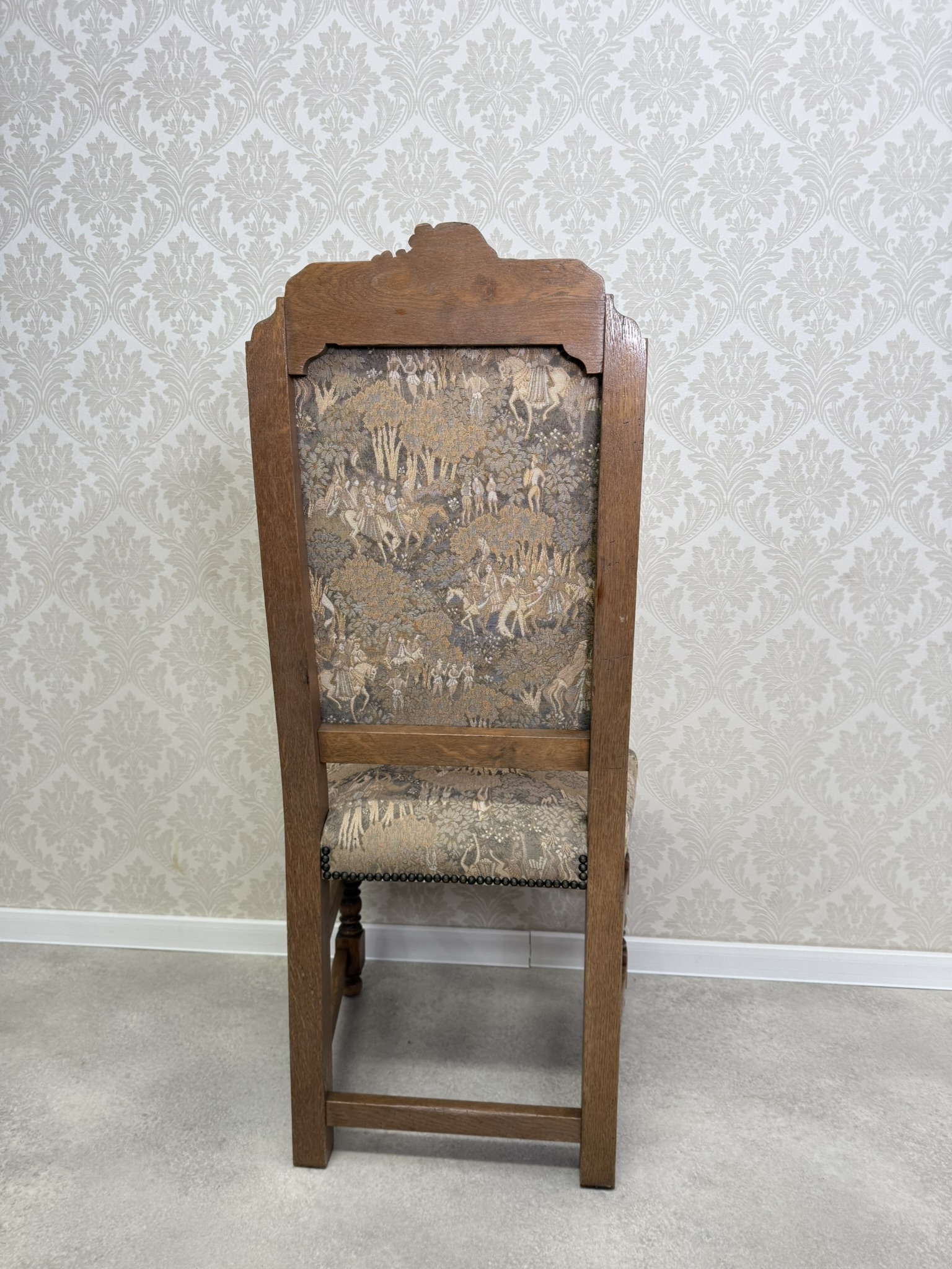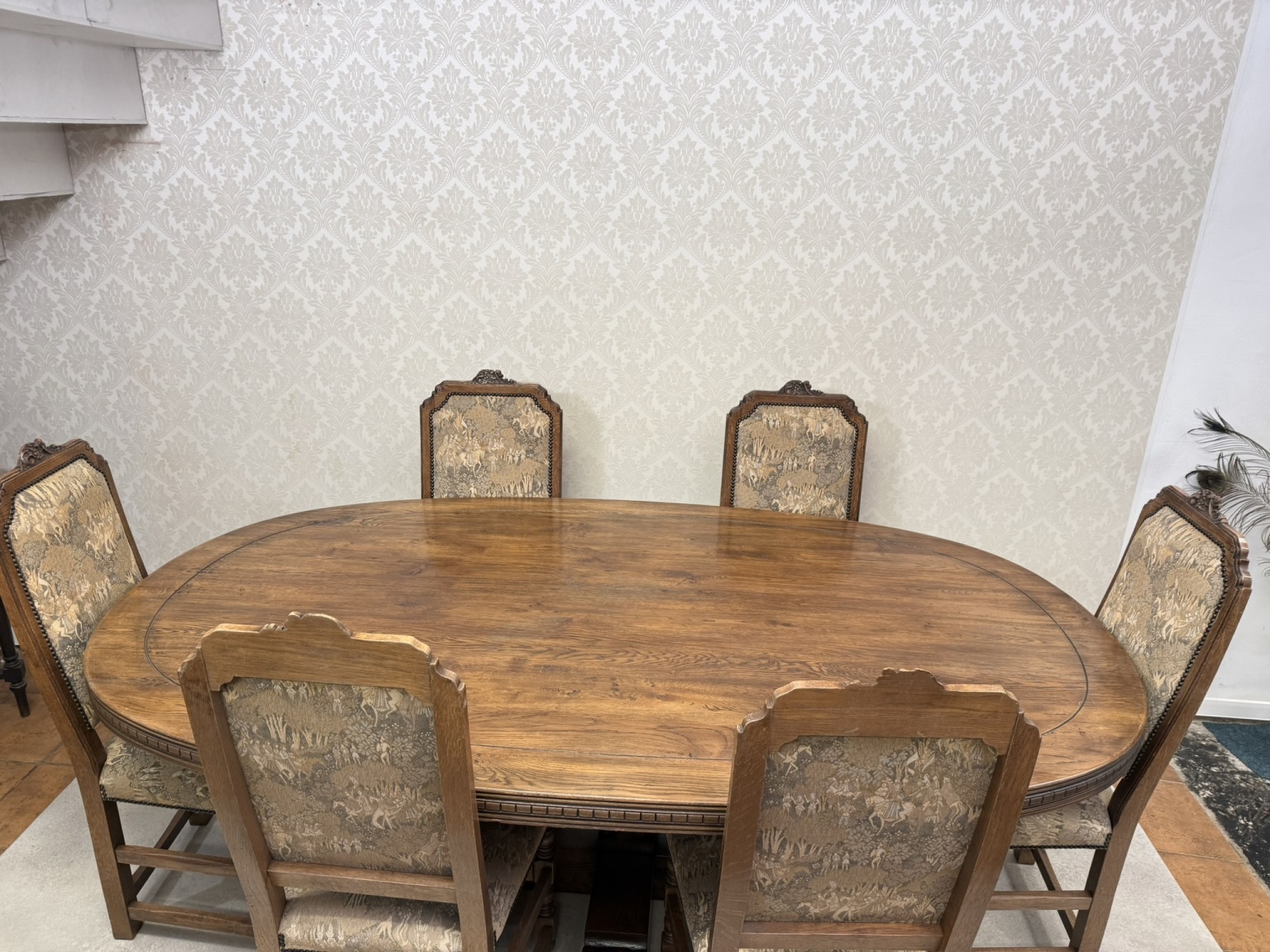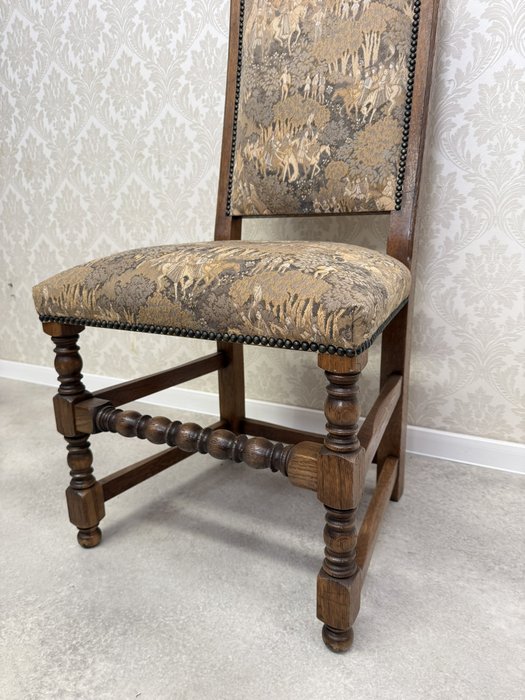 Jedálenská súprava pozostávajúca z veľkého oválneho stola a 6 čalúnených stoličiek s vysokými operadlami. Stôl s výraznou centrálnou nohou s bohatou rezbou akantových listov a pevnou krížovou základňou. Stoličky majú dekoratívne tvarované operadlá a čalúnenie s figurálnymi a poľovníckymi motívmi.982,8 €