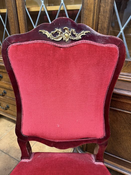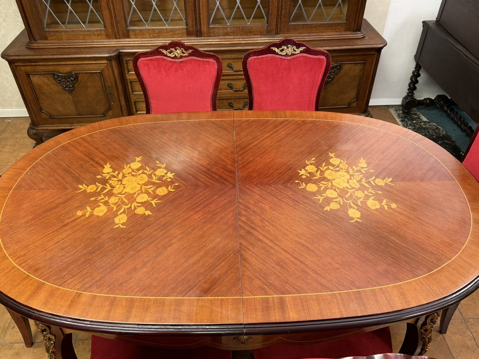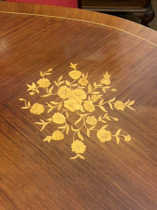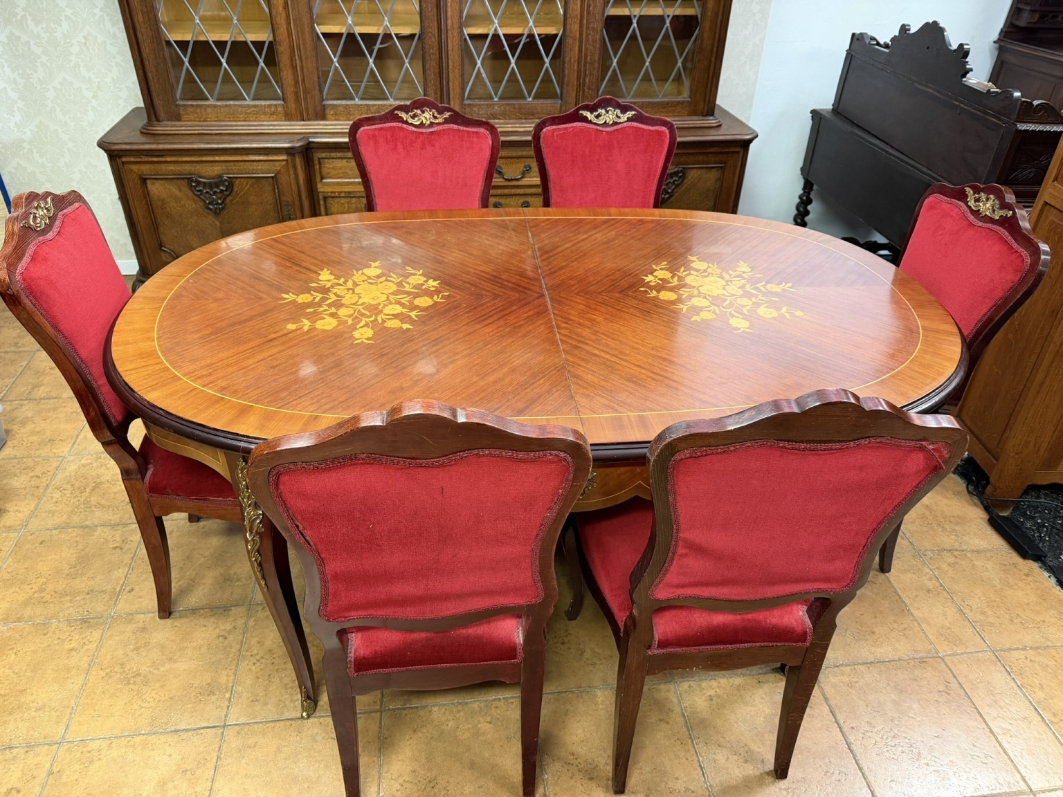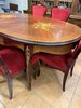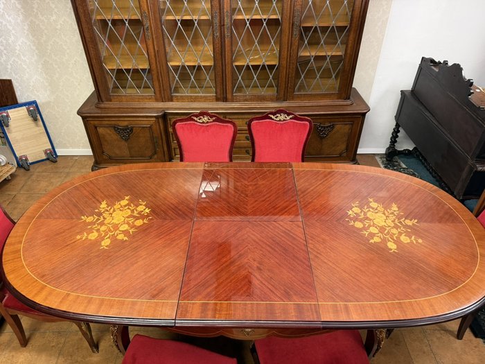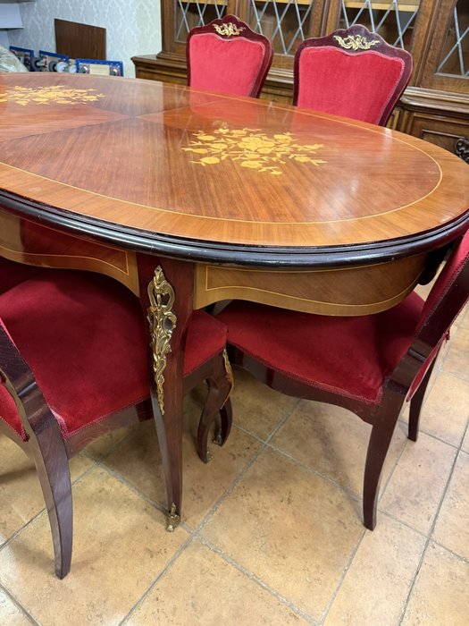 Reprezentatívny jedálenský set zložený z oválneho rozkladacieho stola s kvetinovou intarziou uprostred dosky. Nohy stola sú zdobené dekoratívnymi kovovými aplikáciami v bronzovom tóne s motívom rokajov. Súprava zahŕňa šesť stoličiek s červeným čalúnením a dreveným rámom, ktorých operadlá korunujú dekoračné prvky v zhodnom prevedení. Jedálenský set pôsobí slávnostne a výrazne.1 034,4 €