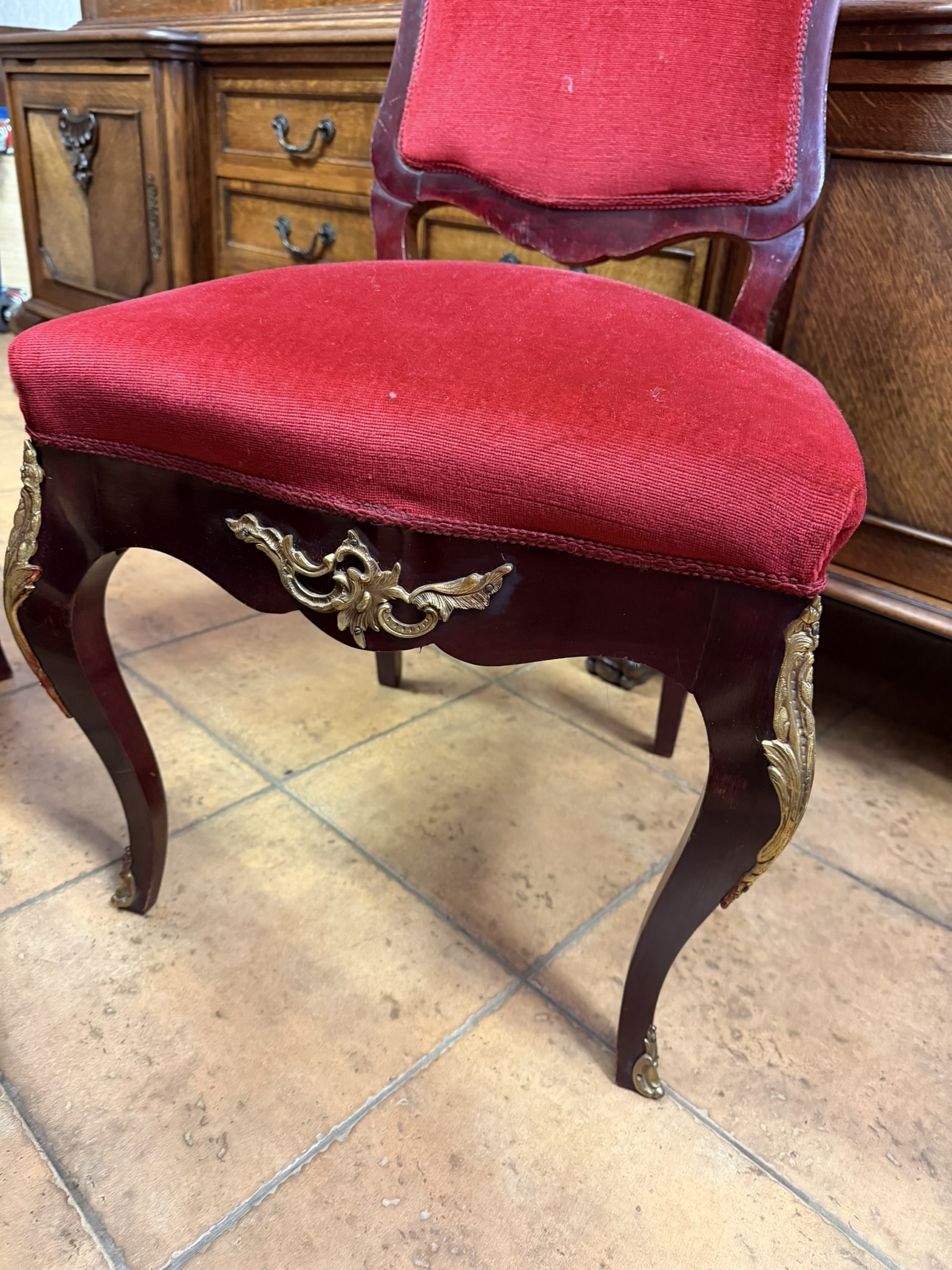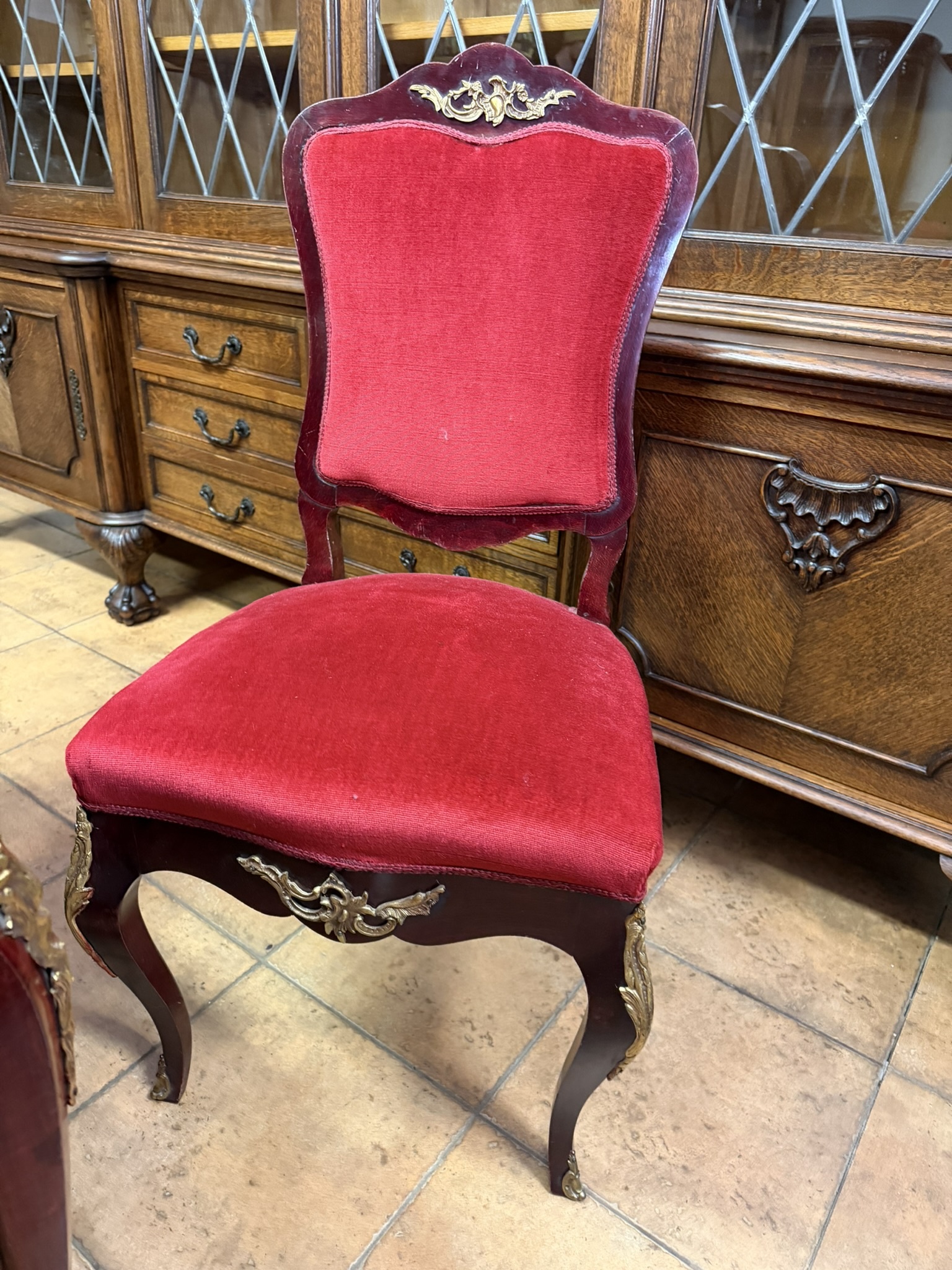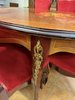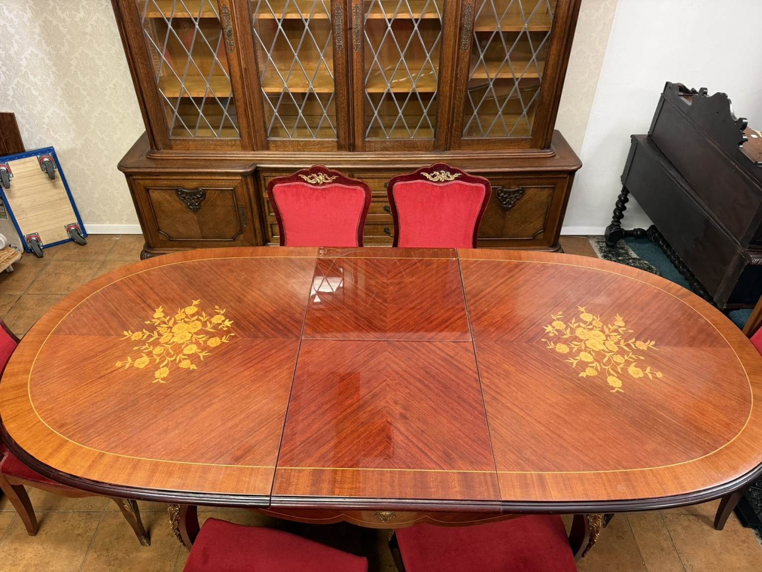 Reprezentatívny jedálenský set zložený z oválneho rozkladacieho stola s kvetinovou intarziou uprostred dosky. Nohy stola sú zdobené dekoratívnymi kovovými aplikáciami v bronzovom tóne s motívom rokajov. Súprava zahŕňa šesť stoličiek s červeným čalúnením a dreveným rámom, ktorých operadlá korunujú dekoračné prvky v zhodnom prevedení. Jedálenský set pôsobí slávnostne a výrazne.1 034,4 €
