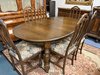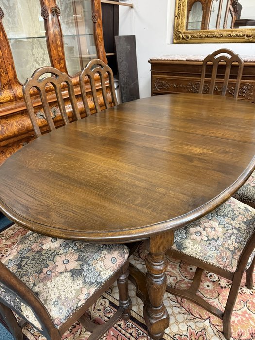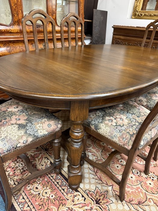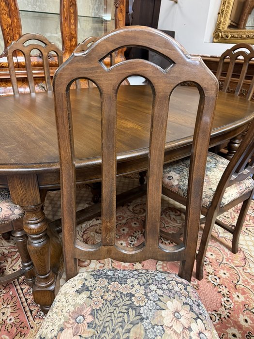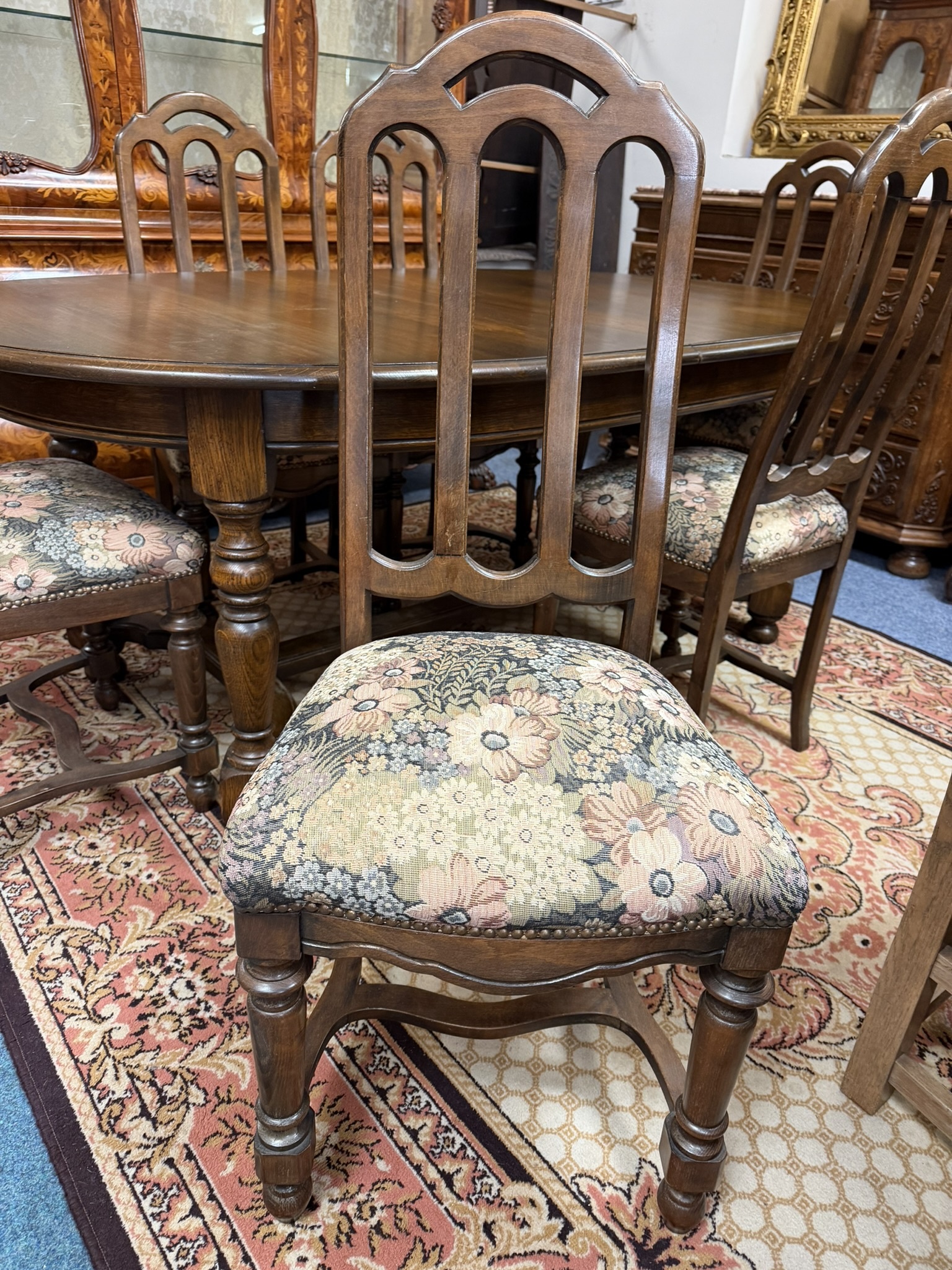 Jedálenský set tvorený rozkladacím oválnym stolom so šiestimi stoličkami s členitými operadlami. Konštrukcia pôsobí elegantne a stoličky sú spevnené pevnými výstuhami. Čalúnenie s kvetinovým motívom dodáva celému setu dekoratívny vzhľad.594 €