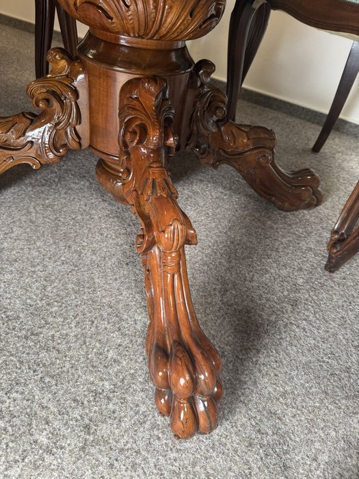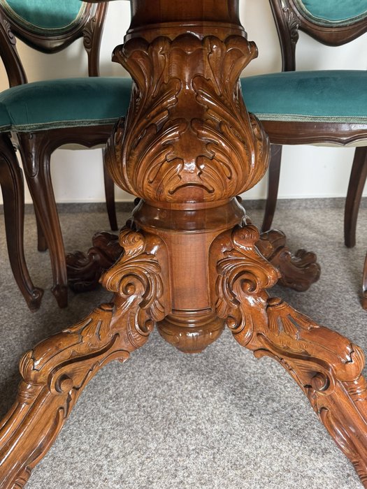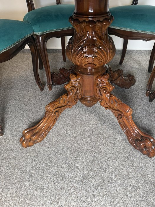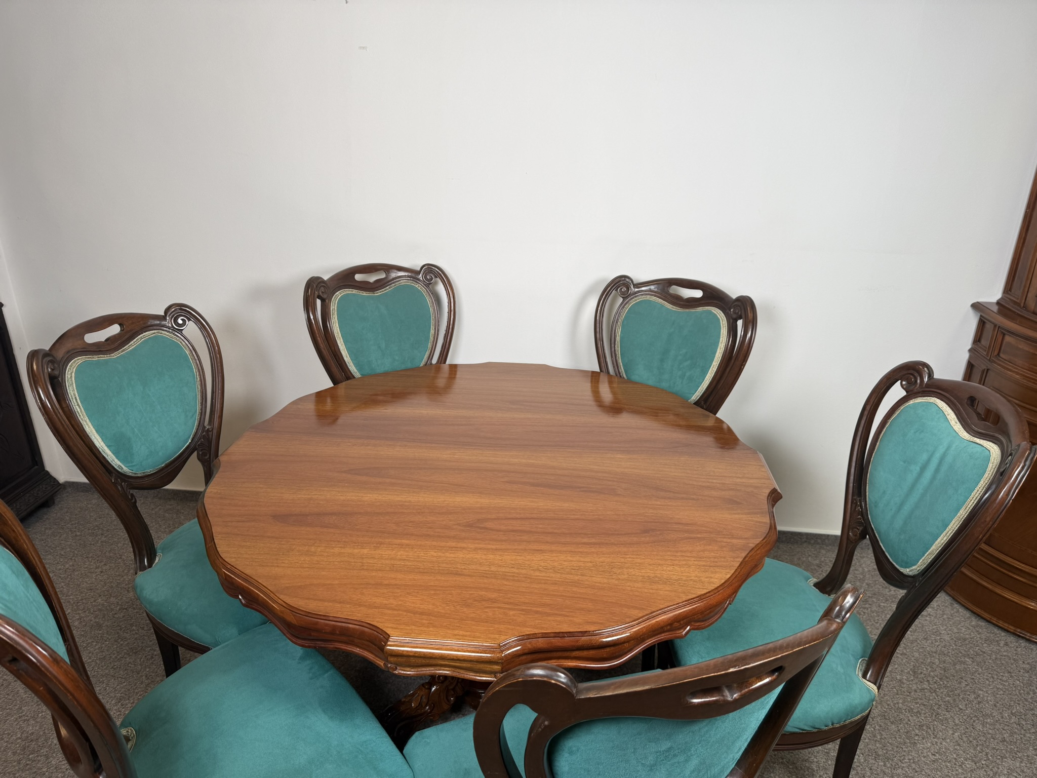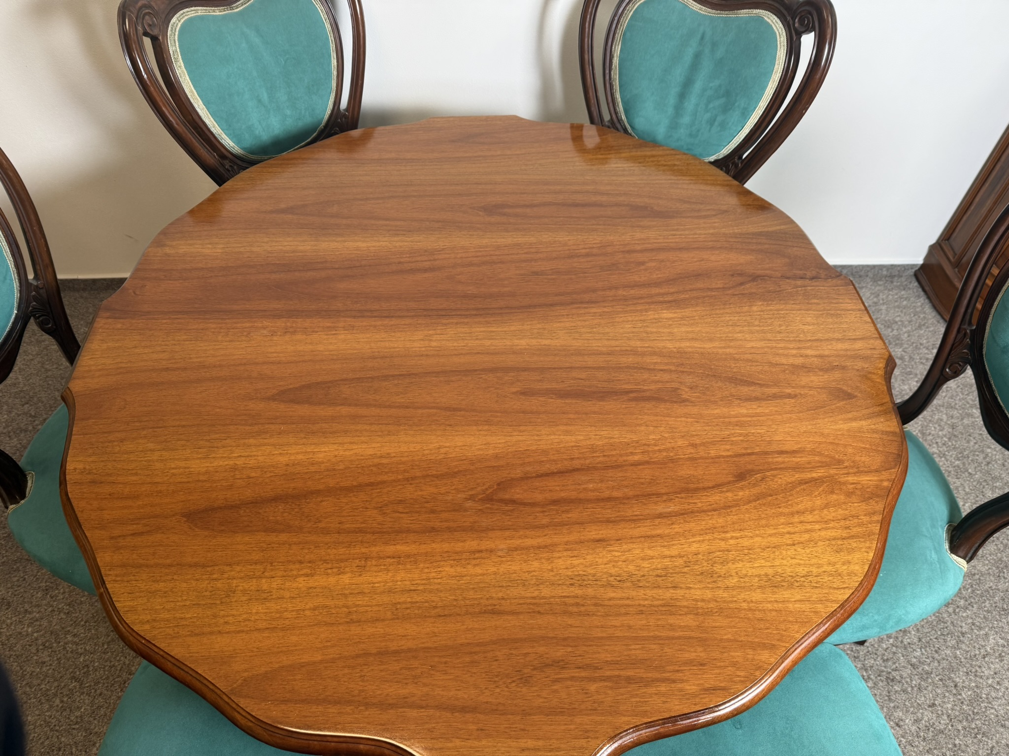 Jedálenská zostava je tvorená okrúhlym, nerozkladacím stolom s profilovanou doskou a šiestimi stoličkami s textilným čalúnením v modrom odtieni. Stôl stojí na výraznej centrálnej nohe s bohatou rezbou a štvorramenným podnožím. Stoličky majú tvarované operadlá s prierezom a volutami.