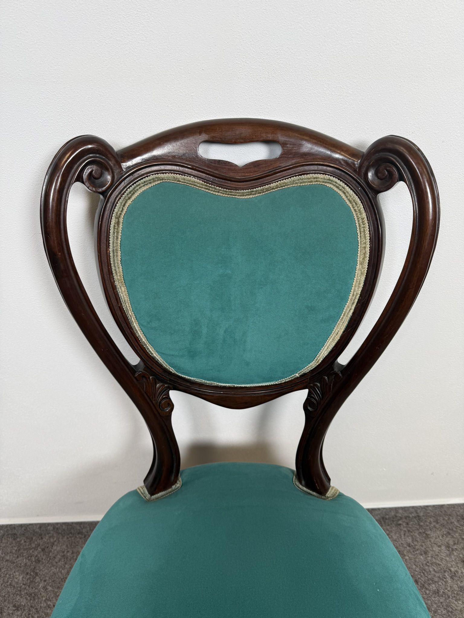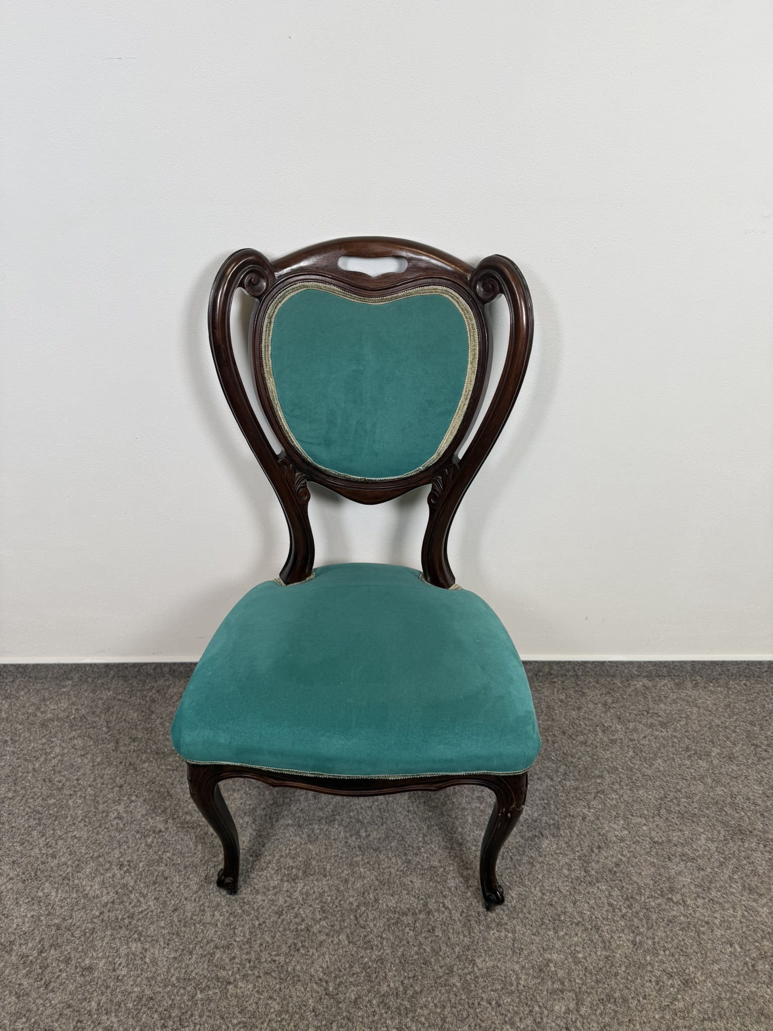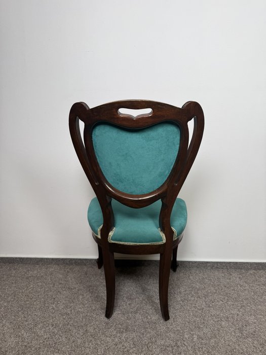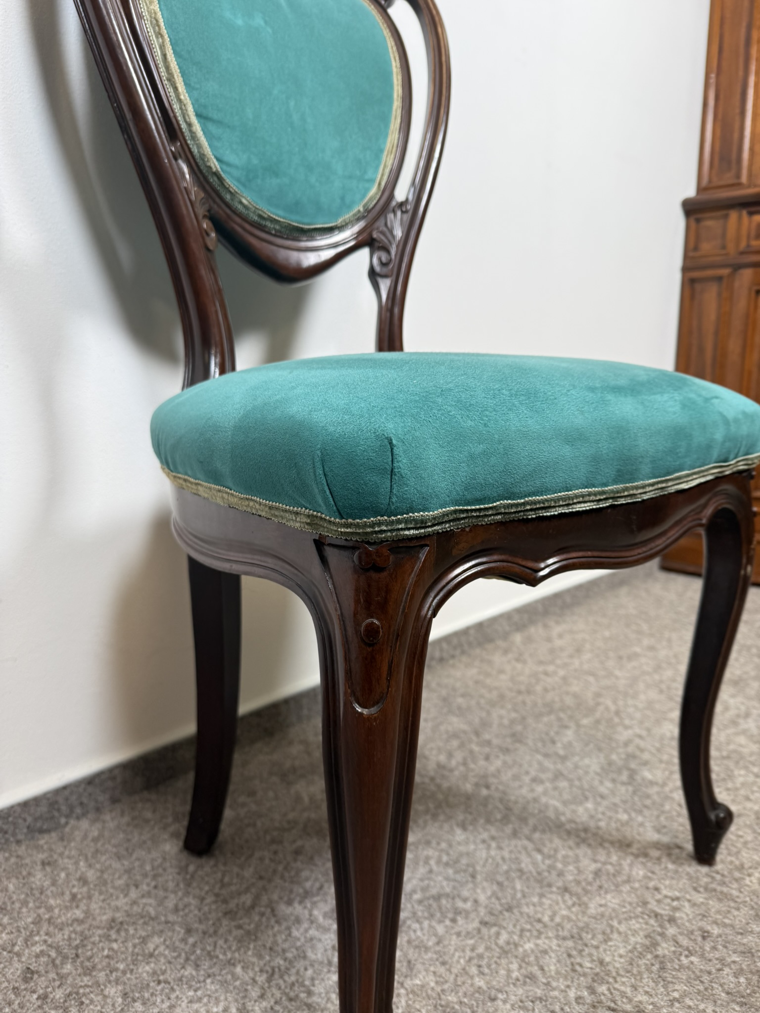 Jedálenská zostava je tvorená okrúhlym, nerozkladacím stolom s profilovanou doskou a šiestimi stoličkami s textilným čalúnením v modrom odtieni. Stôl stojí na výraznej centrálnej nohe s bohatou rezbou a štvorramenným podnožím. Stoličky majú tvarované operadlá s prierezom a volutami.