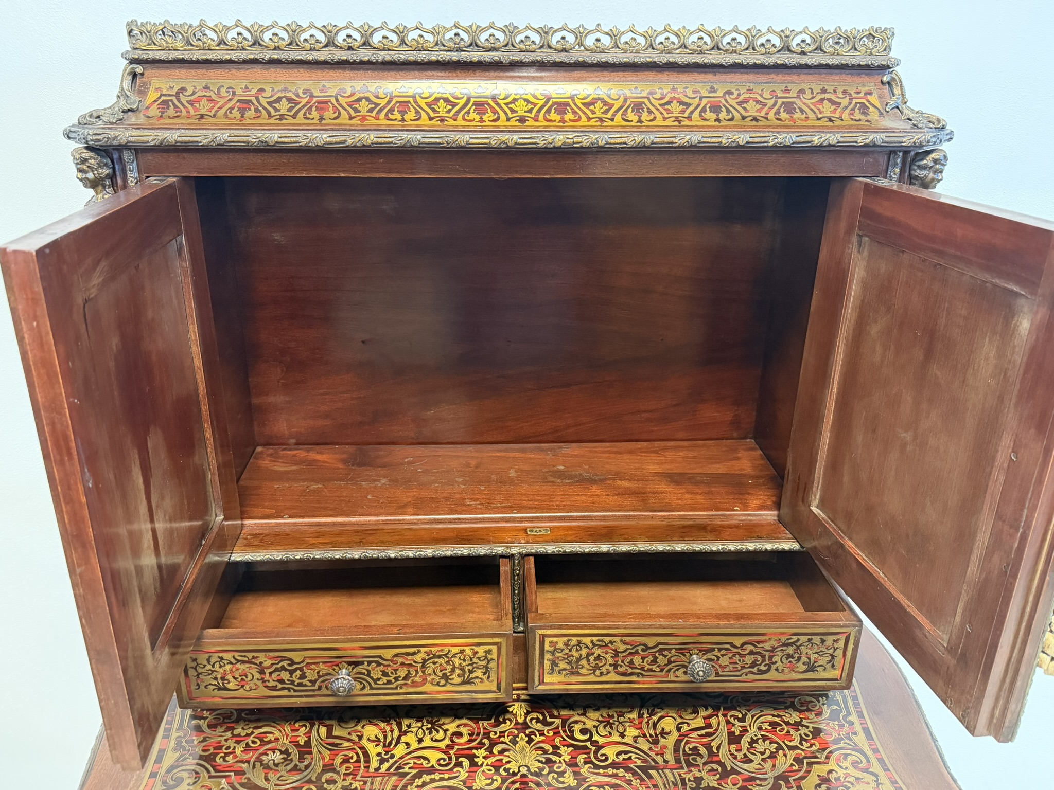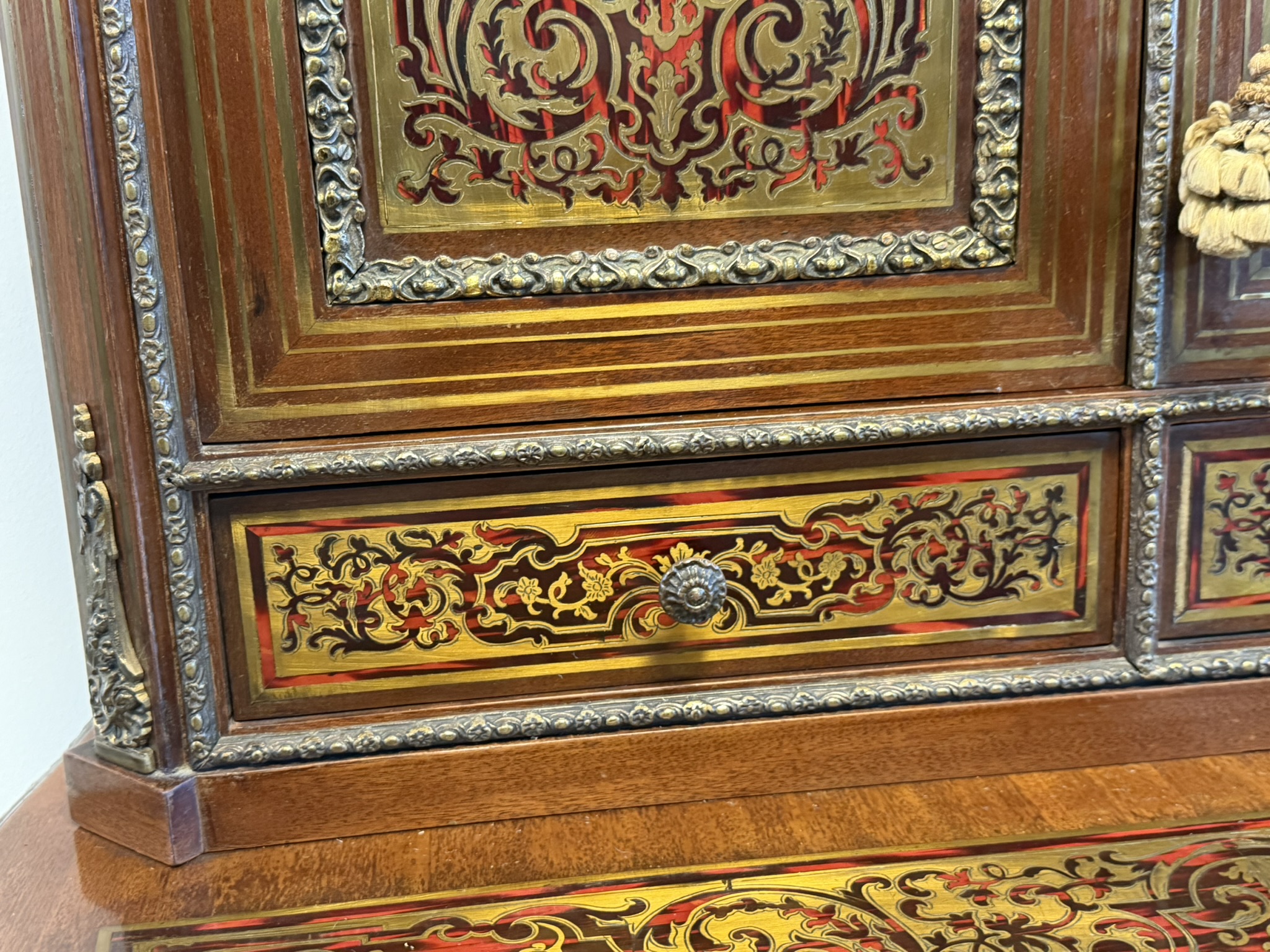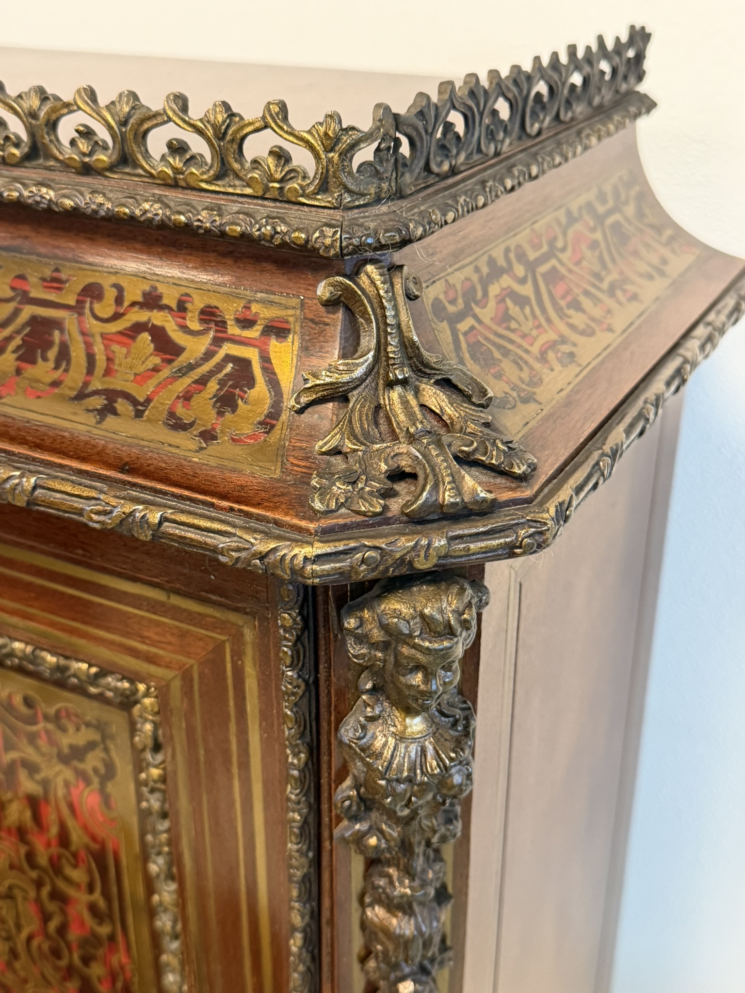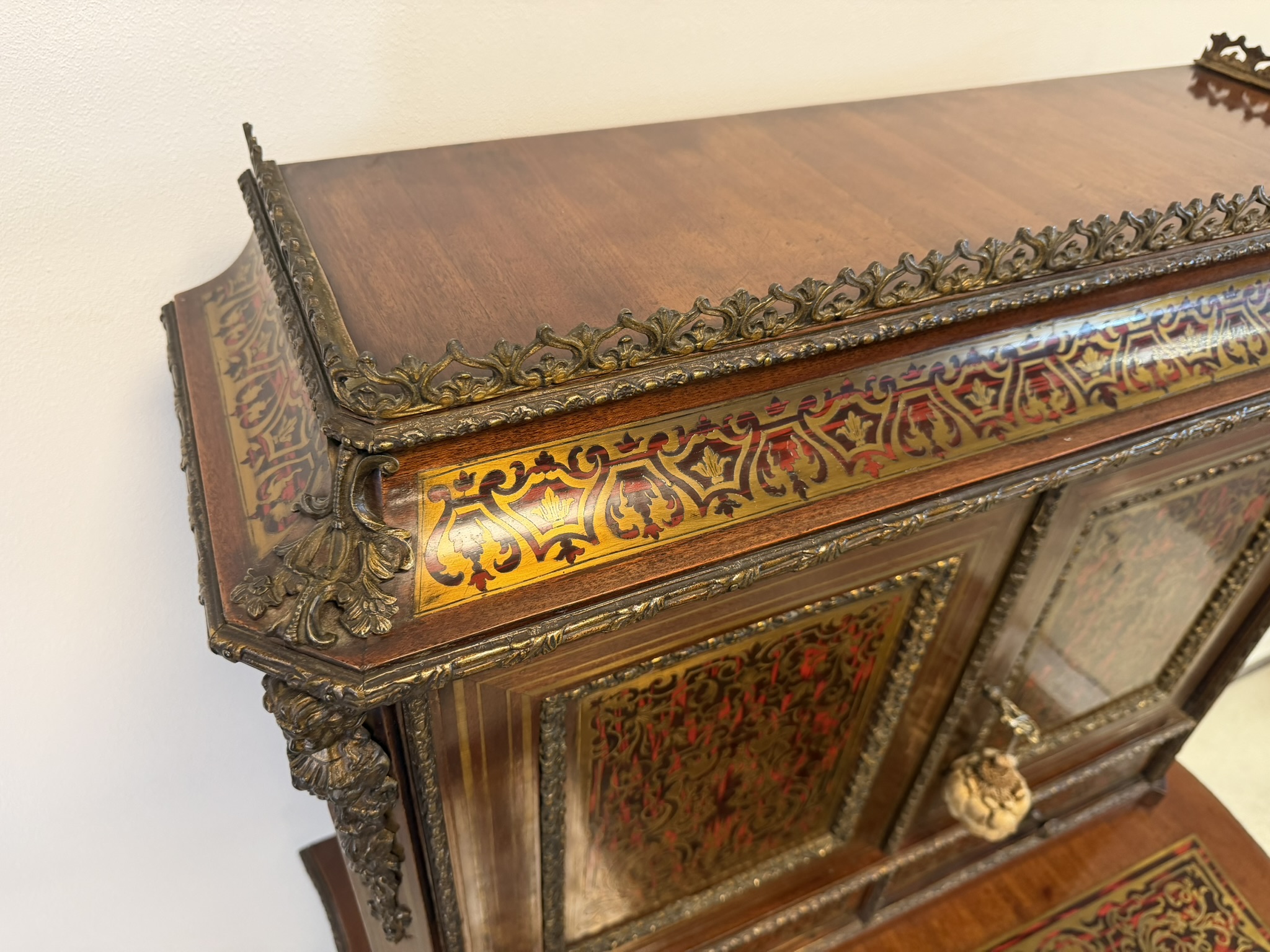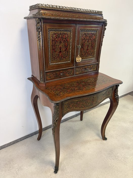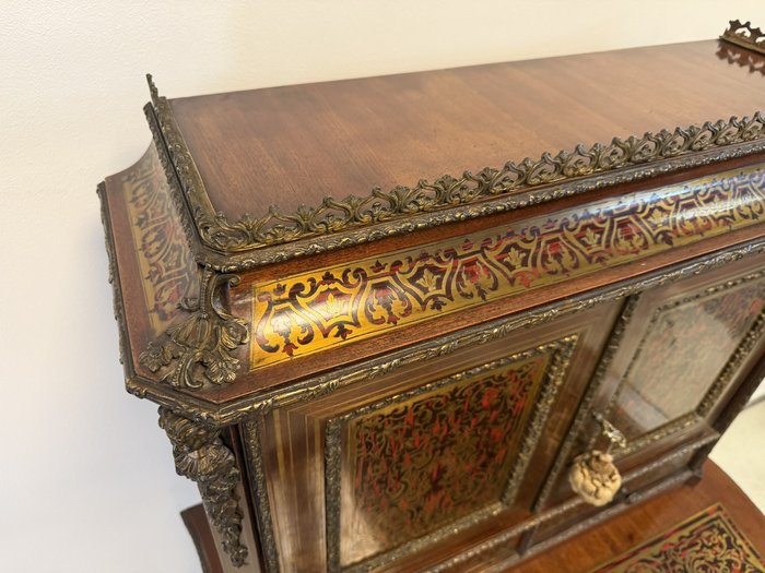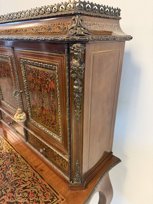 Reprezentatívny kabinet s bohatou mosadznou intarziou typu boulle na dvierkach, zásuvke a hornej časti, podloženú červeným podkladom. Trojrozmerné dekoratívne aplikácie z bronzu – vrátane maskarónov, rohových ozdôb a kovového zábradlia – podčiarkujú slávnostný výraz.1 558,4 €