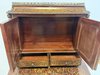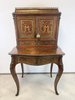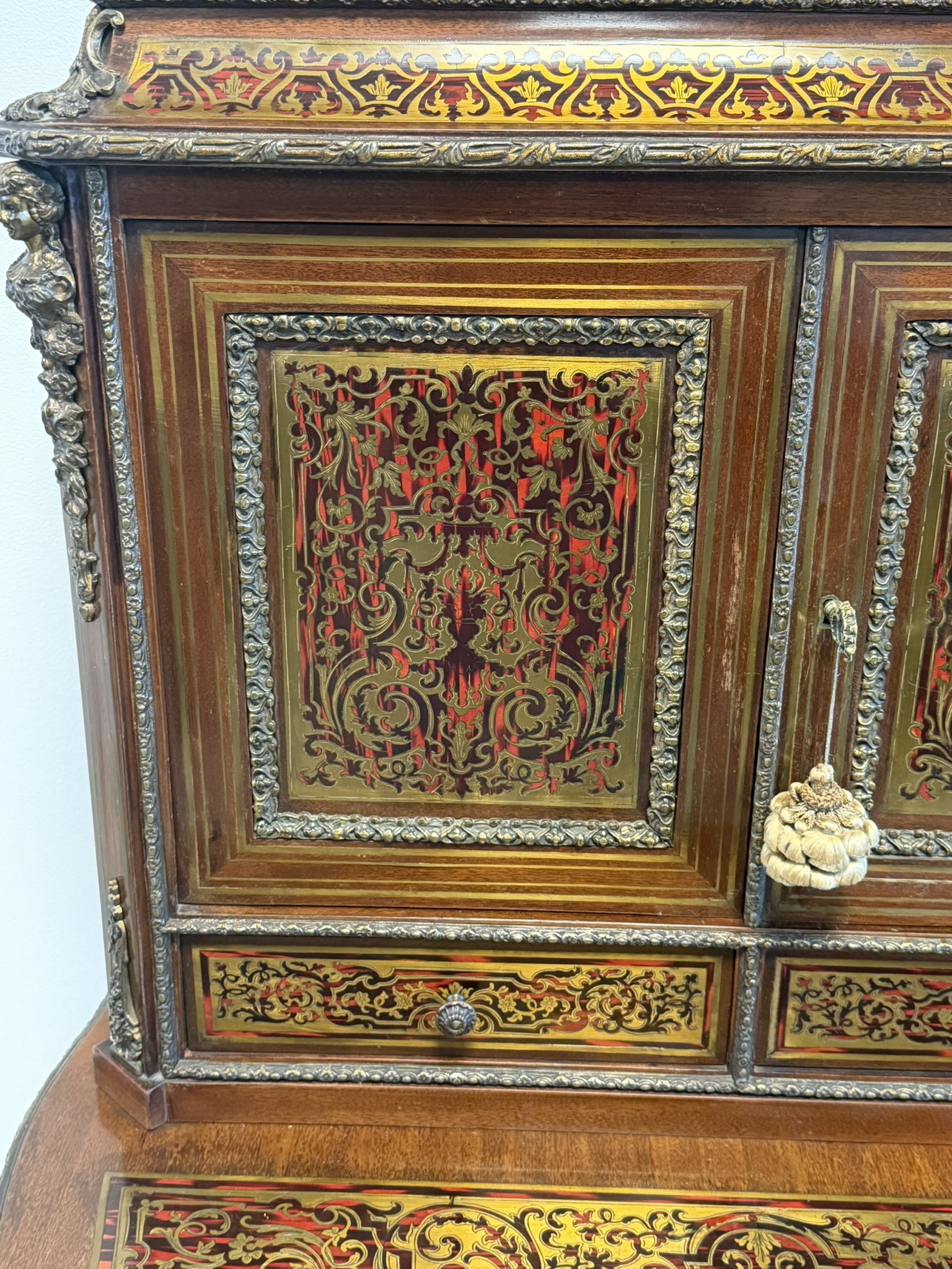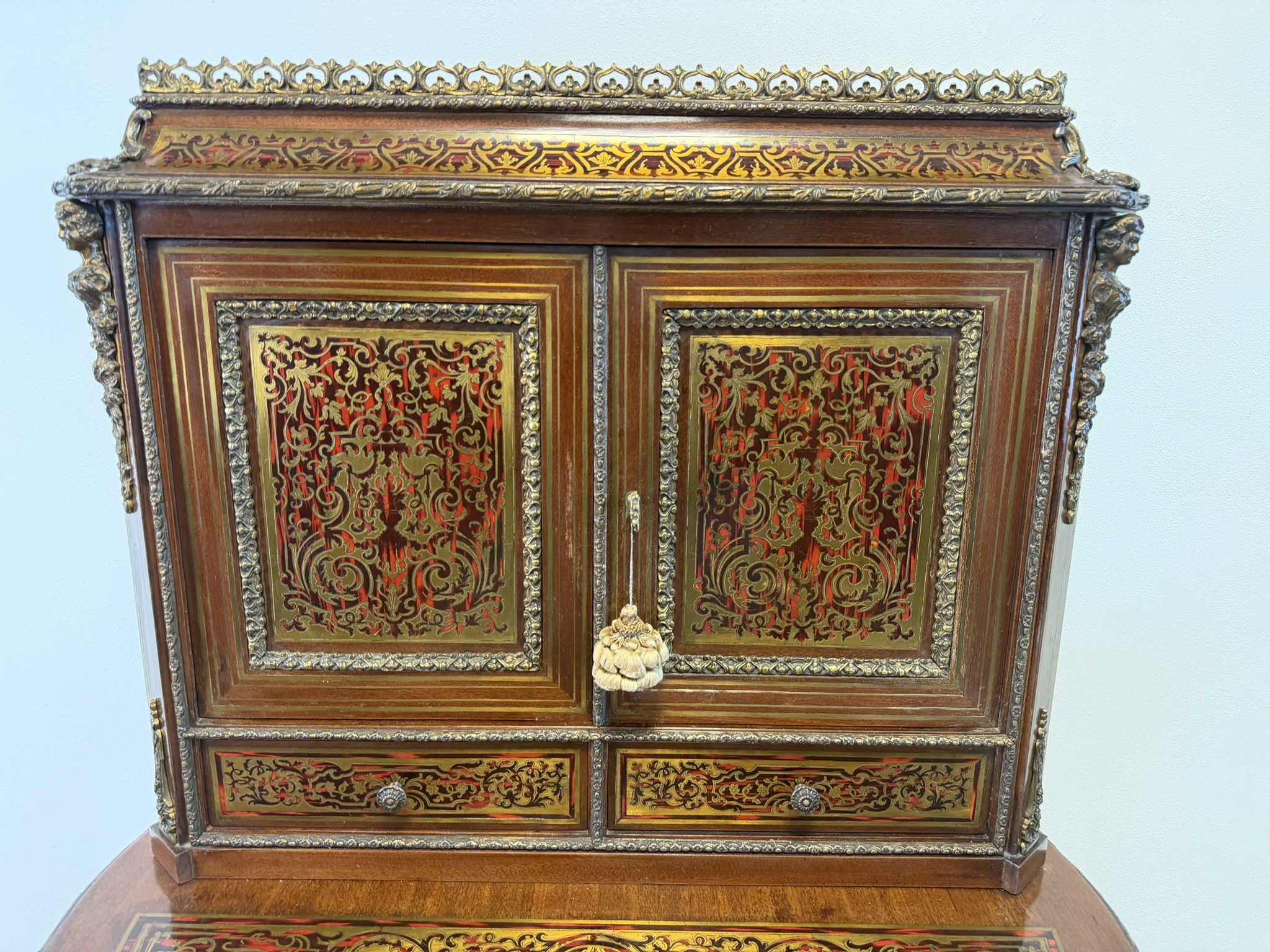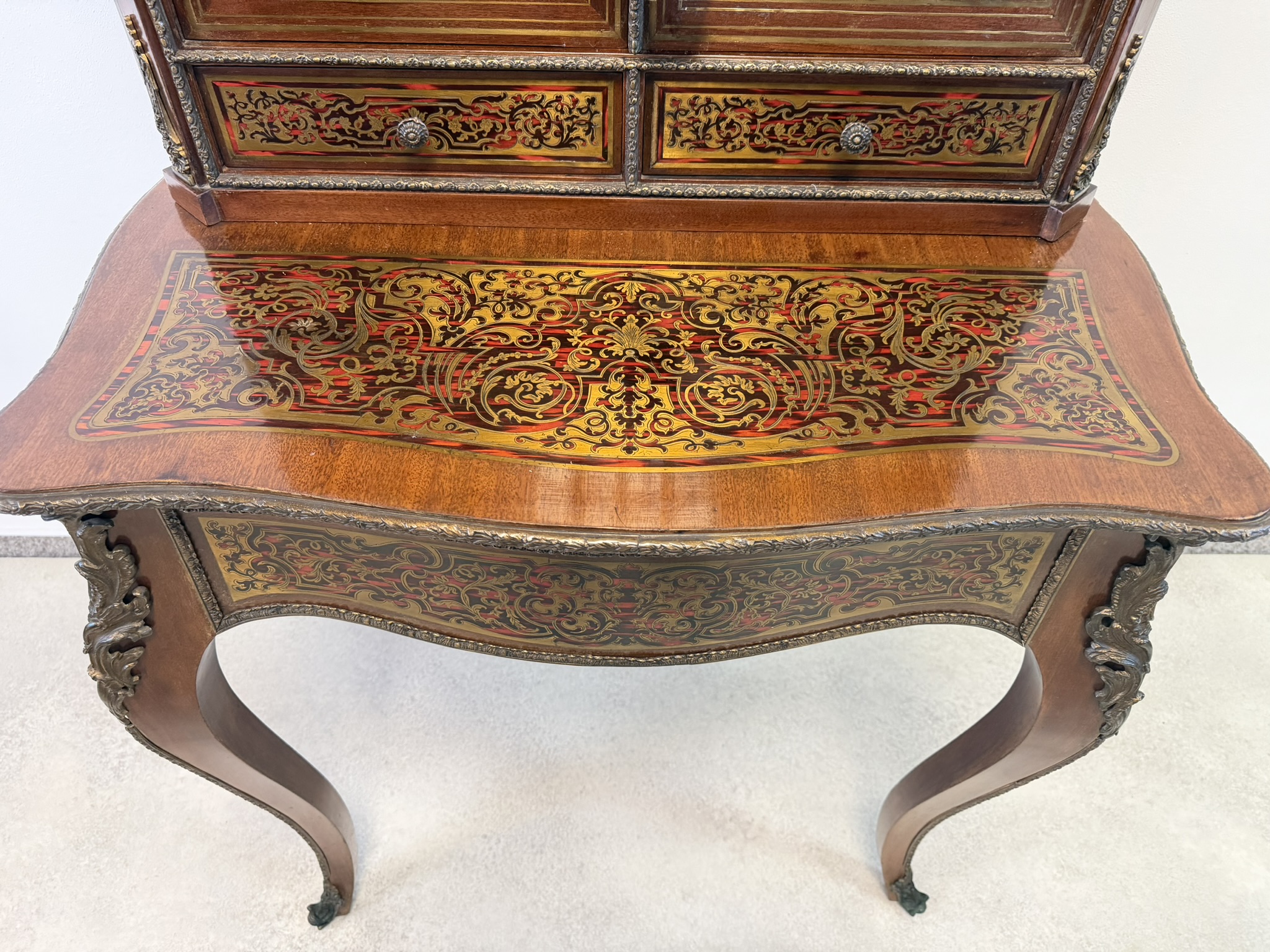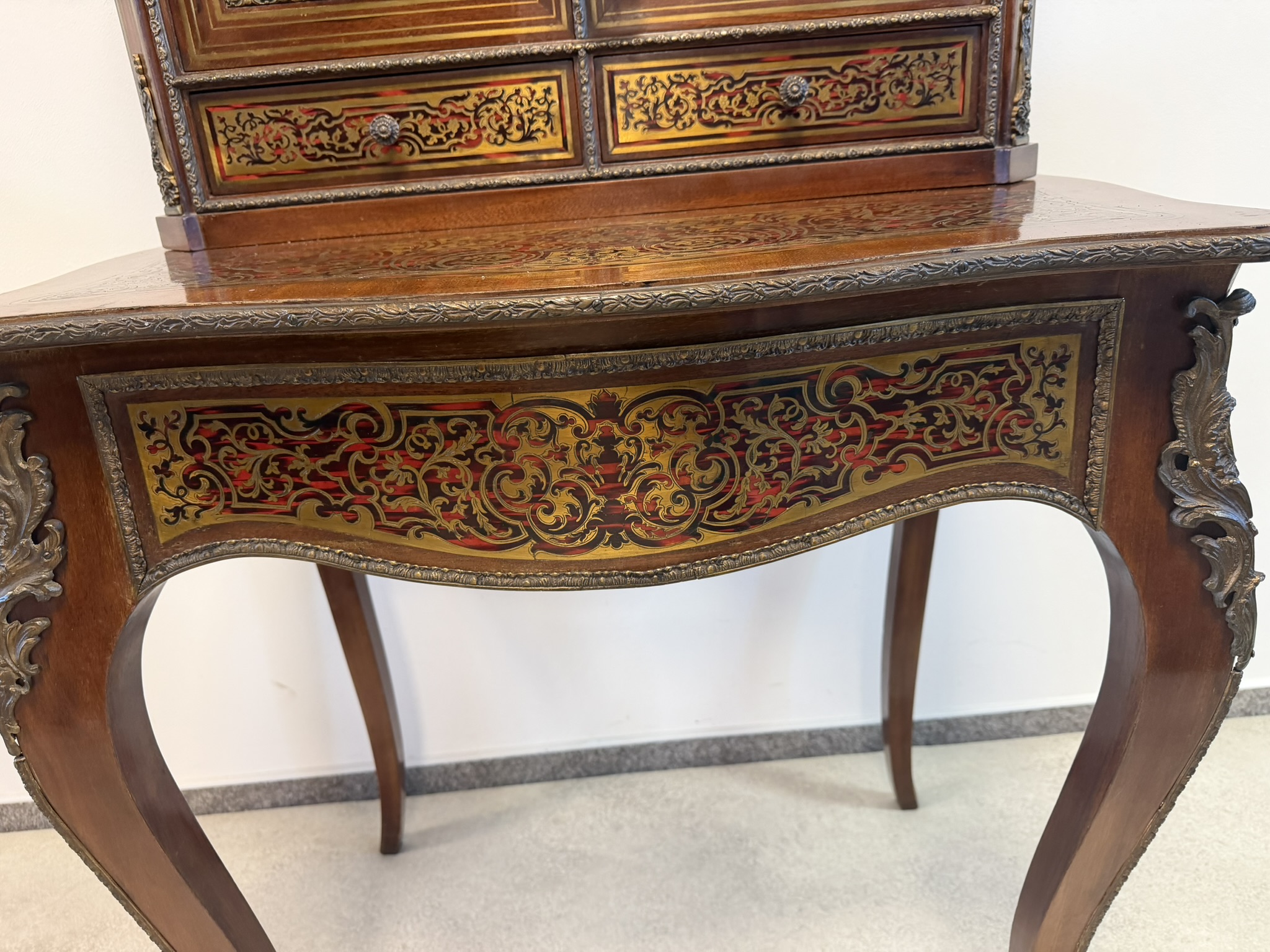 Reprezentatívny kabinet s bohatou mosadznou intarziou typu boulle na dvierkach, zásuvke a hornej časti, podloženú červeným podkladom. Trojrozmerné dekoratívne aplikácie z bronzu – vrátane maskarónov, rohových ozdôb a kovového zábradlia – podčiarkujú slávnostný výraz.1 558,4 €