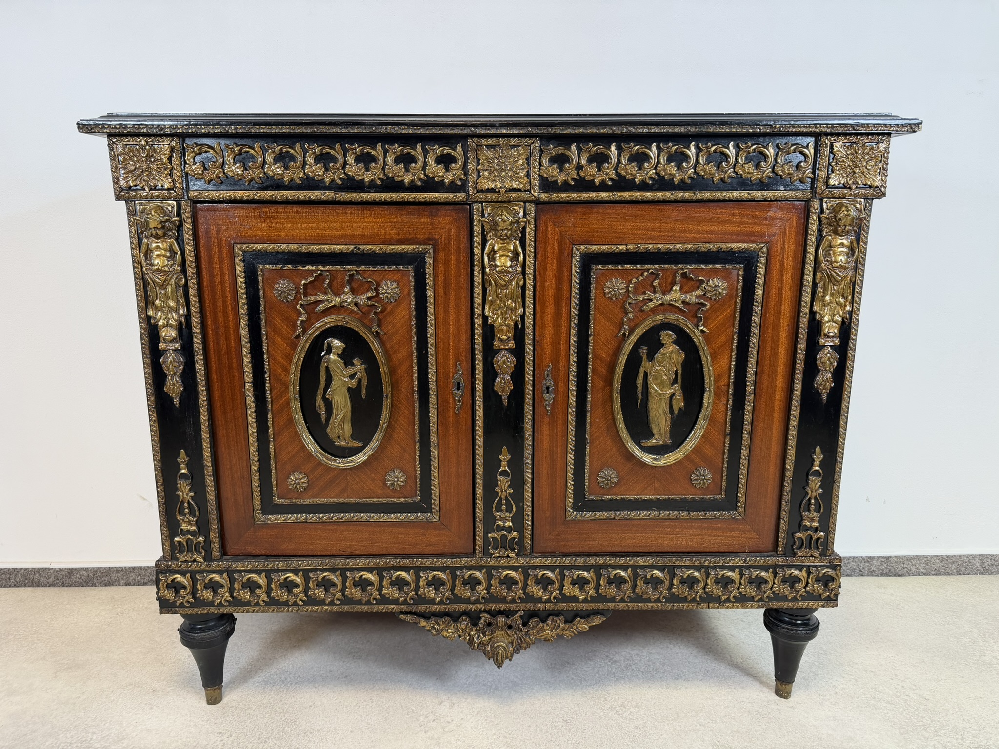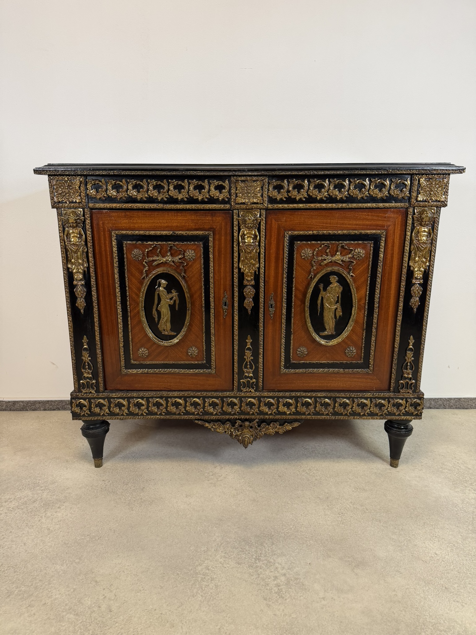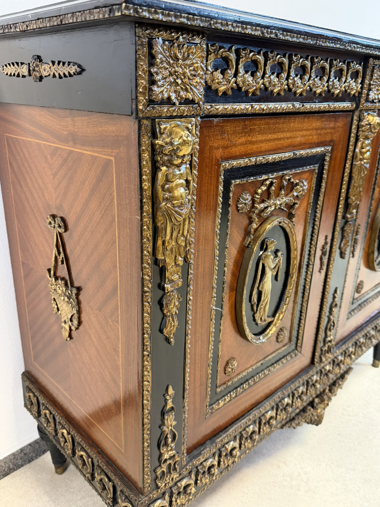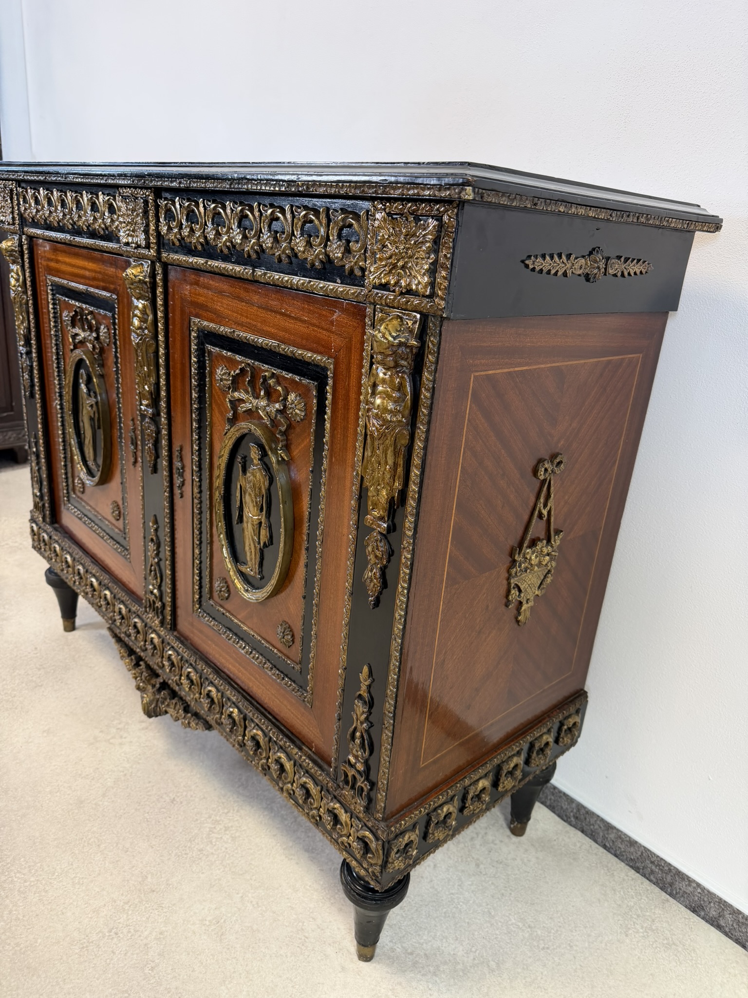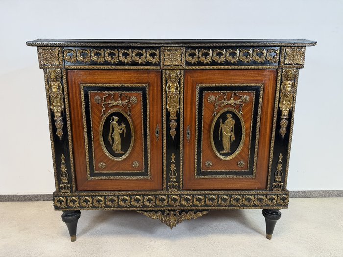 Elegantná komoda, pochádzajúca z Francúzska, zaujme bohatou výzdobou a kvalitným remeselným spracovaním. Korpus je dyhovaný ušľachtilým drevom s výraznou kresbou, doplnený kontrastnými čierno morenými prvkami. Čelá dverí zdobia medailóny s figurálnymi motívmi, inšpirovanými antikou, typickými pre francúzsky neoklasicizmus. Bohaté bronzové aplikácie, girlandy a ornamentálne pásy podčiarkujú luxusný charakter nábytku.