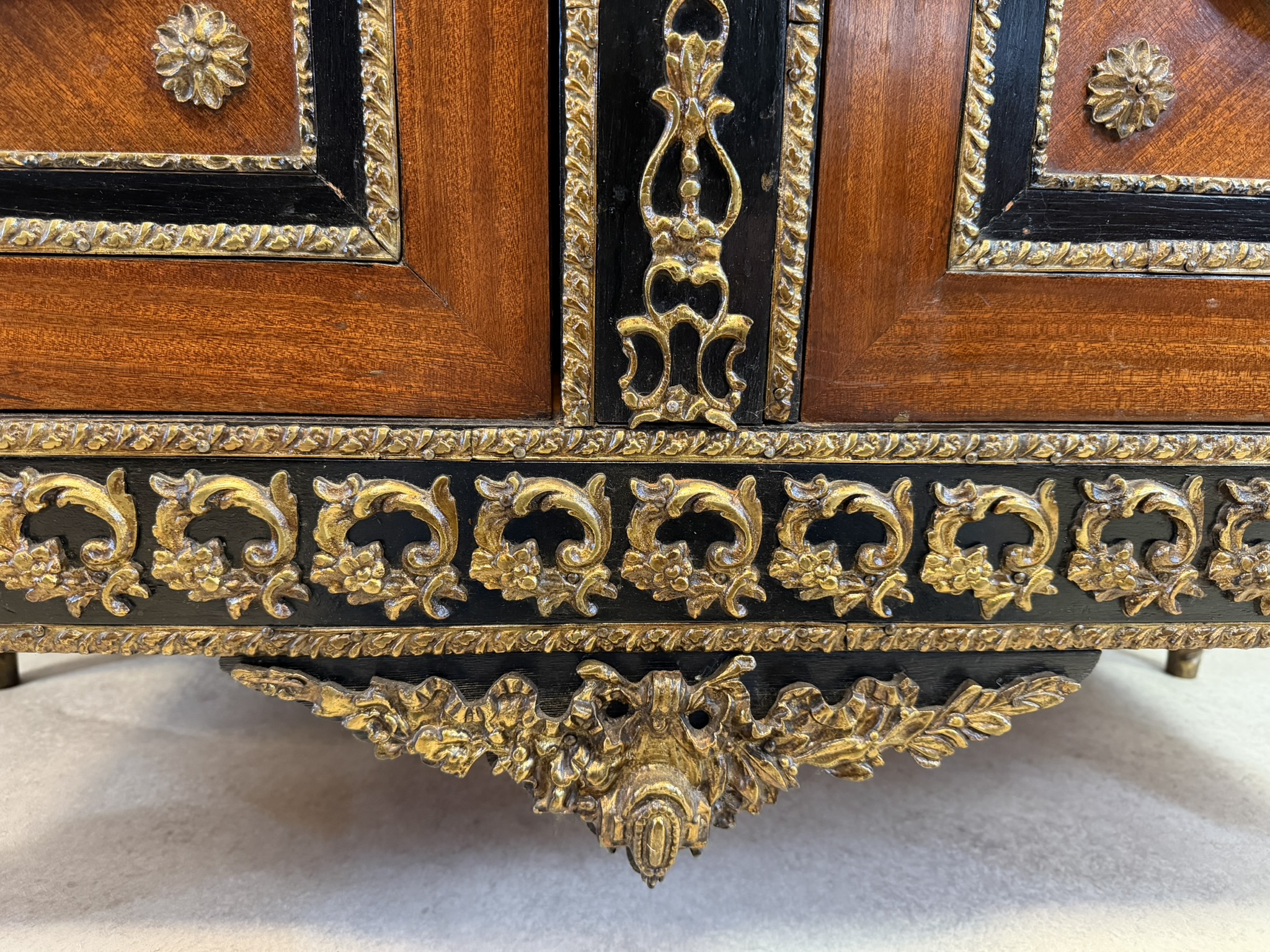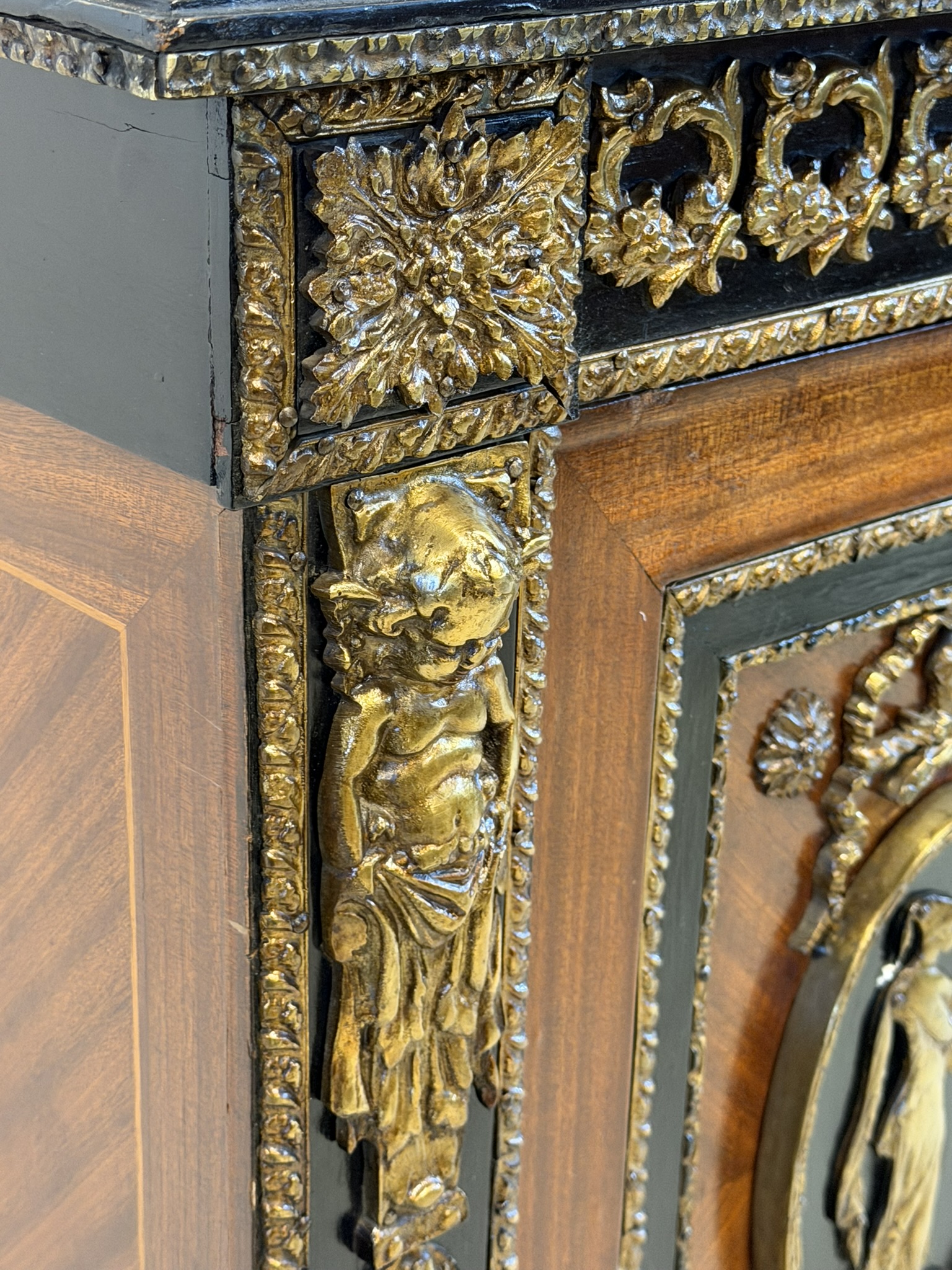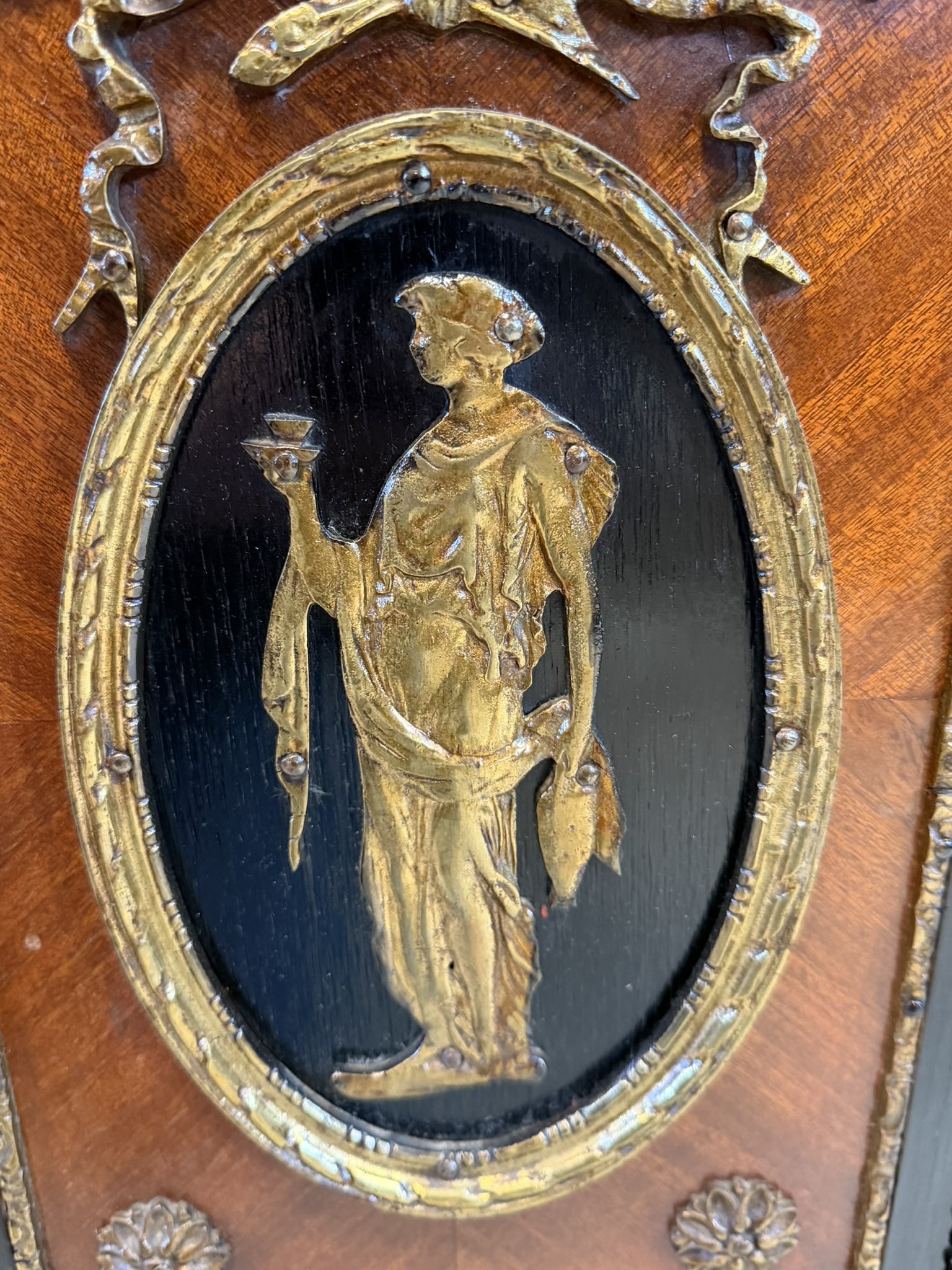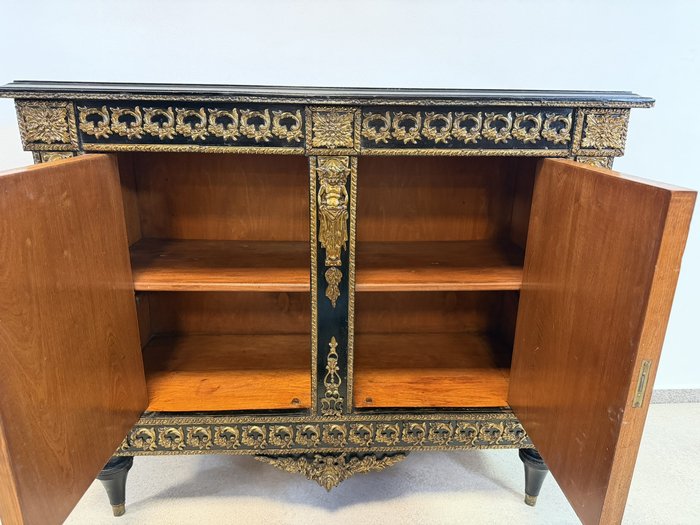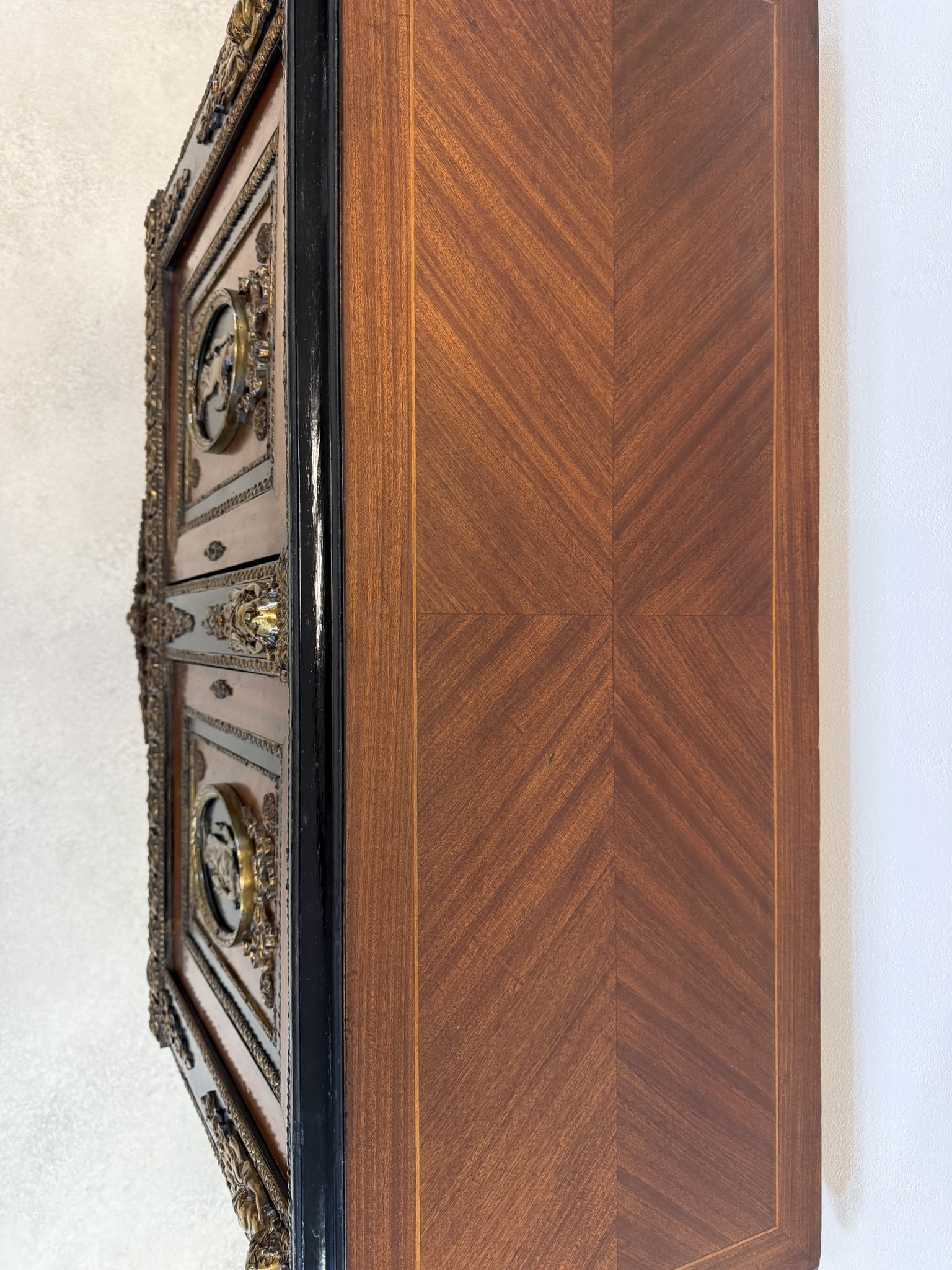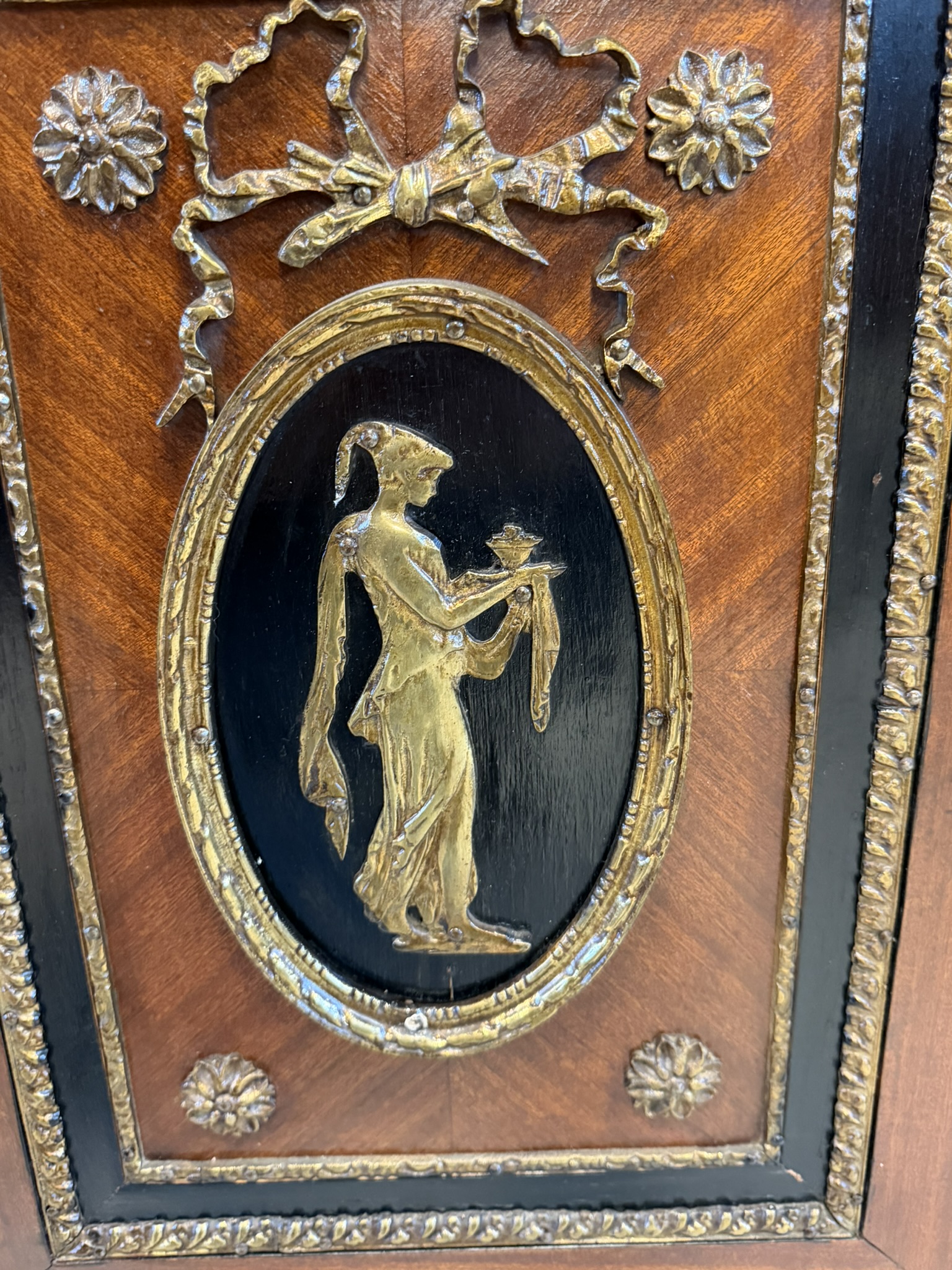 Elegantná komoda, pochádzajúca z Francúzska, zaujme bohatou výzdobou a kvalitným remeselným spracovaním. Korpus je dyhovaný ušľachtilým drevom s výraznou kresbou, doplnený kontrastnými čierno morenými prvkami. Čelá dverí zdobia medailóny s figurálnymi motívmi, inšpirovanými antikou, typickými pre francúzsky neoklasicizmus. Bohaté bronzové aplikácie, girlandy a ornamentálne pásy podčiarkujú luxusný charakter nábytku.