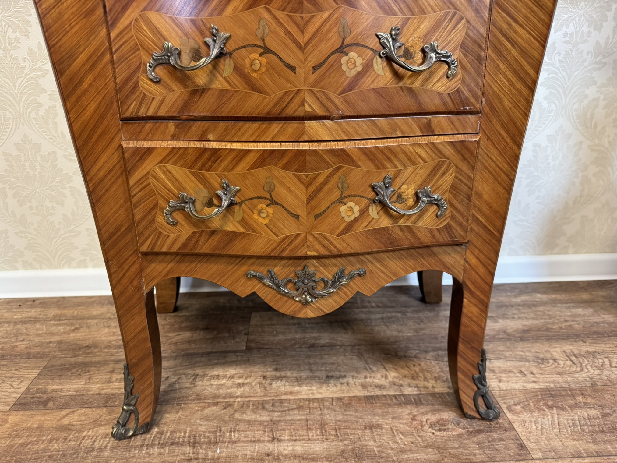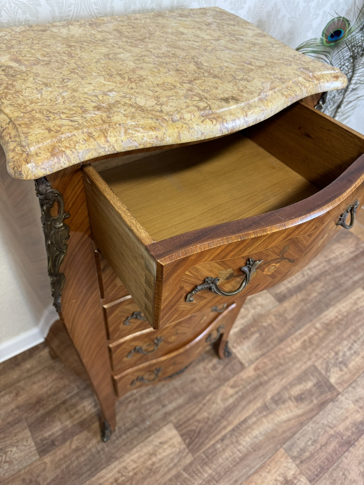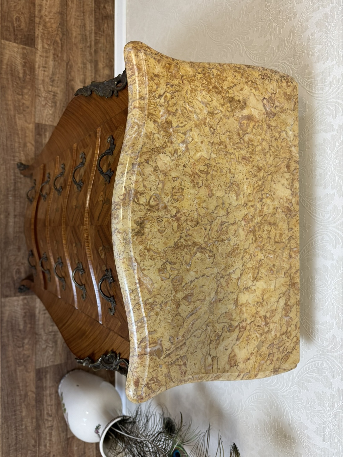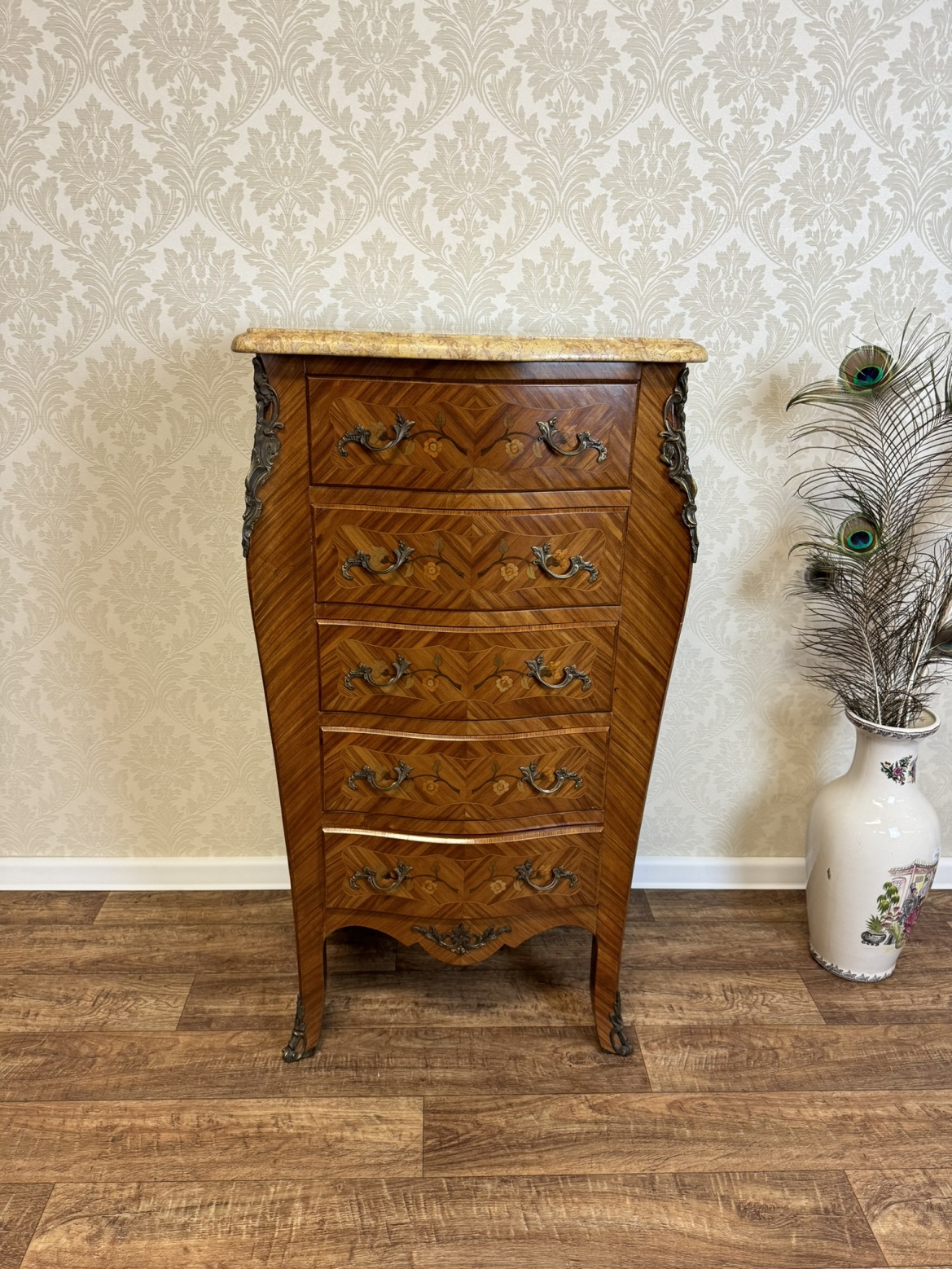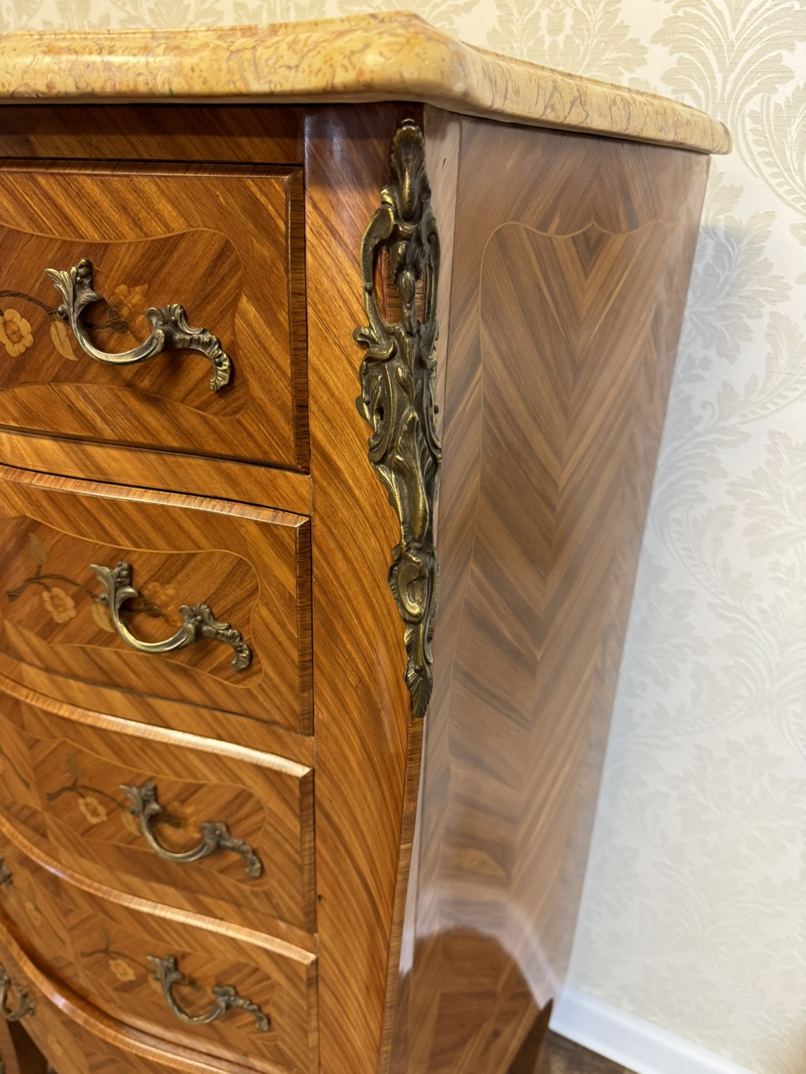Elegantná trojzásuvková komoda s bohatou florálnou intarziou, krivkovým čelom a bokmi, osadená doskou zo žilkovaného mramoru. Ozdobné aplikácie v rohoch aj na úchytkách dopĺňajú celkový výraz. Komoda vyniká kontrastom teplého dreva a kameninovej kresby.