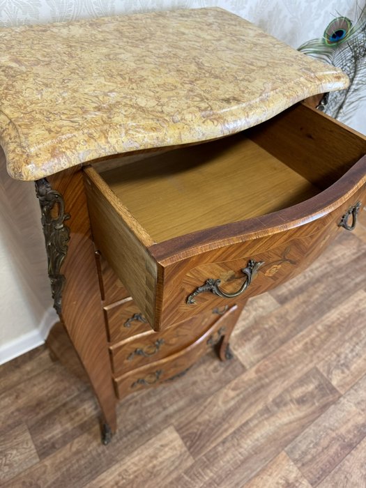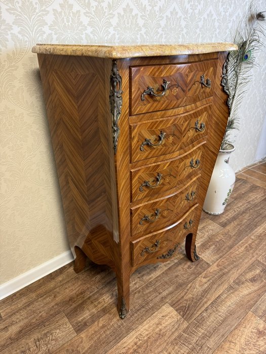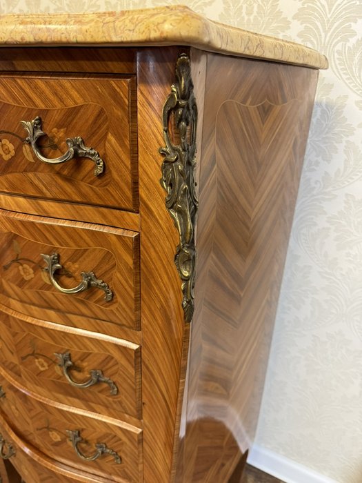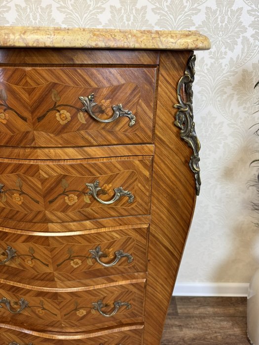 Komoda s bohato tvarovaným korpusom na vysokých nohách s jemnou kvetinovou intarziou a profilovanou doskou z mramoru. Bronzové aplikácie zdobia rohy, nohy aj úchytky.Nová výroba - Replika