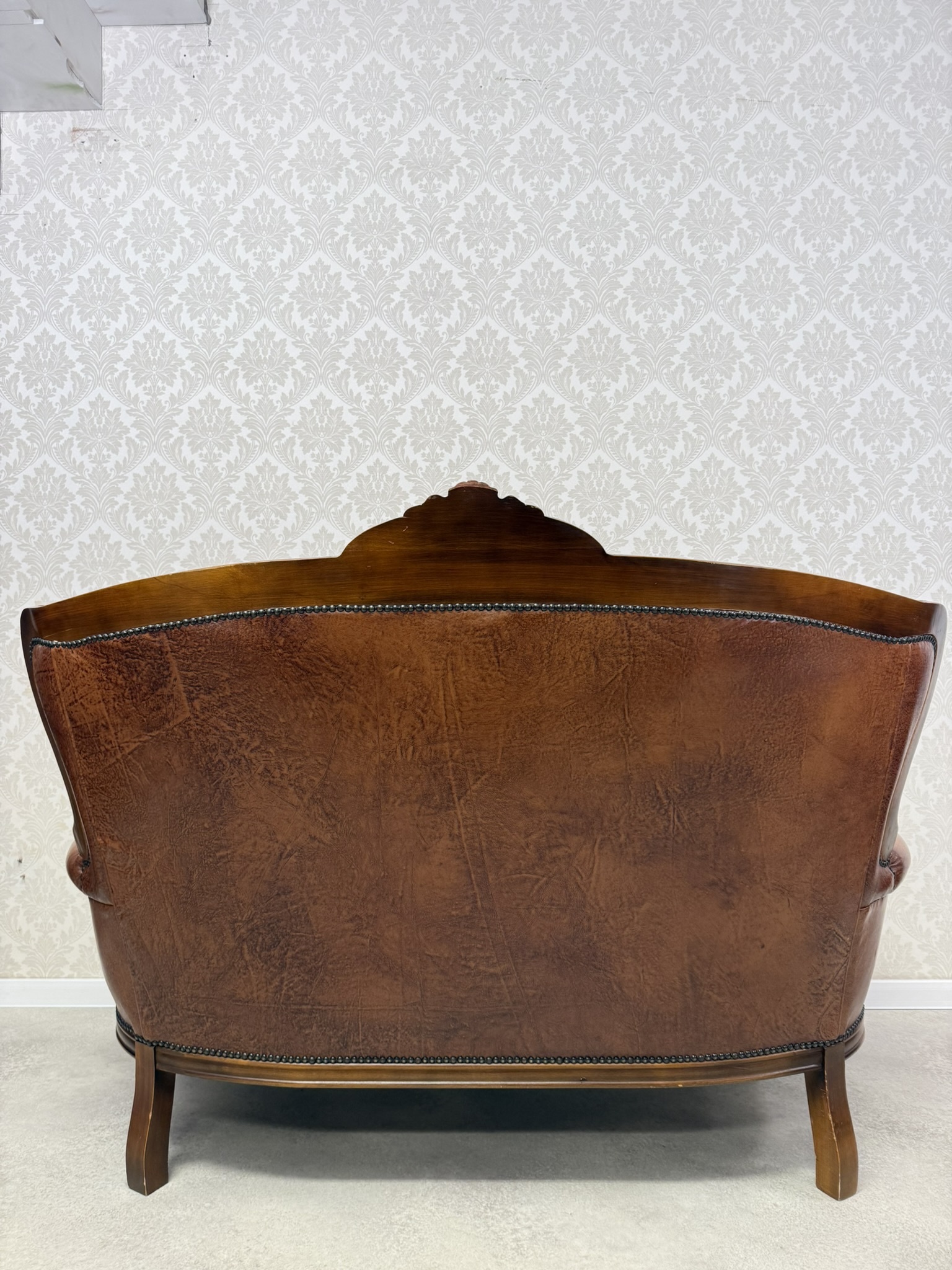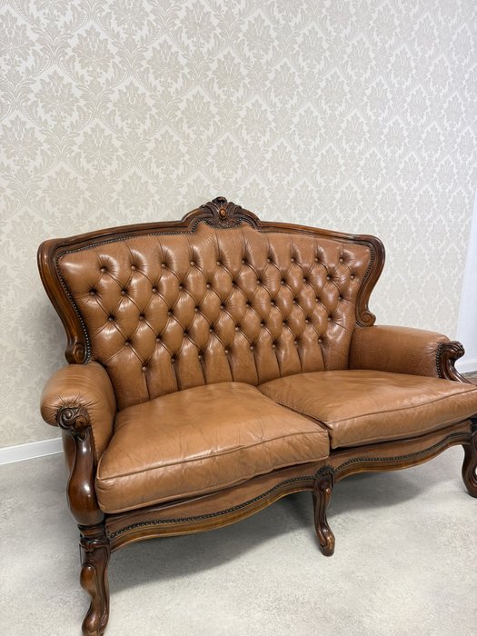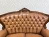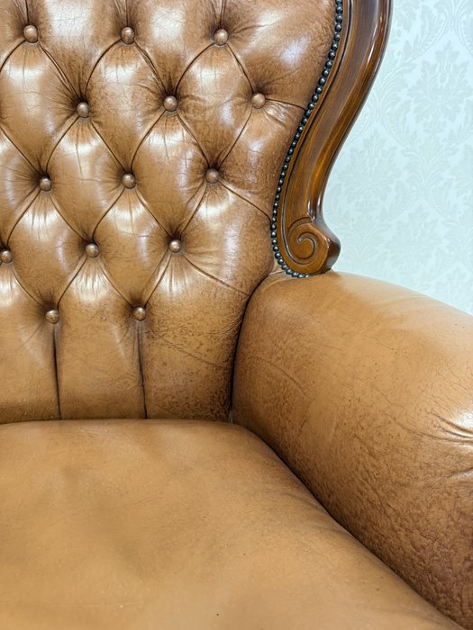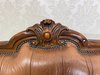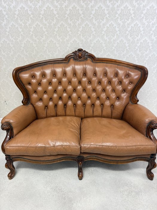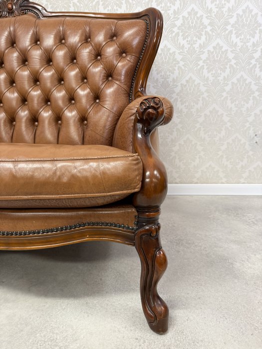 Reprezentatívna kožená pohovka s typickým hlbokým čalúnením operadla s vtiahnutými gombíkmi a elegantne tvarovaným dreveným rámom. Profilované podrúčky, dekoratívna rezba v hornej časti operadla a ladne tvarované nohy podčiarkujú celkový luxusný dojem.734,58 €