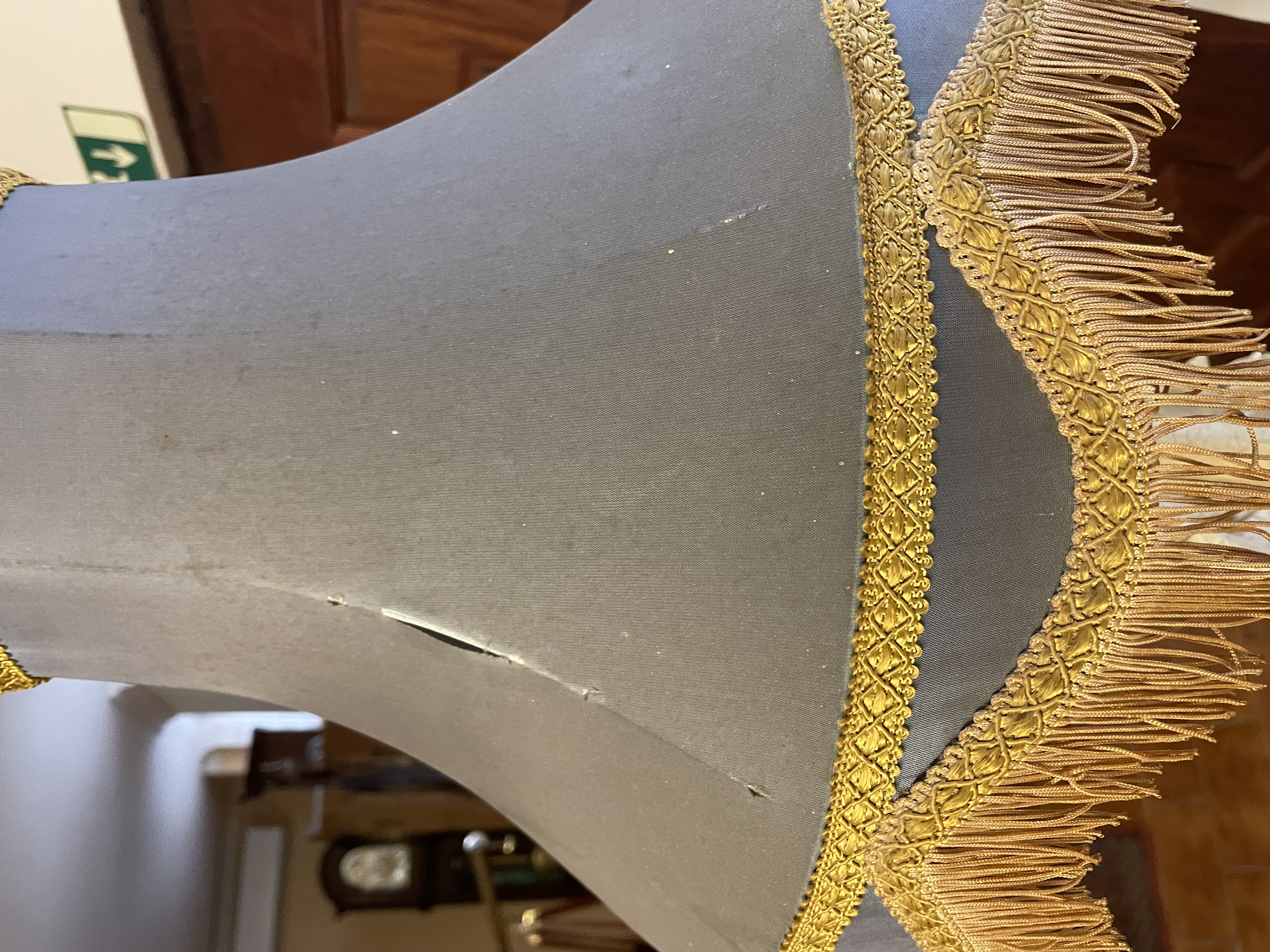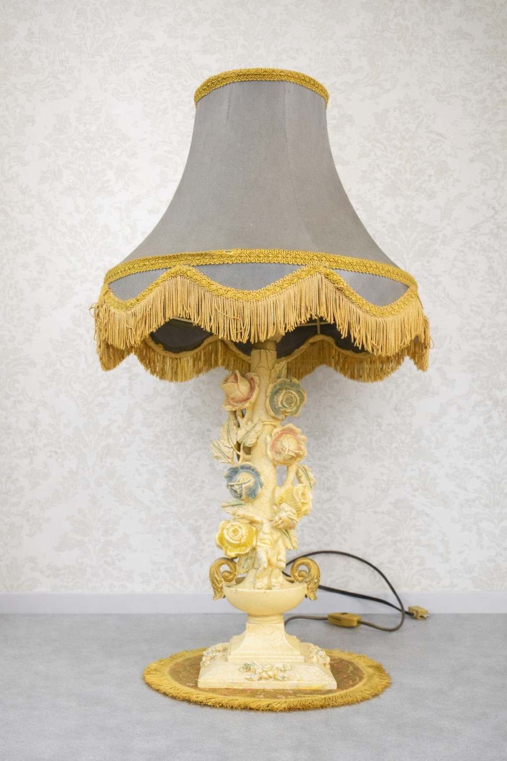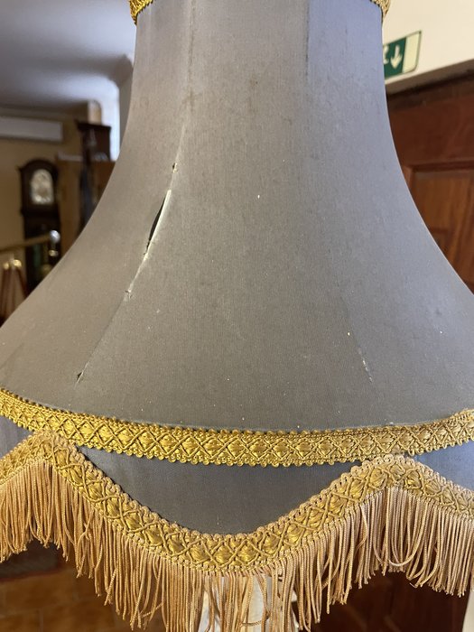 Stolová lampa z obdobia secesie s výrazne zdobeným stredovým motívom kvetov a elegantným tienidlom v šedom odtieni so bohatým zlatým lemovaním a strapcami. Podstavec lampy je dekoratívne prepracovaný, s jemnými detailmi pripomínajúcimi prírodné motívy. Tienidlo má drobnú vadu – roztrhnutie s dĺžkou cca 4 cm, ktoré je možné ľahko opraviť.