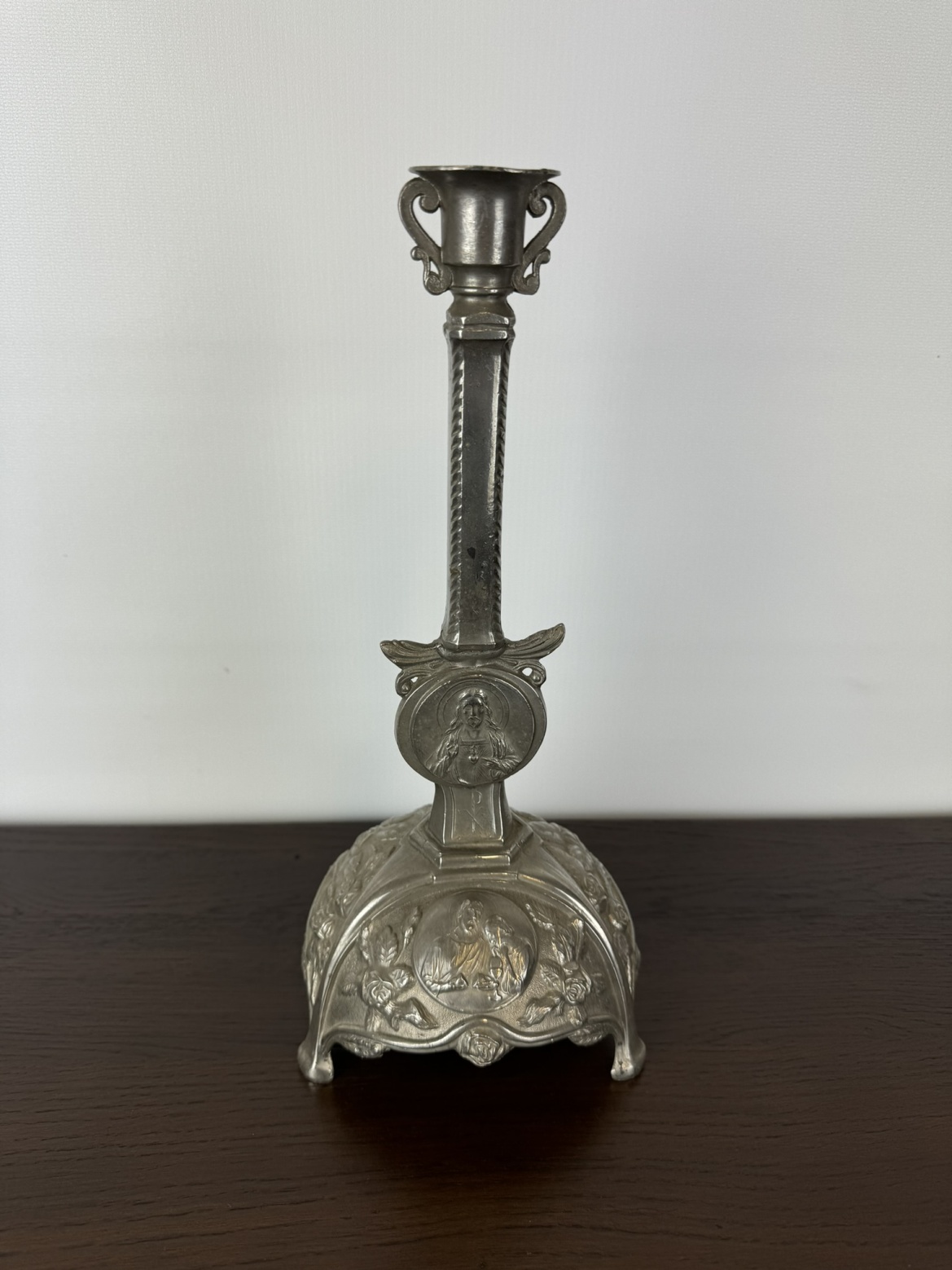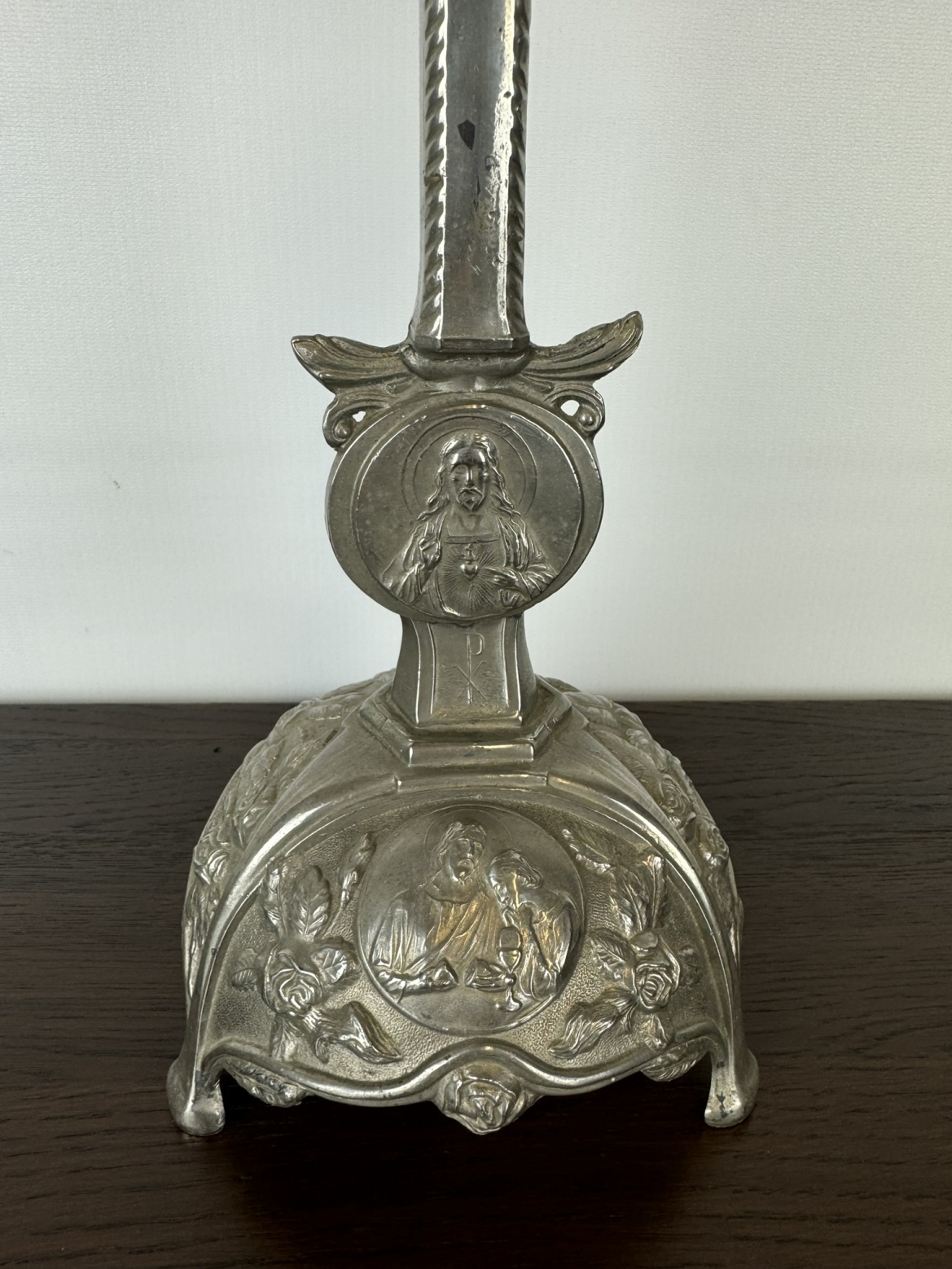 Liatinový svietnik s náboženským motívom a reliéfnou výzdobou - ha218