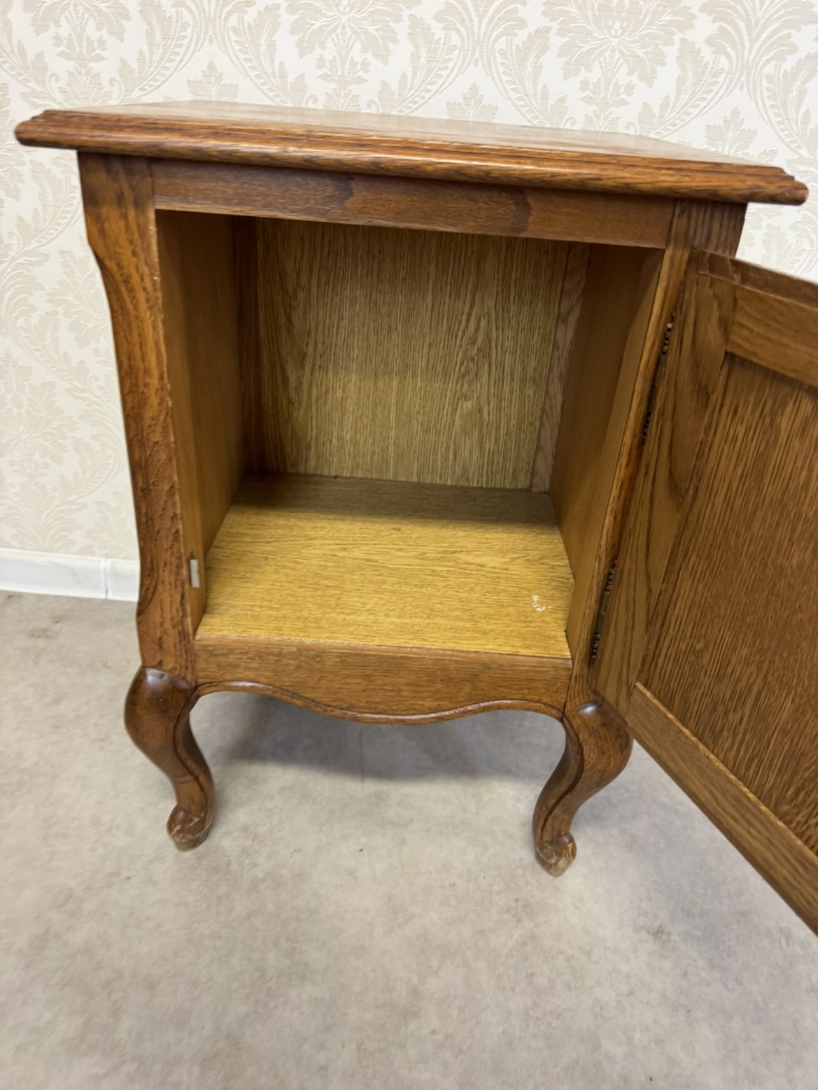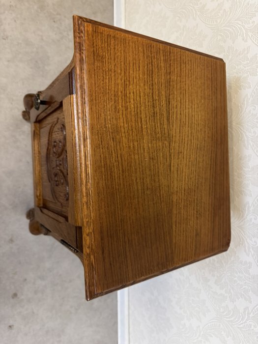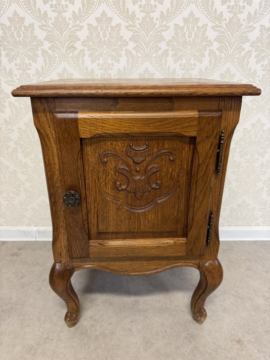 Svietnik je zdobený jemne vyrezávanými ornamentmi a má stabilnú základňu. Jeho elegantný vzhľad a prepracované detaily mu dodávajú historický charakter.Nočný stolík s otvorenou policou a ozdobnými detailmi