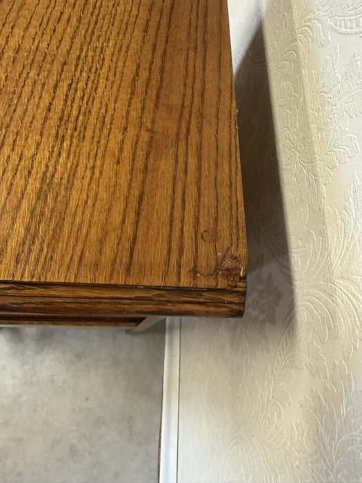 Stolík je zdobený rezbou na čelnej strane zásuvky, profilovanými nohami a kužeľovými stĺpikmi. Priečka s drobnými točenými vretenami.Zľava