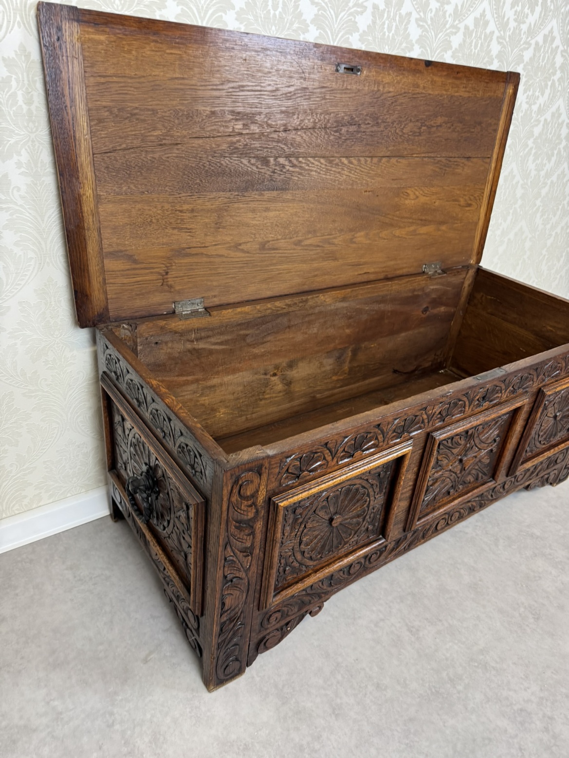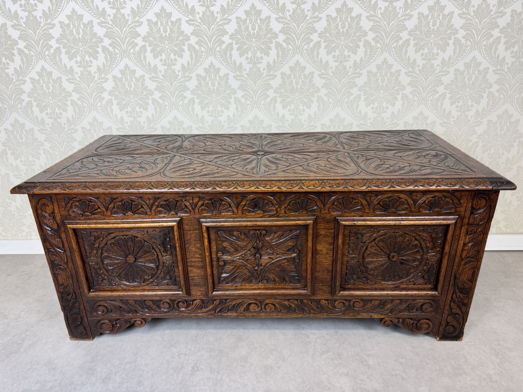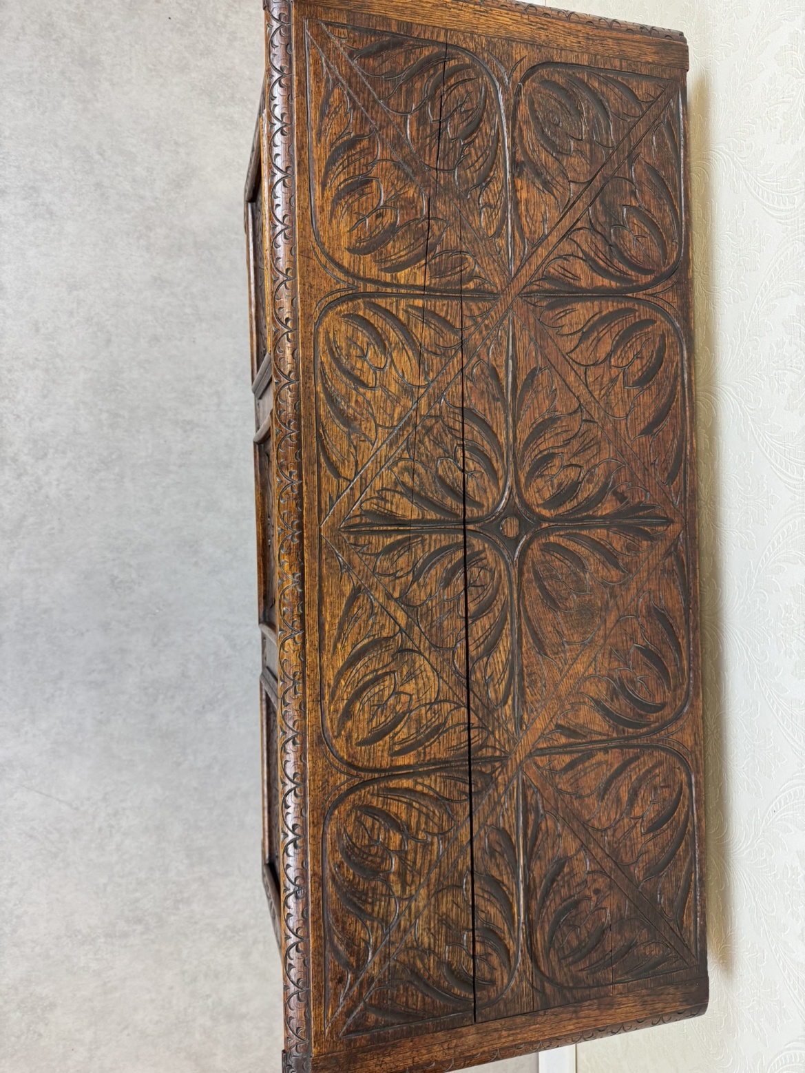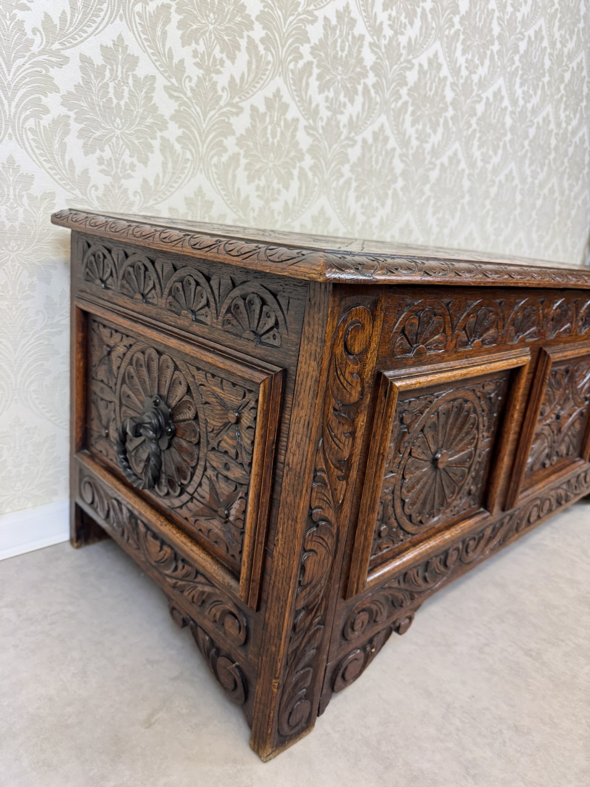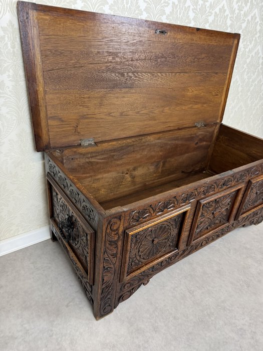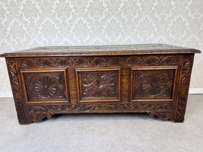 Masívna dubová truhlica s bohatou rezbou