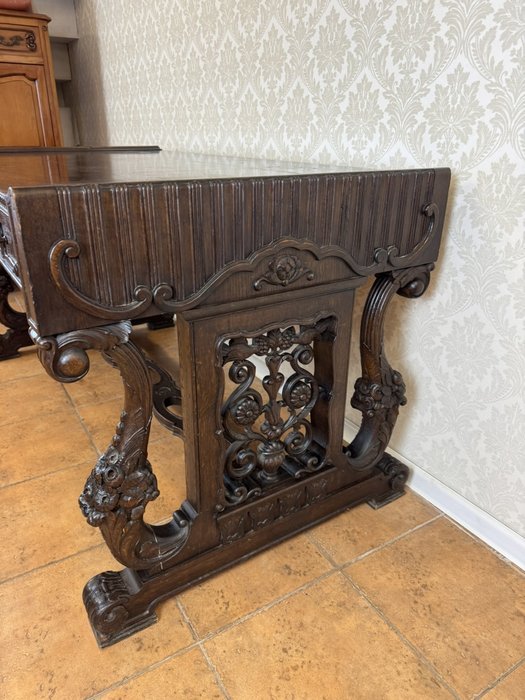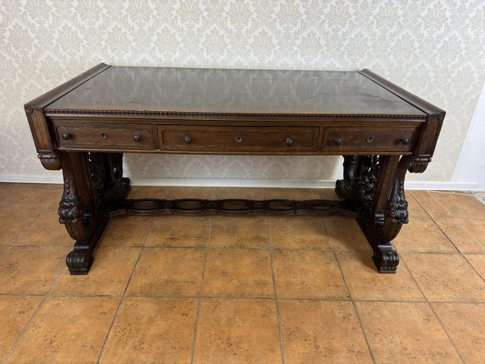 Písací stôl, zdobený bohatou ručnou rezbou s rastlinnými motívmi a maskarónmi. Stôl má centrálny kolenný priestor, hornú zásuvku, postranné skrinky s dvierkami a vnútornými zásuvkami, čo zaisťuje dostatok úložného priestoru. Doska je doplnená červenou písacou vložkou. Robustná konštrukcia, profilované rímsy a nohy zakončené levými labami podčiarkujú reprezentatívny charakter kusu.