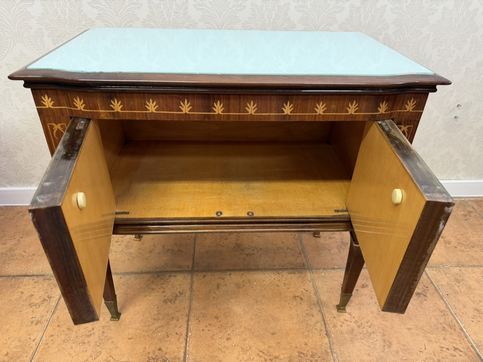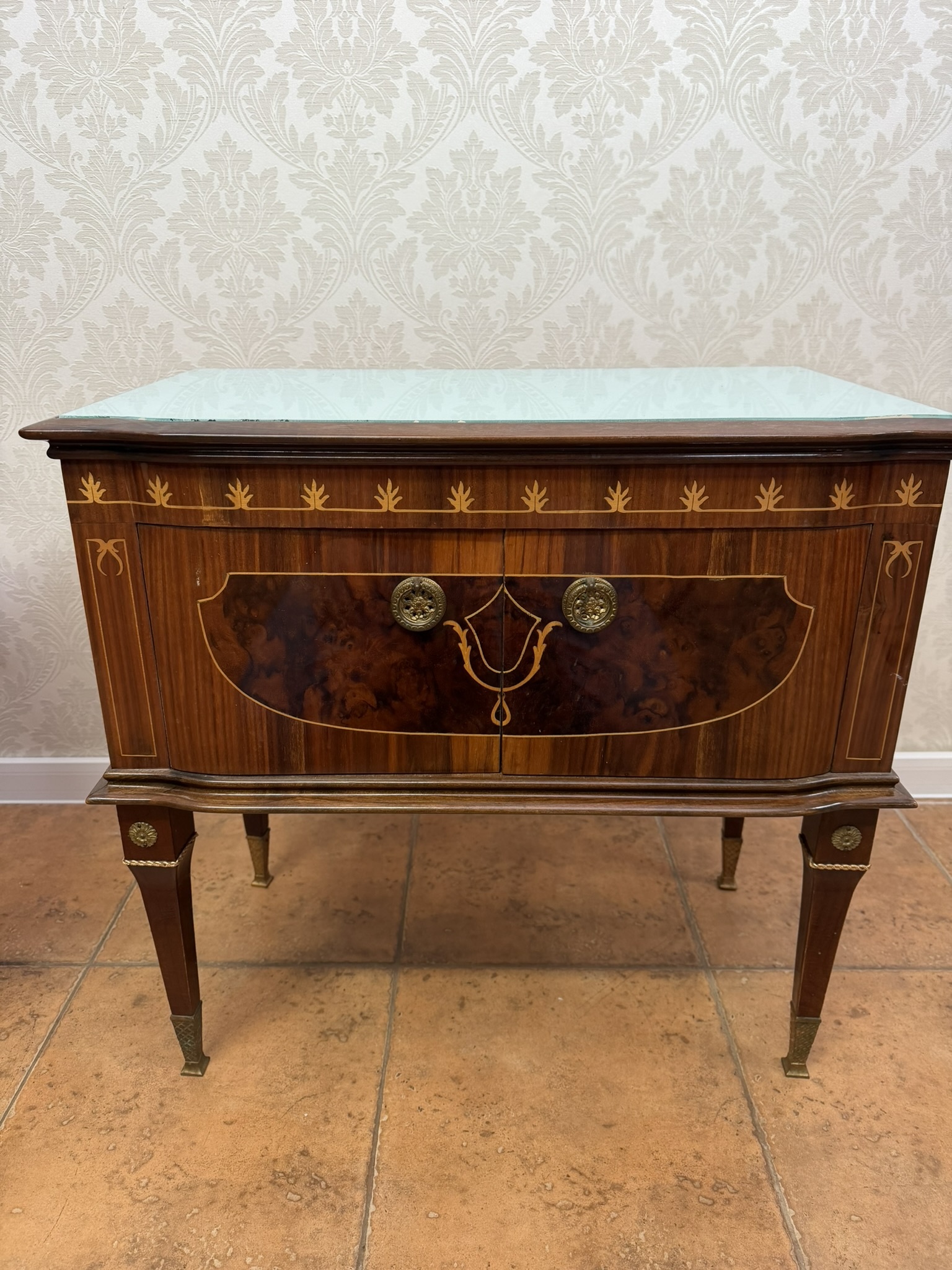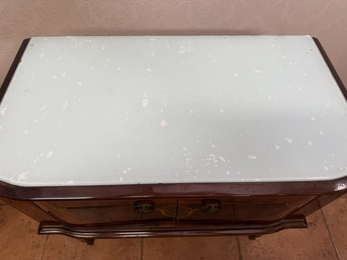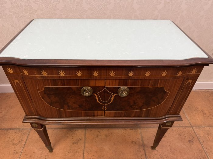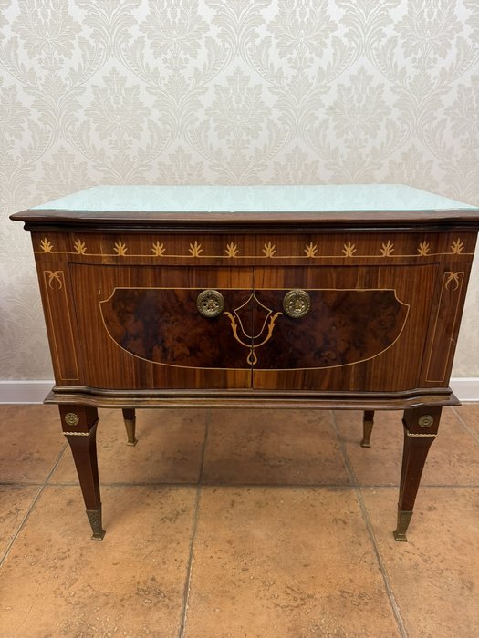 Nočný stolík s intarzovanou prednou časťou, zdobený motívmi listových pásikov a jemným ornamentom v tvare štylizované girlandy. Stolík stojí na kónických nohách doplnených mosadznými aplikáciami a pätkami.154,8 €