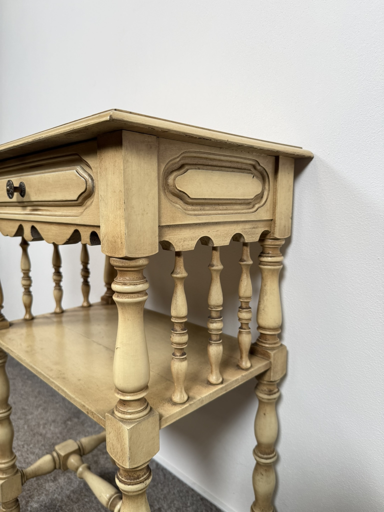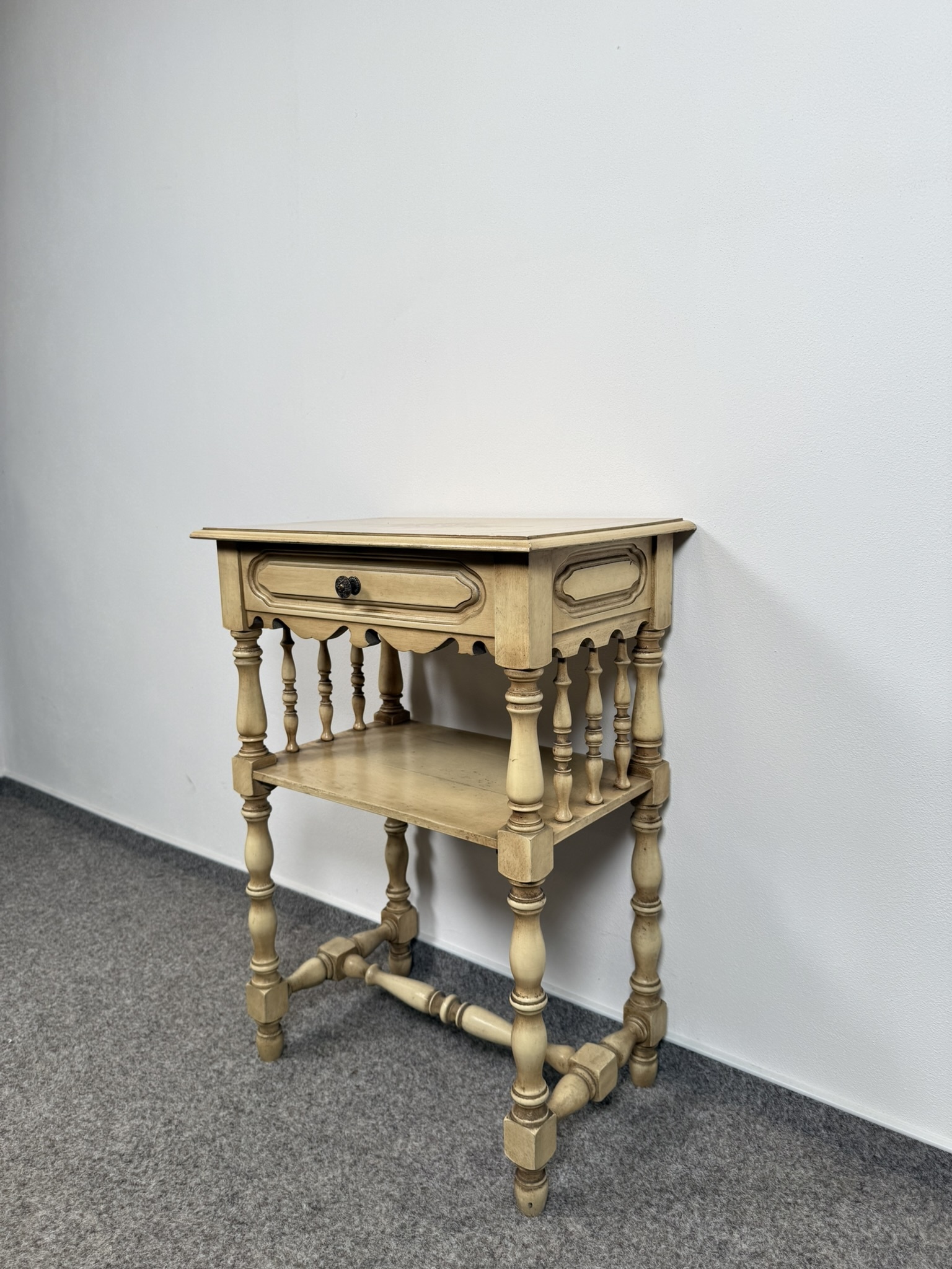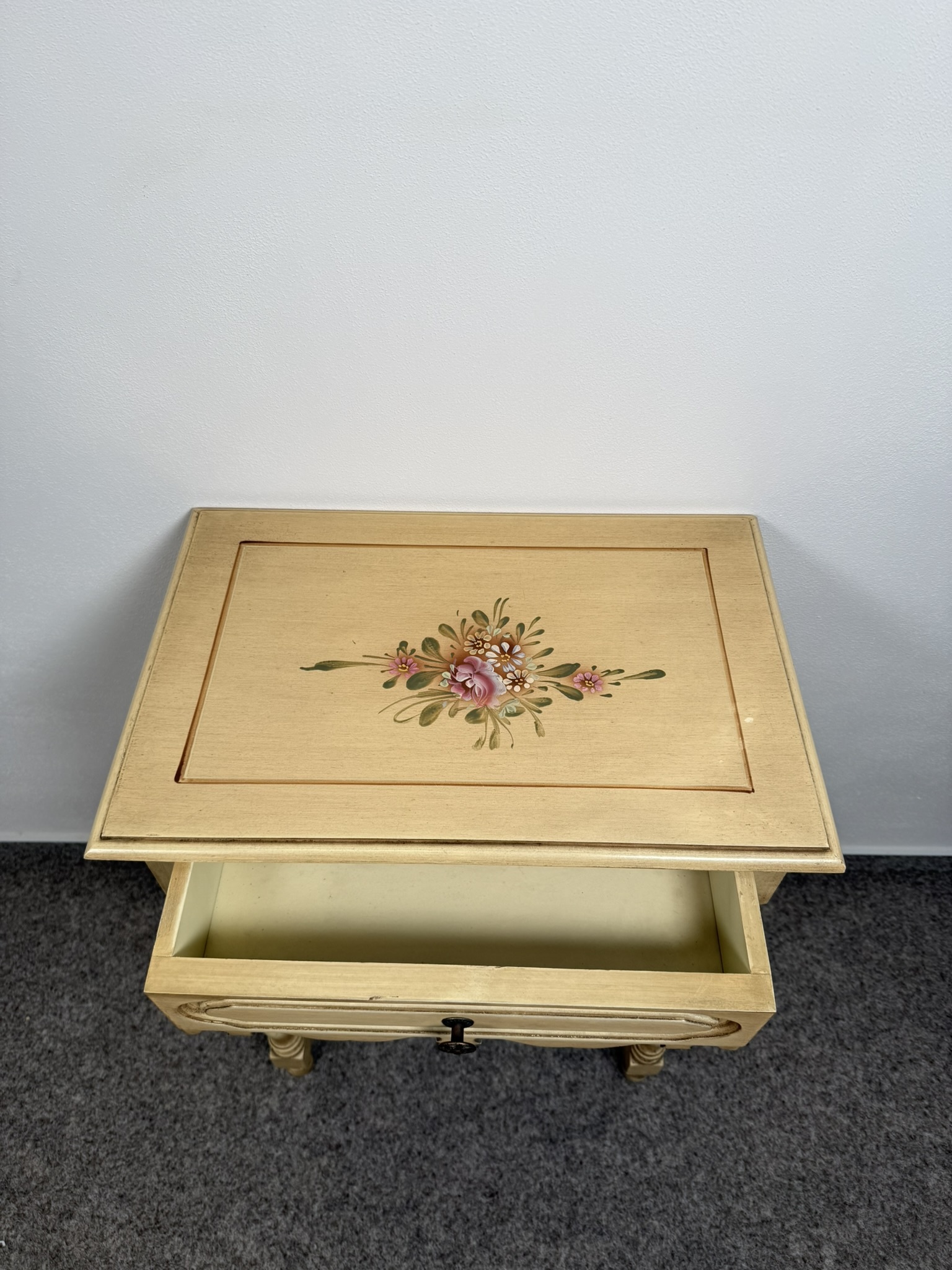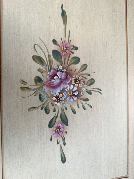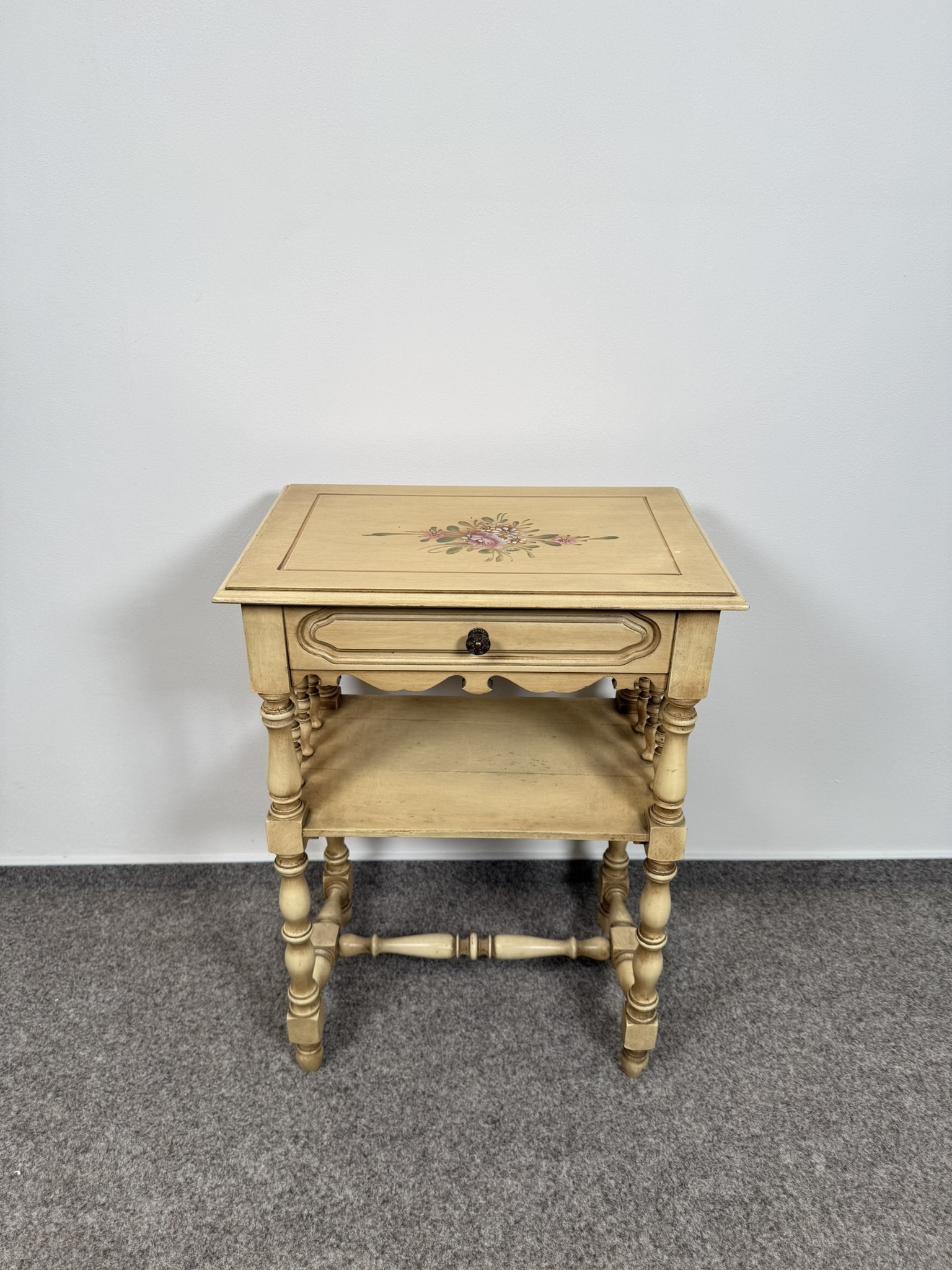 Nočný stolík s jednou zásuvkou, spodnou odkladacou doskou a ručne maľovaným kvetinovým motívom na hornej doske. Ozdobený drobným rezbovaným dekórom a patinovaným povrchom.145,2 €