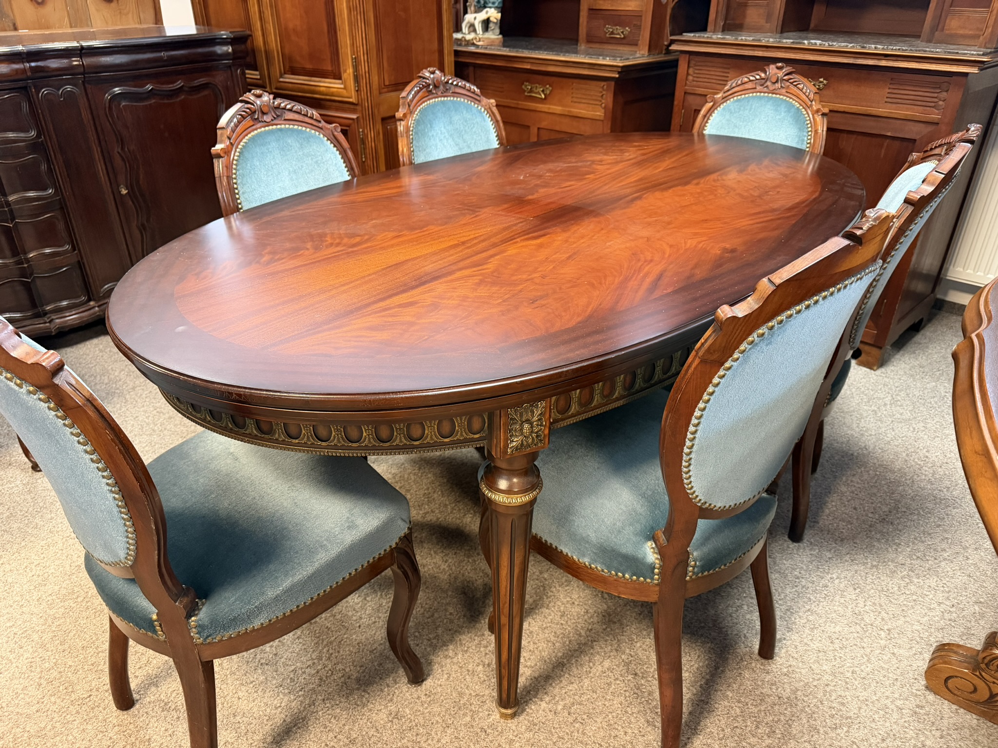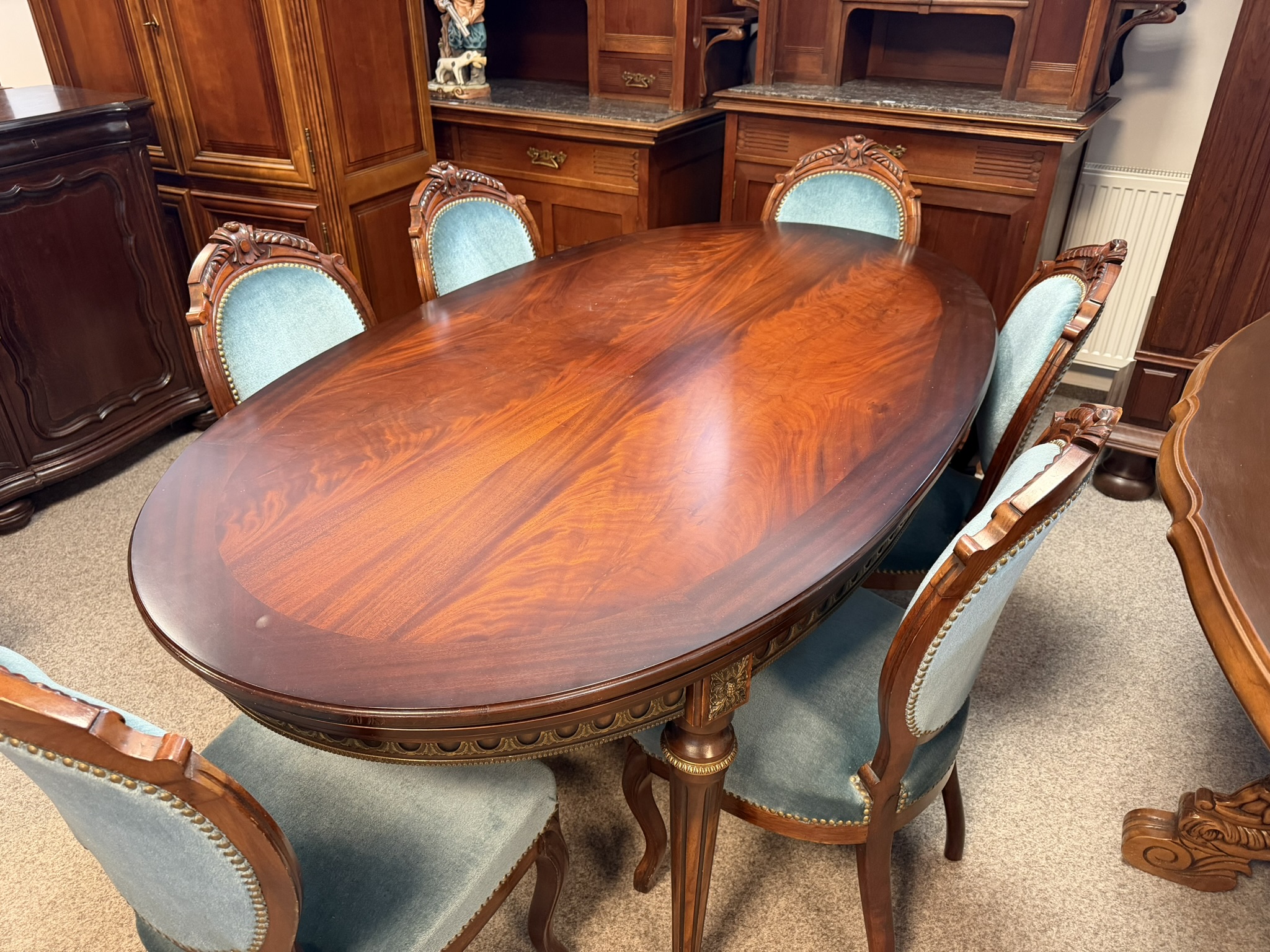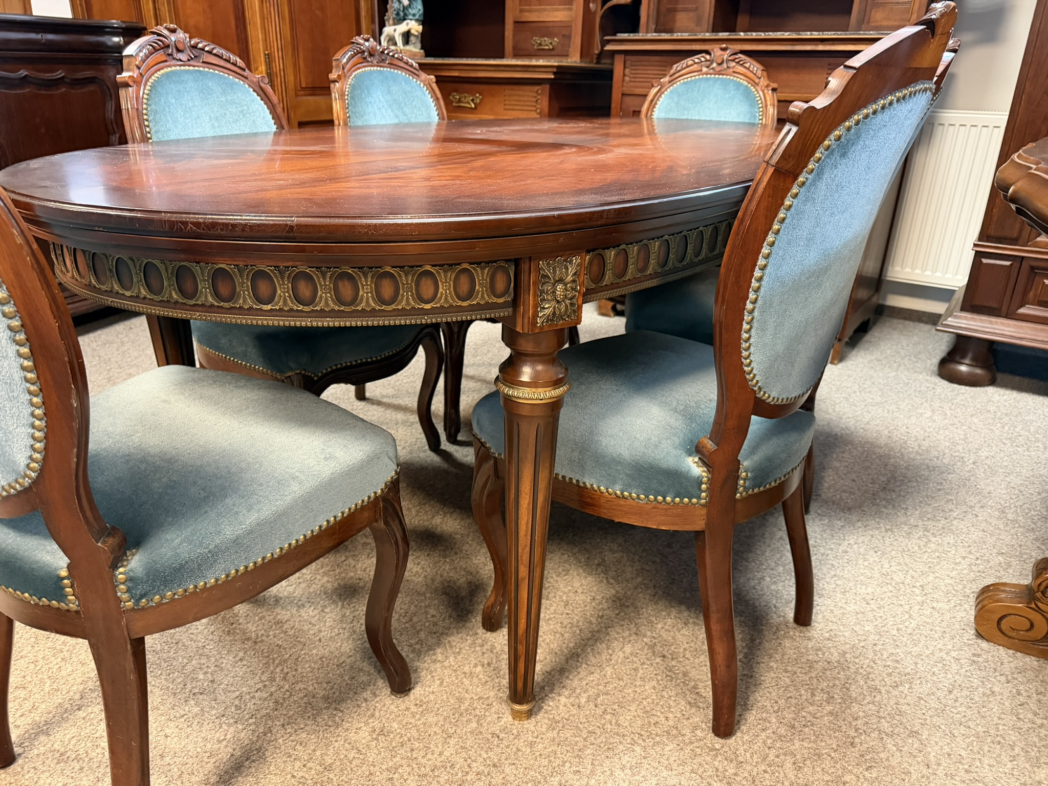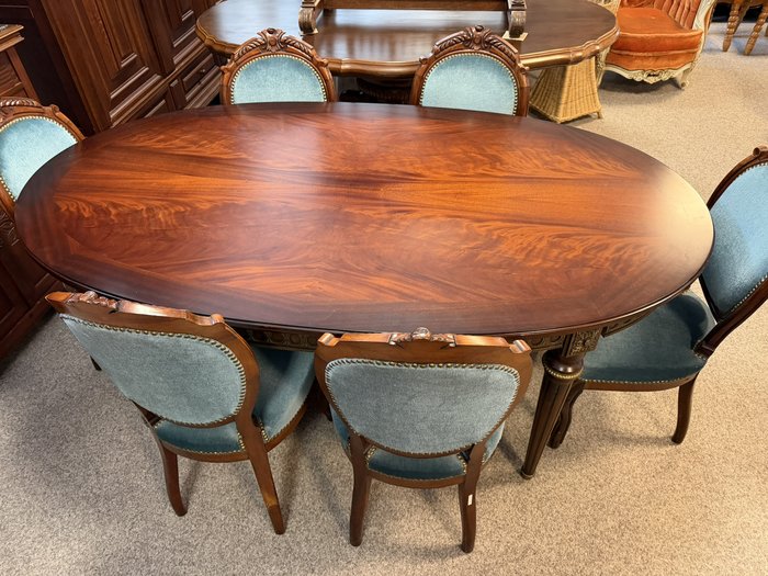 Oválny jedálenský stôl s bohatou kresbou dreva doplnený sadou stoličiek s vyrezávanými operadlami a čalúnením v jemnom modrozelenom odtieni. Celok dopĺňajú prehnuté nohy, detaily a ozdobné prvky. Hrany stola zdobí jemná profilácia, zatiaľ čo stoličky vynikajú tvarovanými líniami a dekoratívnym čalúnením s klincovou lištou.