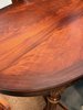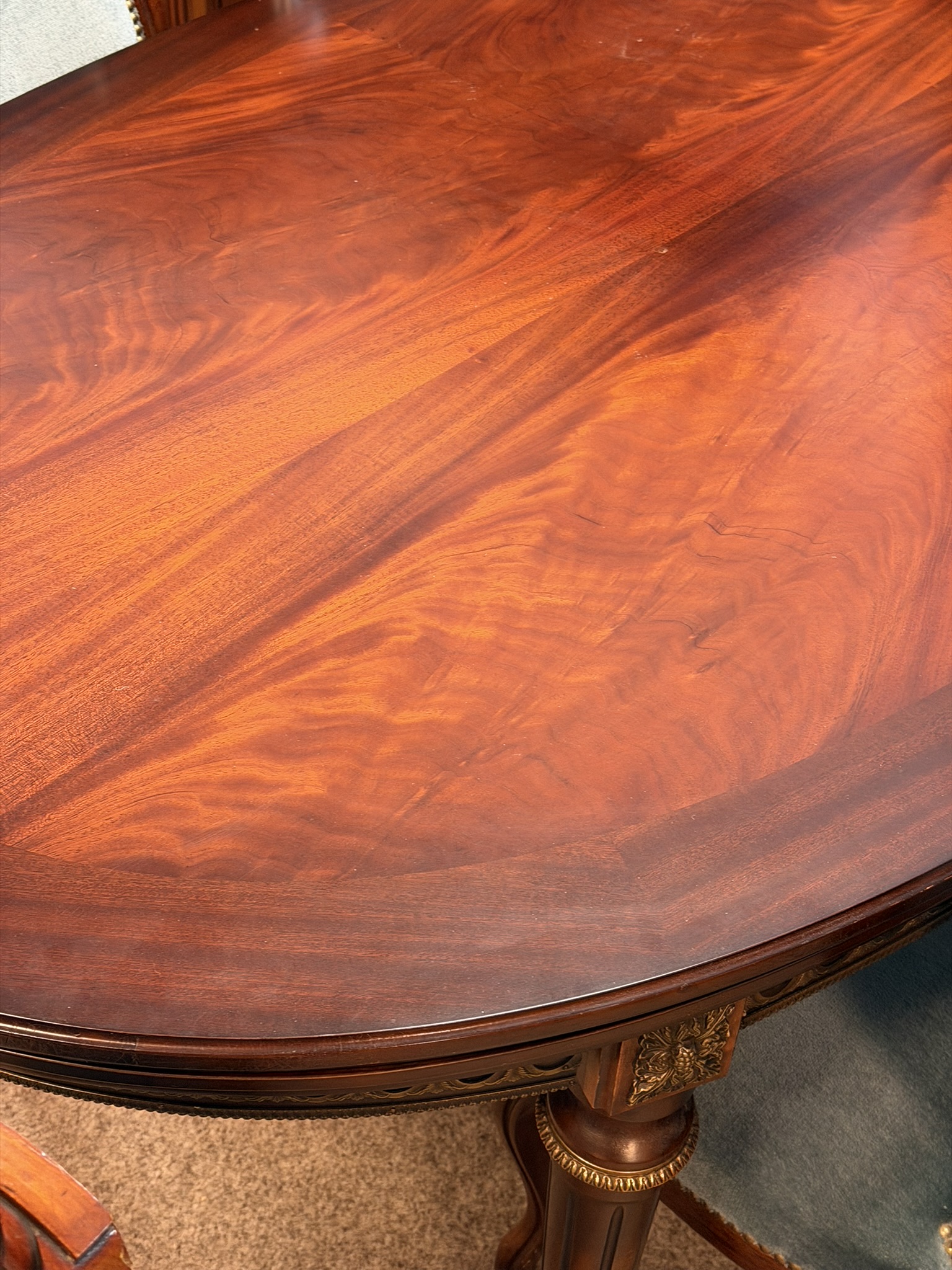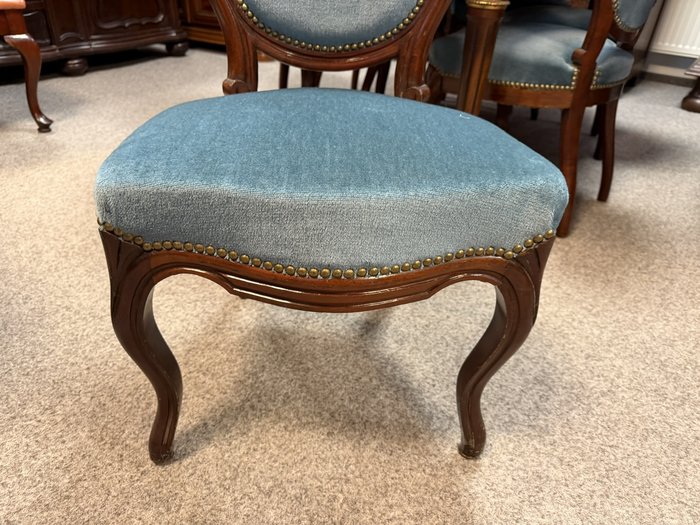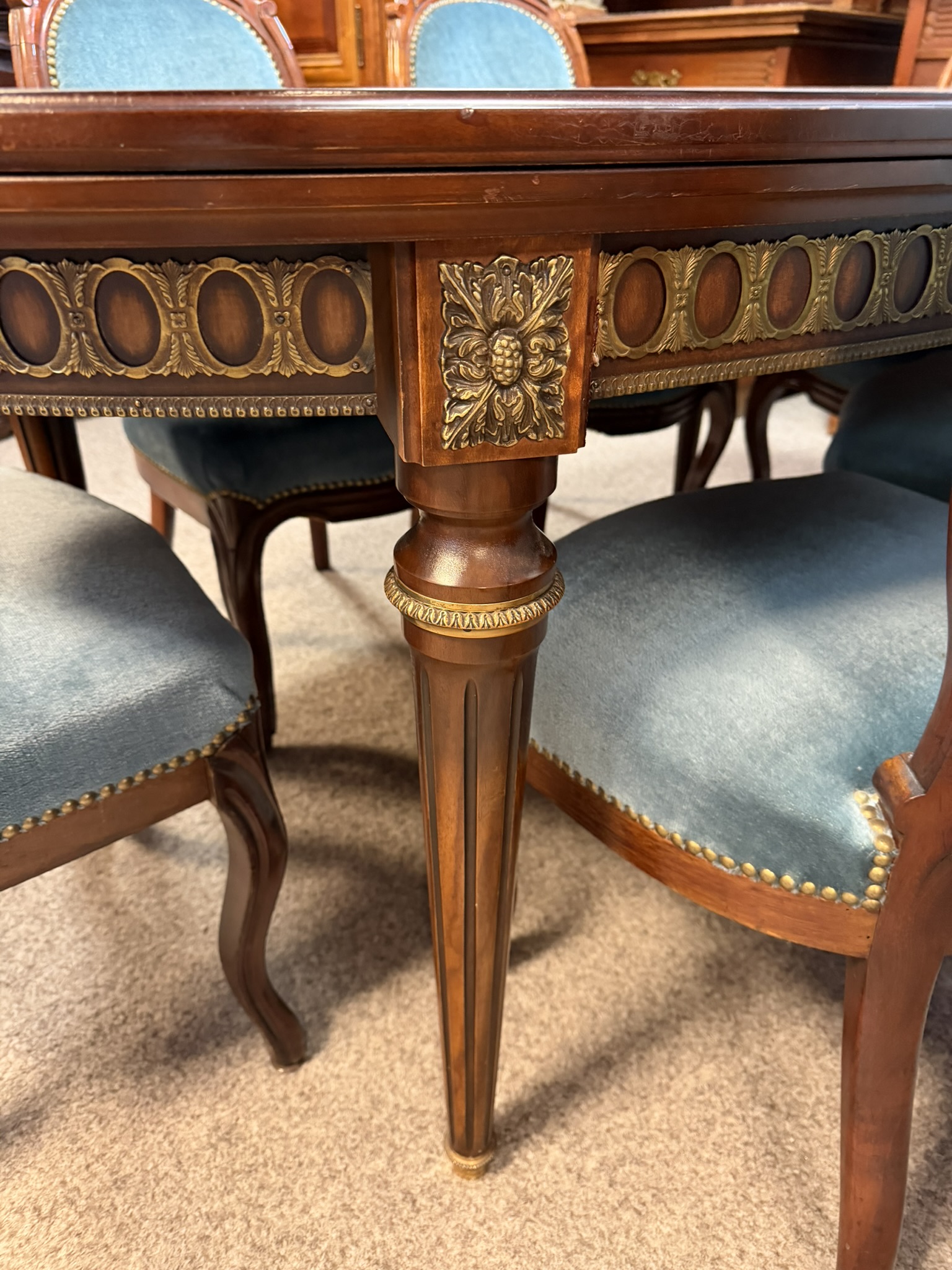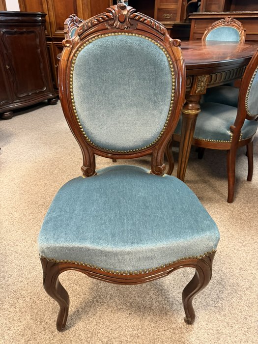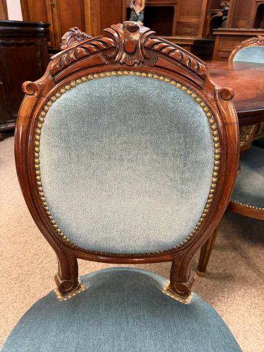 Oválny jedálenský stôl s bohatou kresbou dreva doplnený sadou stoličiek s vyrezávanými operadlami a čalúnením v jemnom modrozelenom odtieni. Celok dopĺňajú prehnuté nohy, detaily a ozdobné prvky. Hrany stola zdobí jemná profilácia, zatiaľ čo stoličky vynikajú tvarovanými líniami a dekoratívnym čalúnením s klincovou lištou.