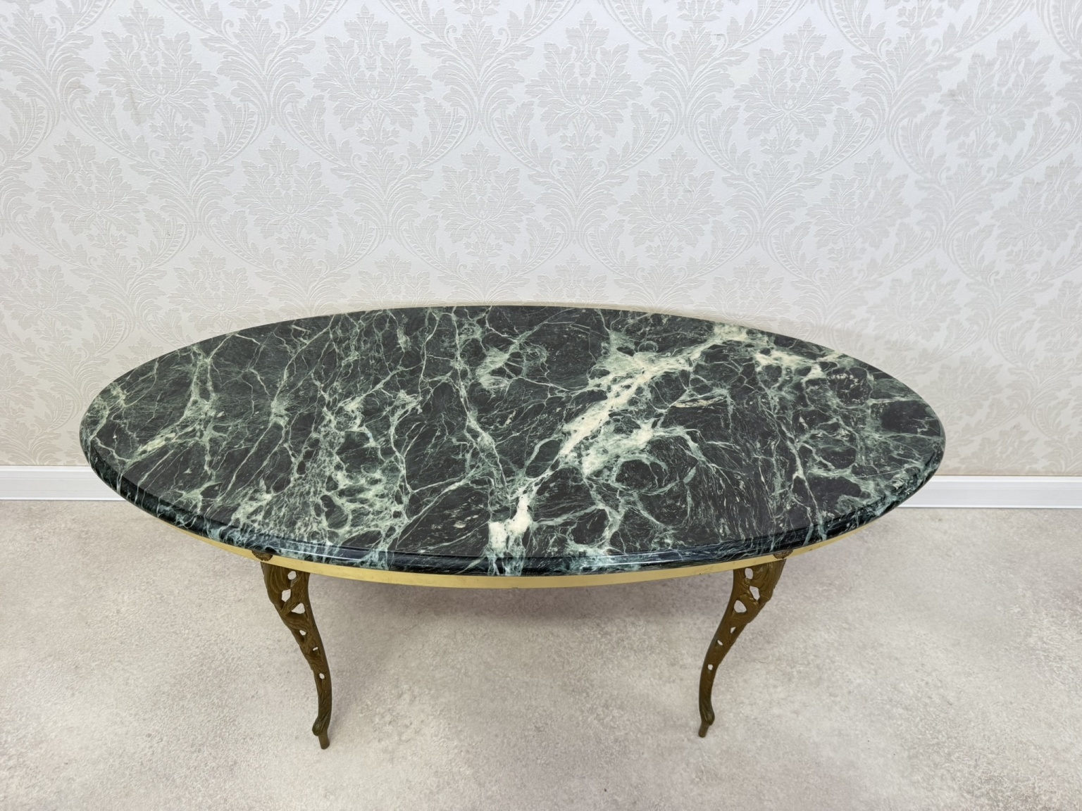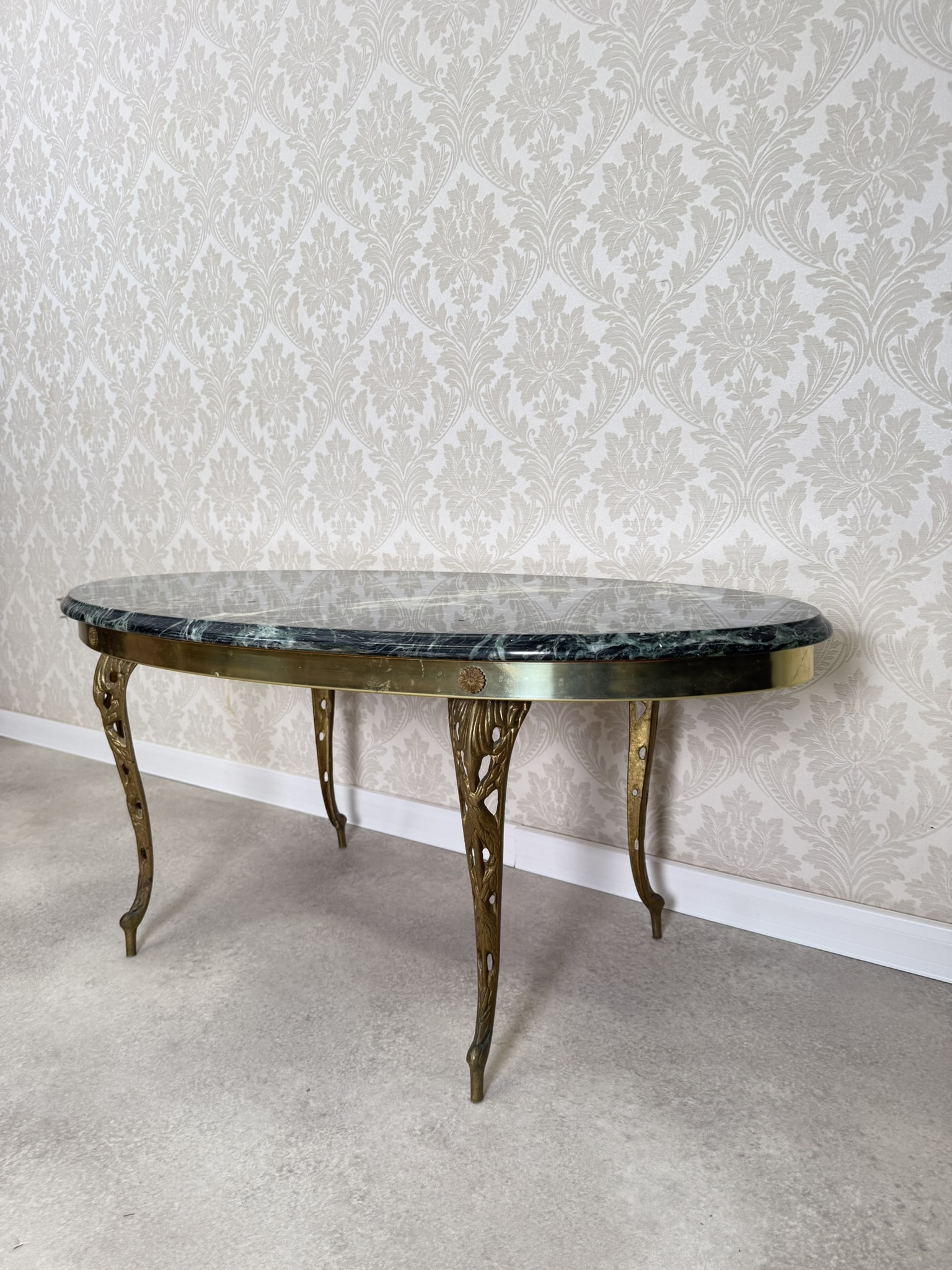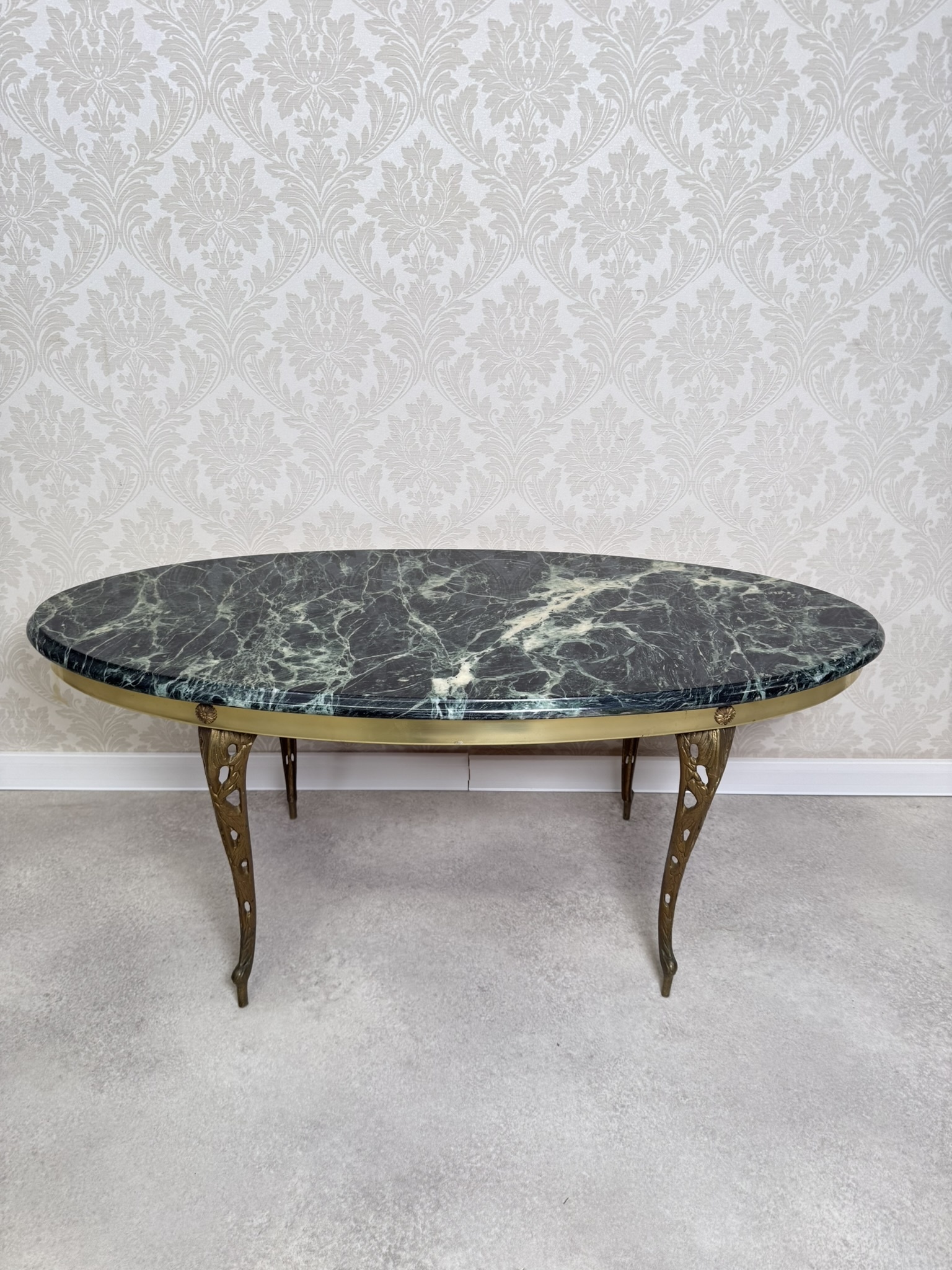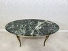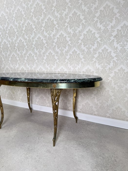 Stolík s elegantnou doskou z tmavo zeleného mramoru s výrazným žilkovaním. Oválny tvar dopĺňa mosadzná konštrukcia s jemne profilovanými nohami zdobenými výrezmi.169,2 €