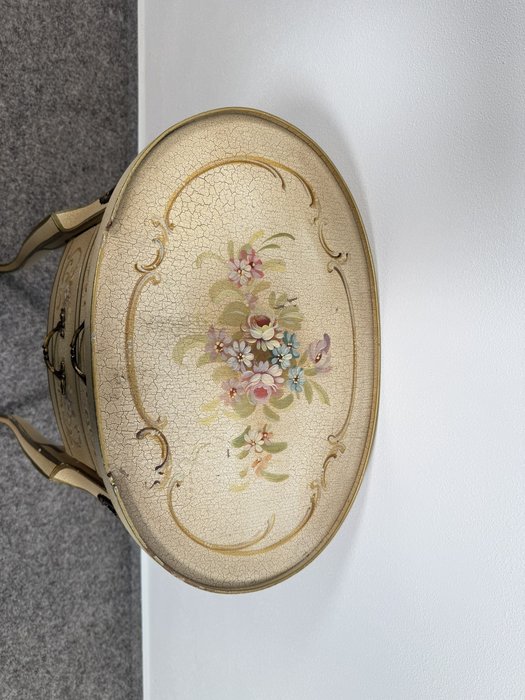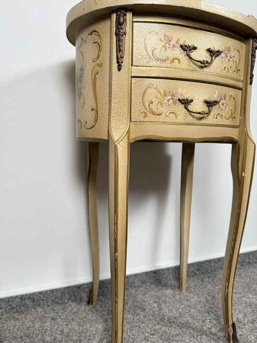 Nočný stolík s oválnou doskou, zásuvkami a ručne maľovanými kvetinovými motívmi na čelách aj bokoch. Tvarované nohy a patinovaný povrch s drobným krakelovaním podčiarkujú jeho romantický charakter.163,29 €