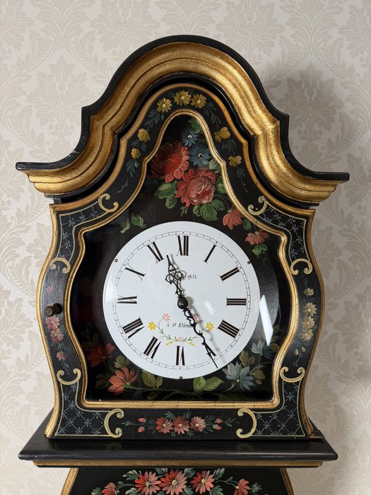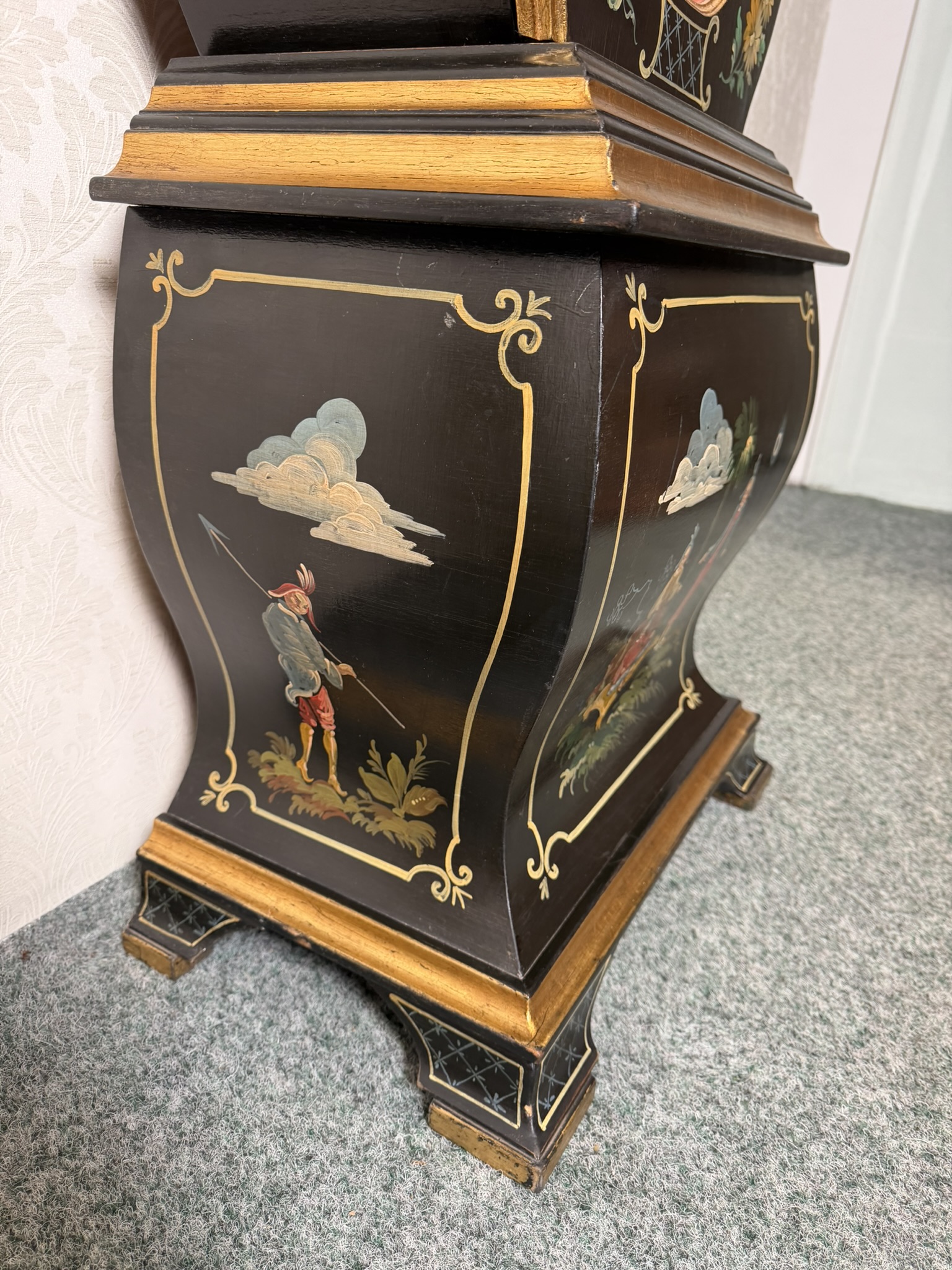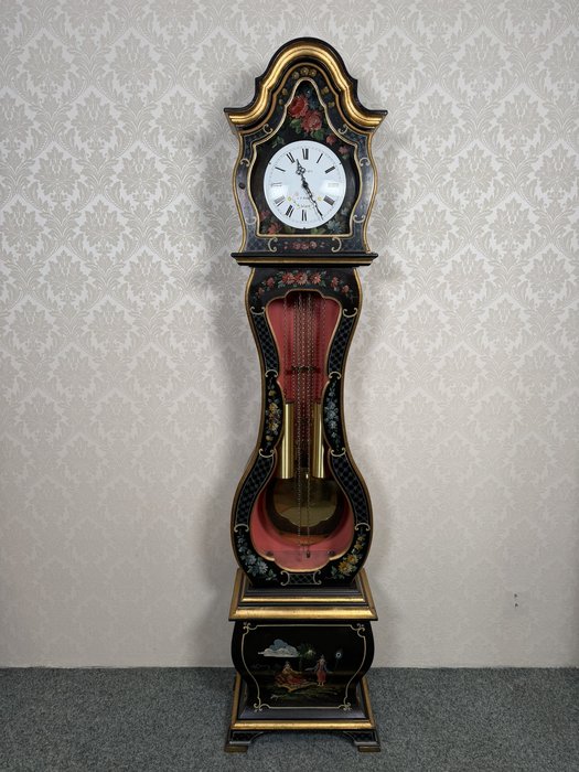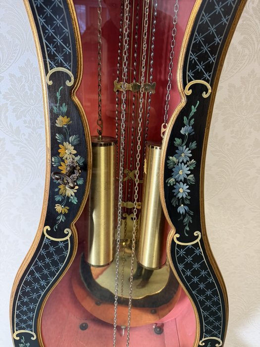 Elegantné stojacie hodiny, skriňa je zdobená ručnou maľbou vrátane figurálneho výjavu na spodnej časti. Hodiny prešli kompletným odborným servisom hodinárom, sú plne funkčné, nastavené a pripravené na okamžitú prevádzku.