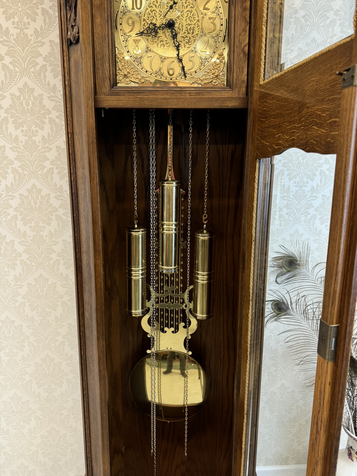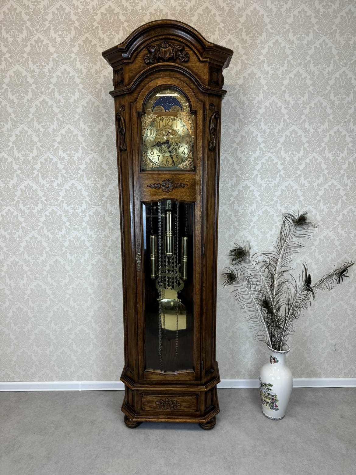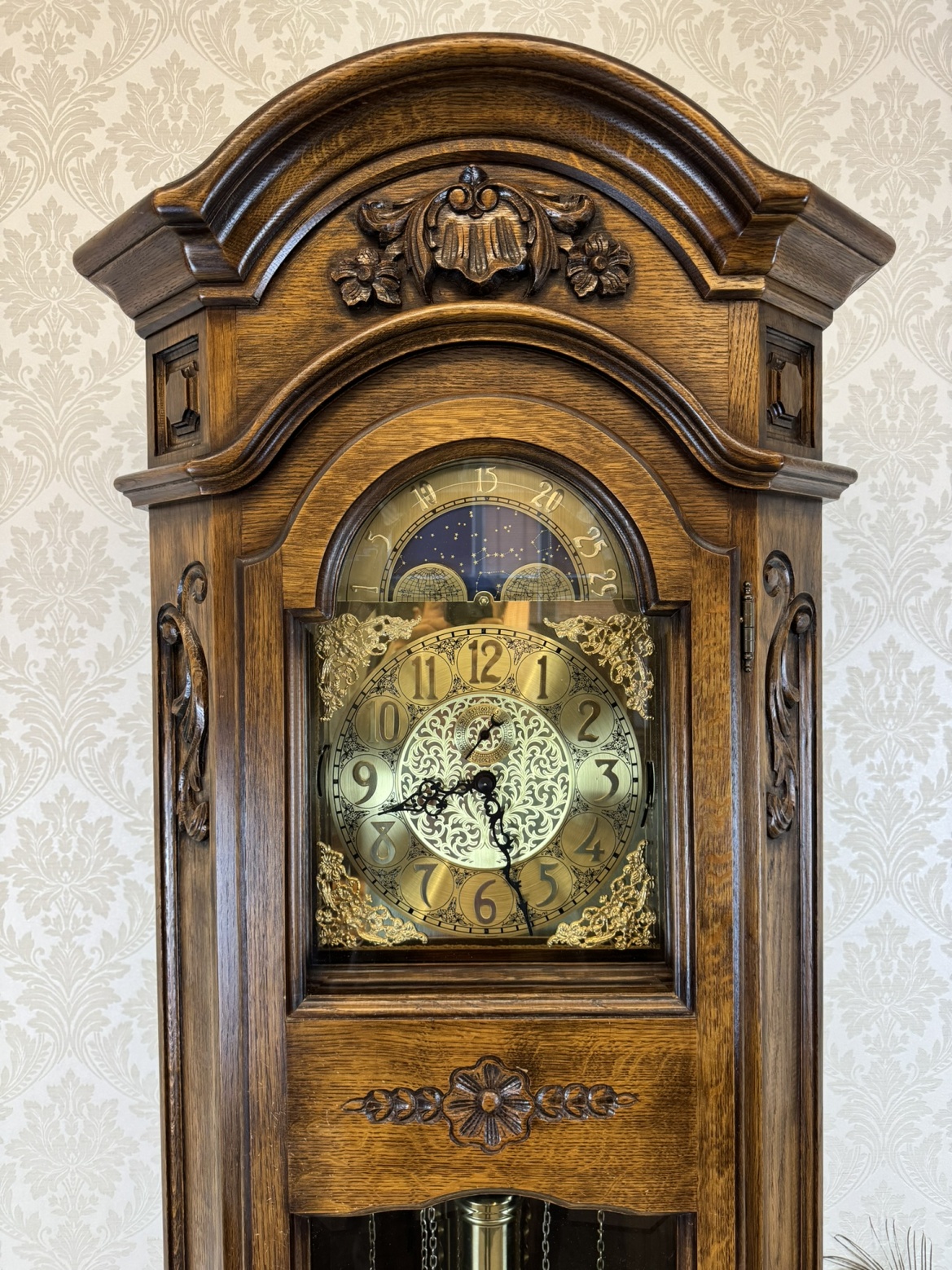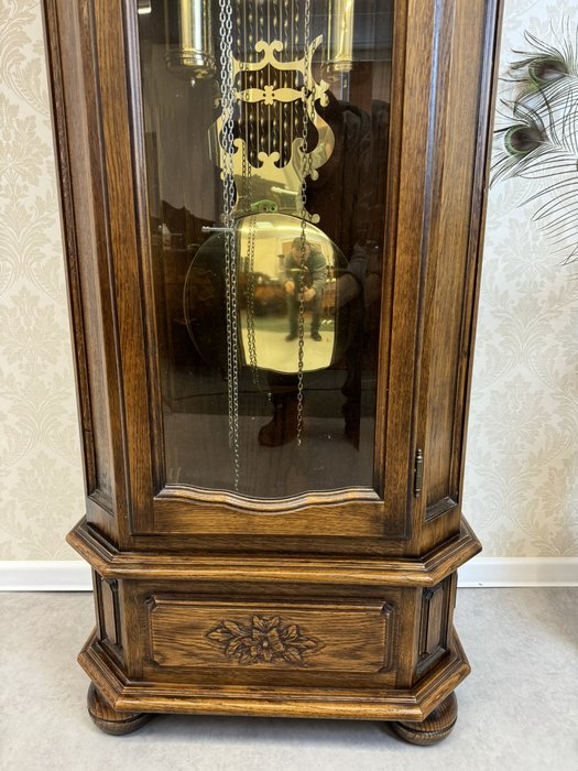 Krásne drevené kyvadlové hodiny s jemnou rezbou v hornej časti a bohato zdobeným zlatým ciferníkom. Hodiny majú sklenenú skrinku, ktorá odhaľuje kyvadlo a ozdobné mechanické prvky. Na podstavci sú vyrezávané kvetinové motívy, ktoré hodinám dodávajú elegantný a tradičný vzhľad. Hodiny sú vyrobené z masívneho dreva