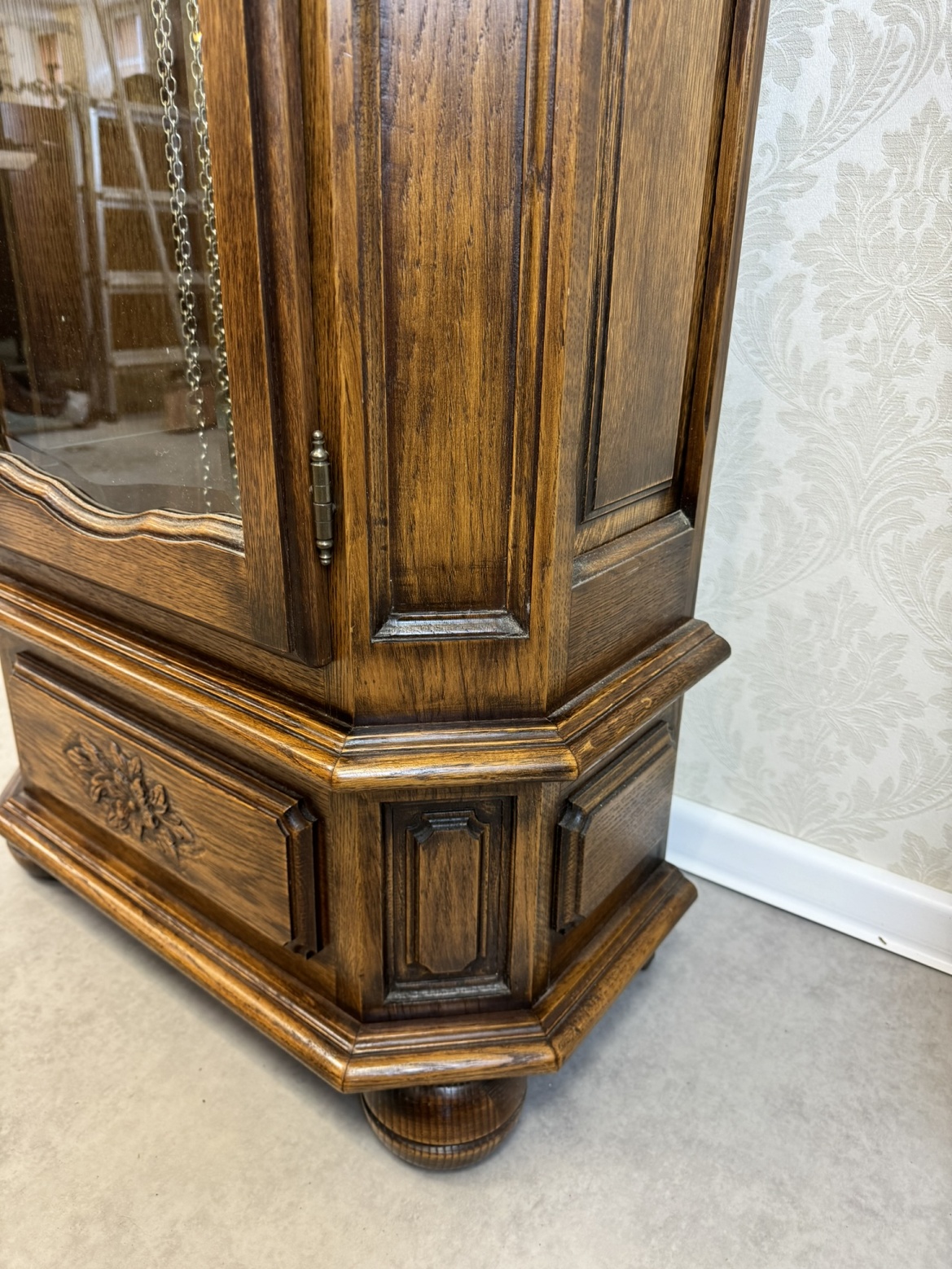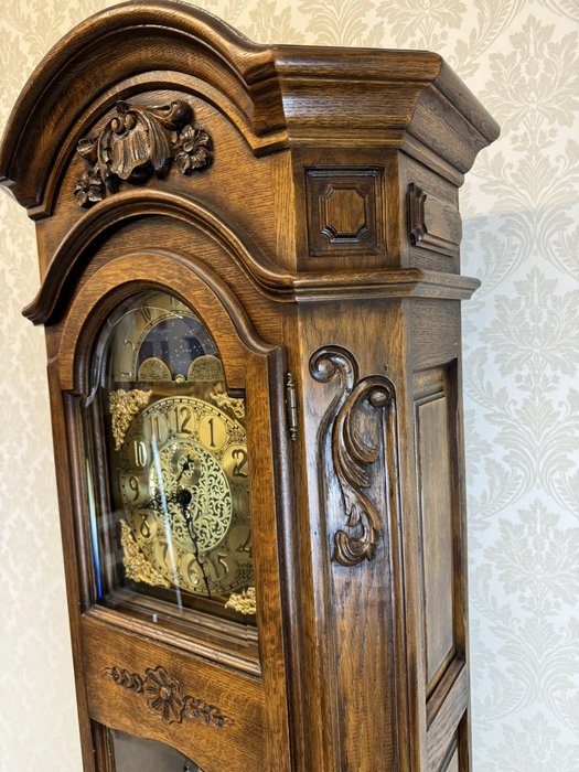 Veľké podlahové hodiny s mosadzným kyvadlom a závažím, umiestnené v korpuse s výraznou boulle intarziou v červených a zlatých tónoch. Vrchnú časť zdobí ciferník s rímskymi číslicami a lunárnou fázou. Barokovo tvarovaný sokel spočíva na rezaných levích labkách. Hodiny zaujmú svojou reprezentatívnou výzdobou a monumentalitou.Novinka