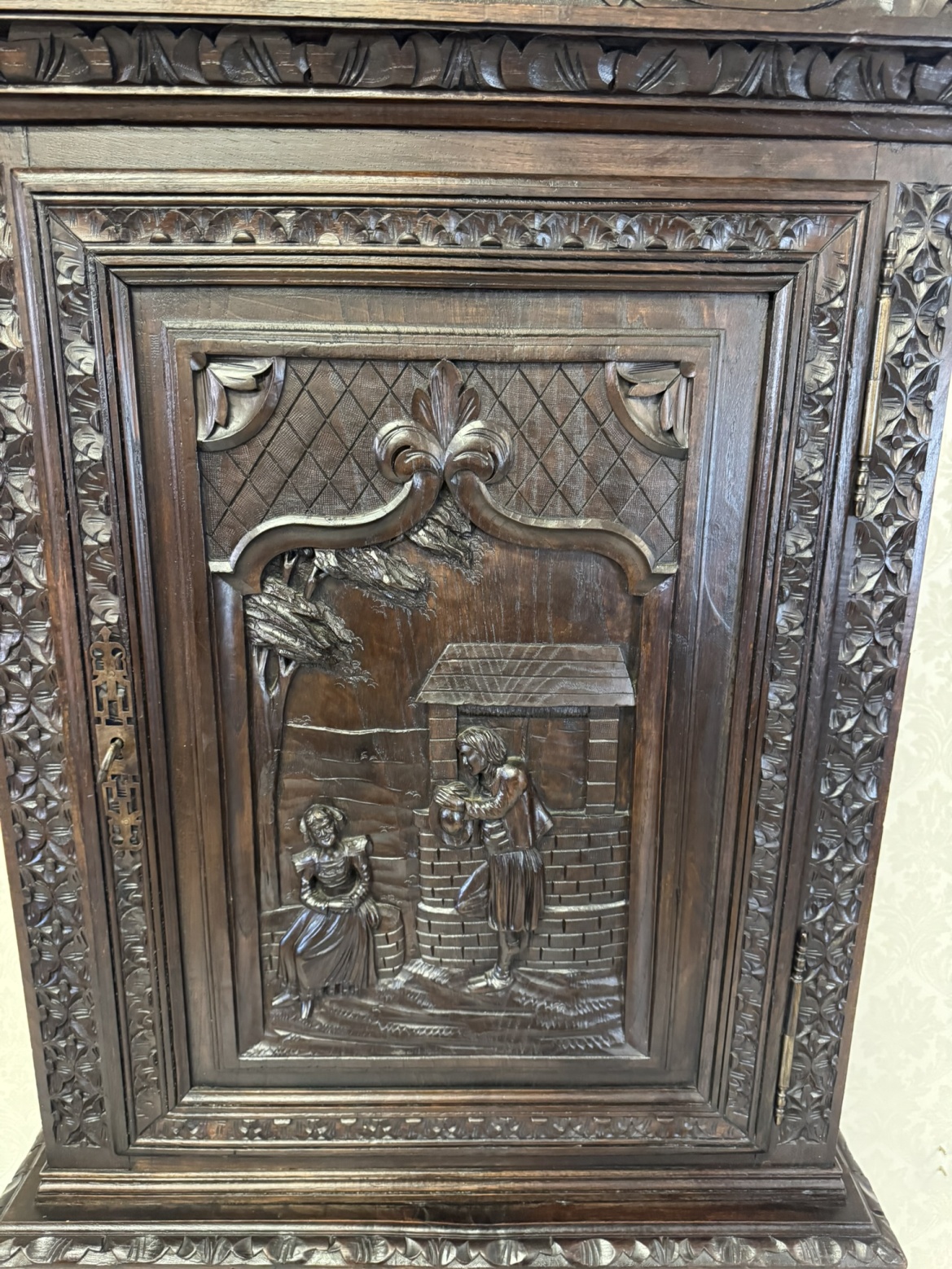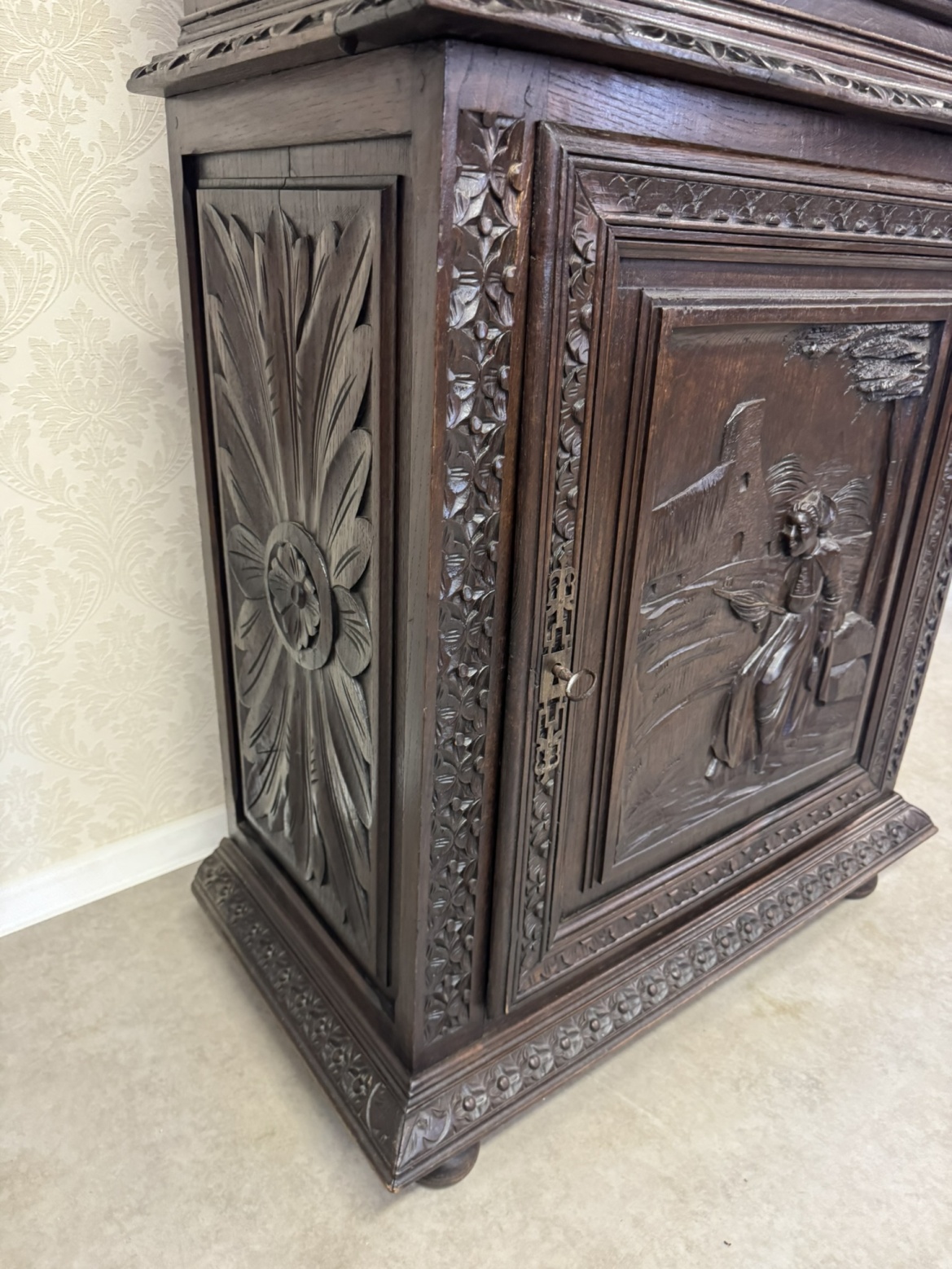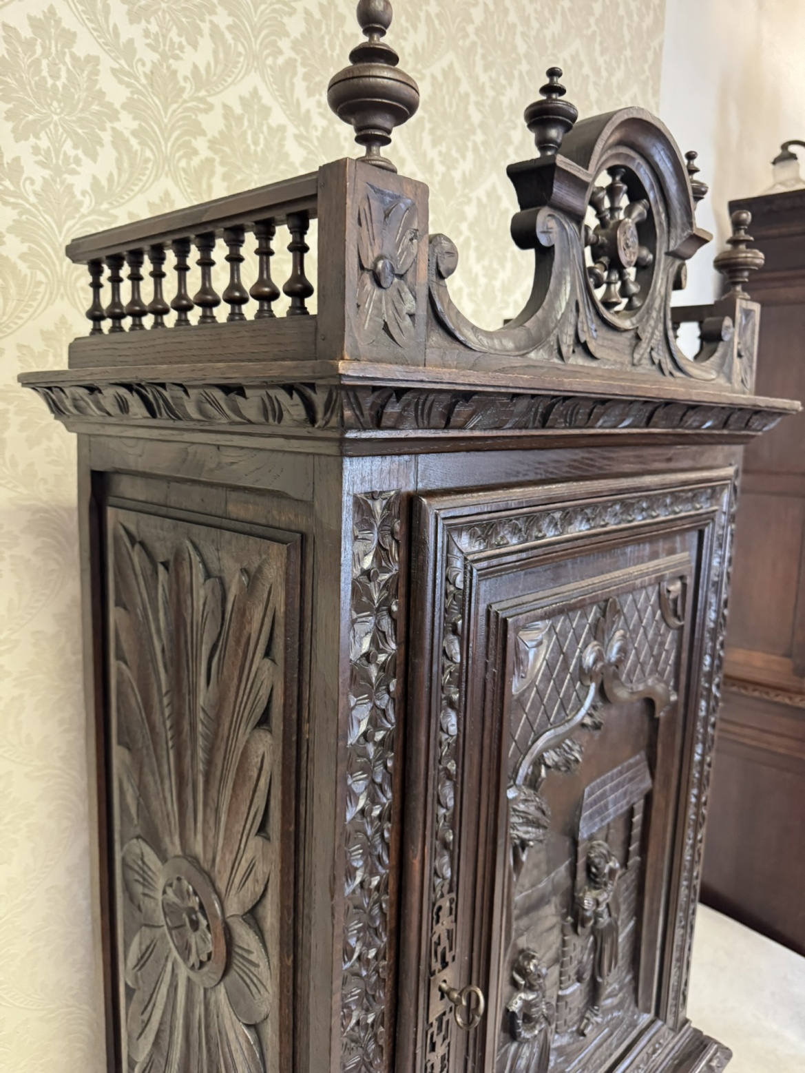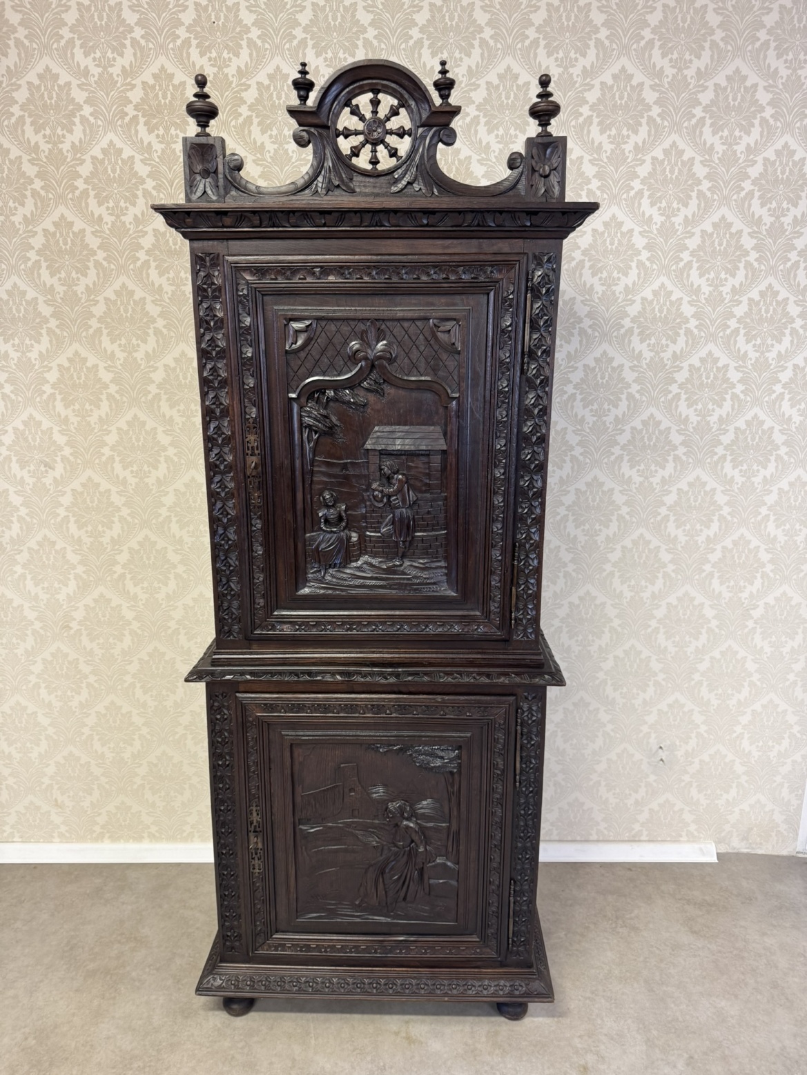 Príborníková skriňa s figurálnym reliéfom a ozdobnou korunkou - k45
