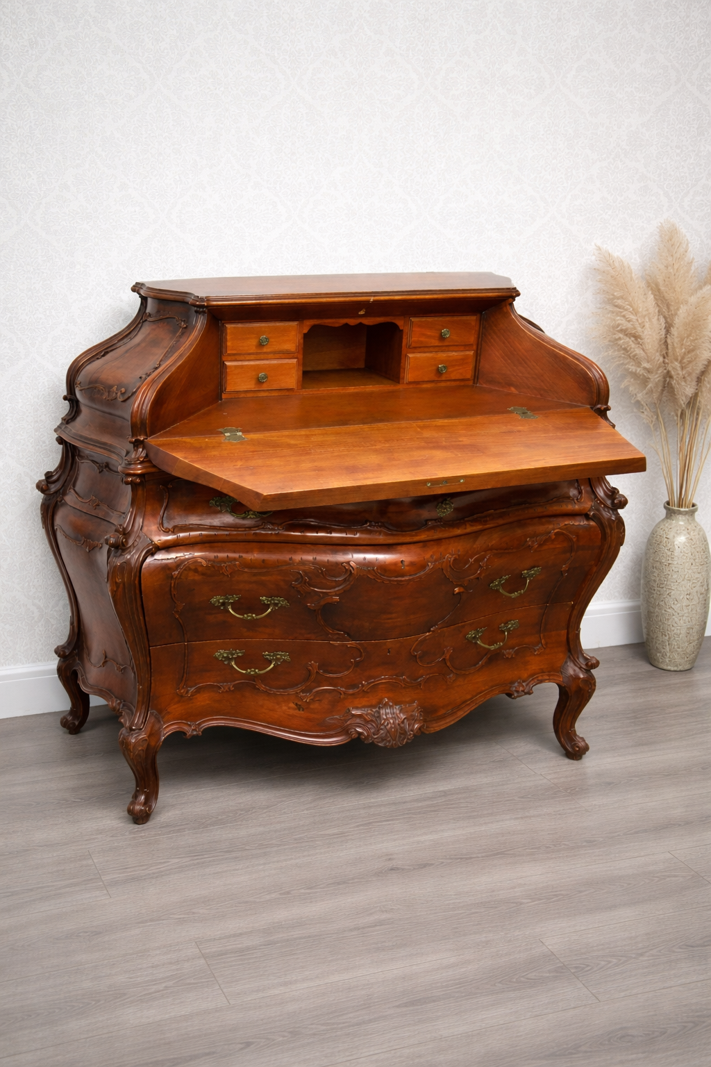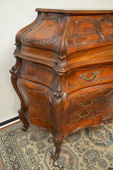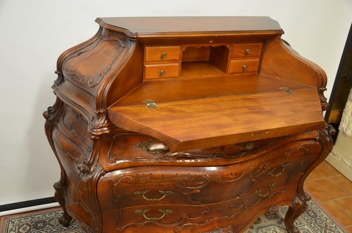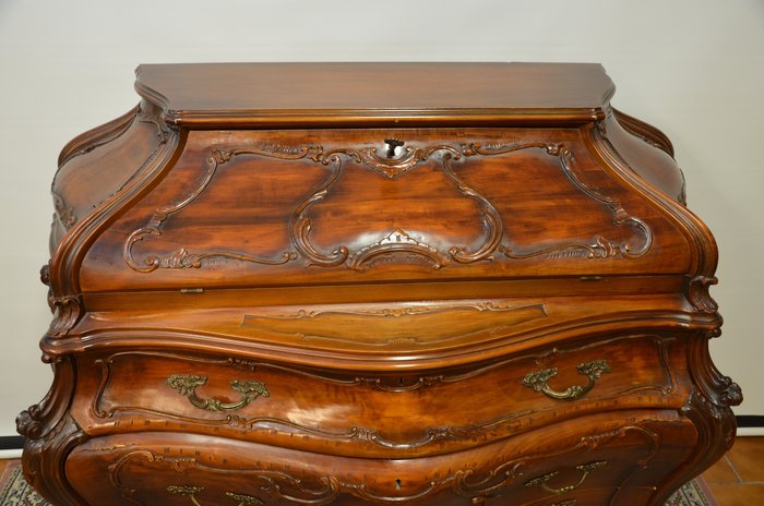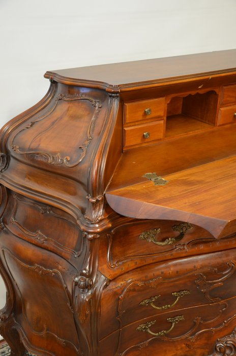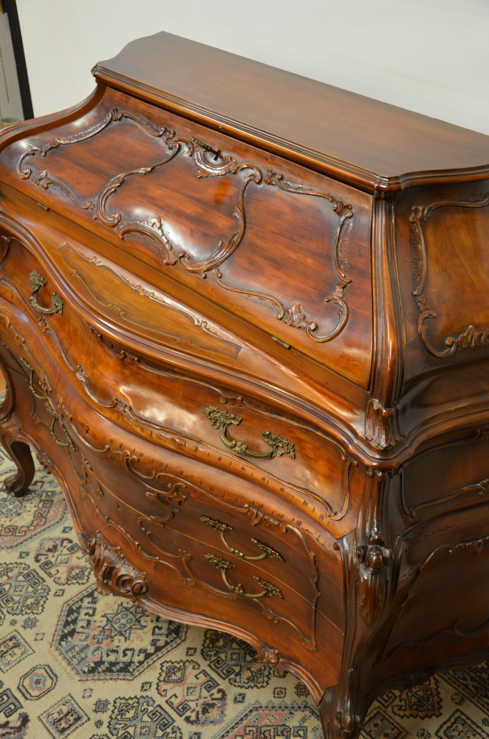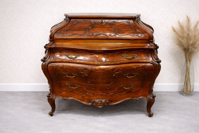 Tento výjimečný psací stolek z masivního dřeva vyniká svým charakteristickým břichatým tvarem a bohatým zdobením. Zakřivené linie ladně propojují jednotlivé části nábytku, které jsou navíc doplněny detailními intarziemi s florálními motivy. Vrchní část nabízí praktický úložný prostor se zásuvkami, zatímco precizně vyřezávané nohy podtrhují eleganci celého kusu. Tento psací stolek představuje mistrovské zpracování v duchu rokokového stylu, jehož hlavní rysy jsou asymetrie a jemná dekorativnost.