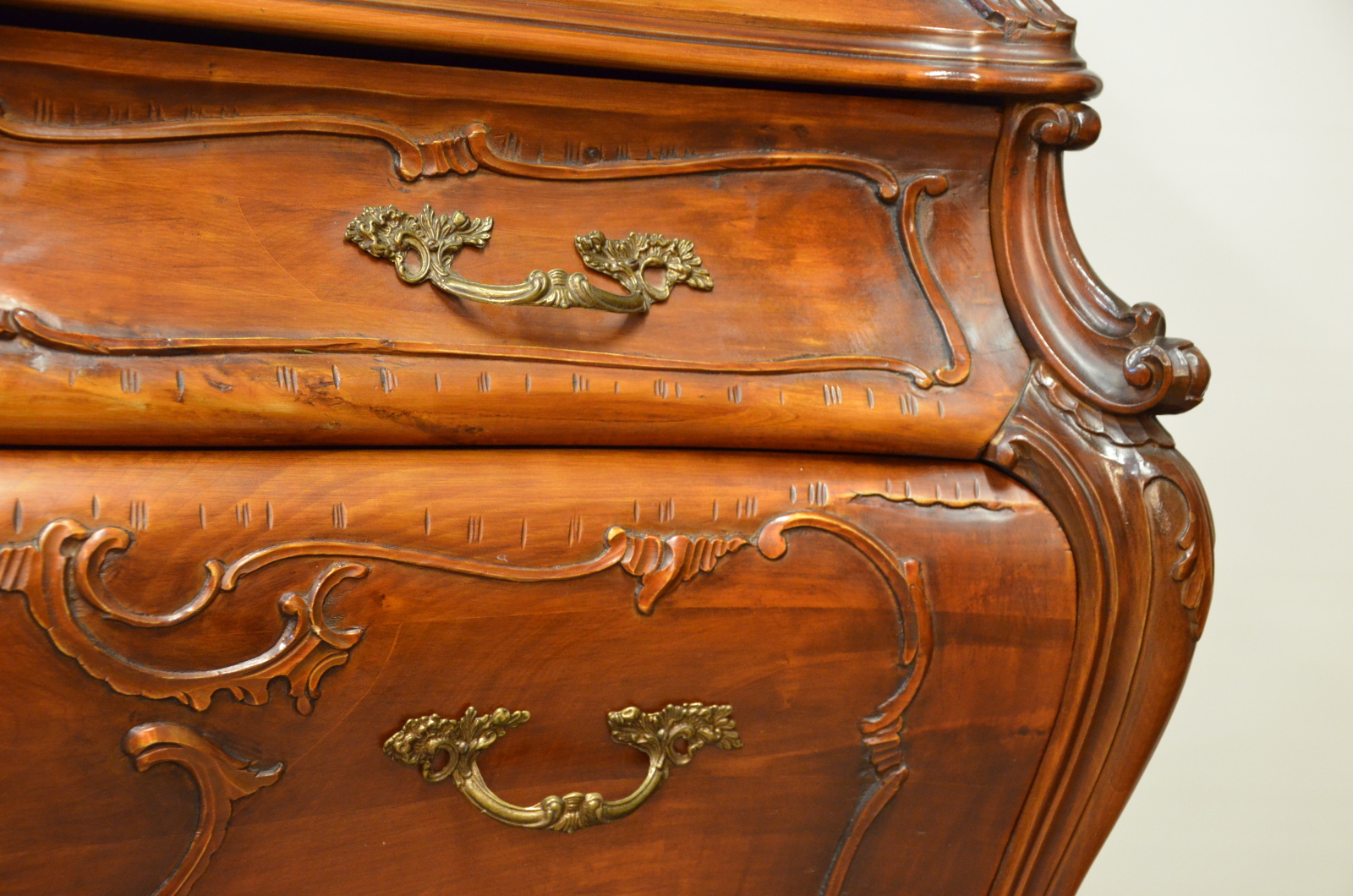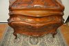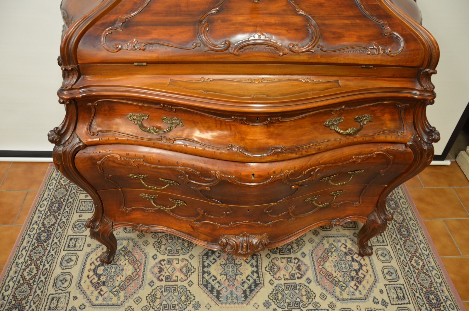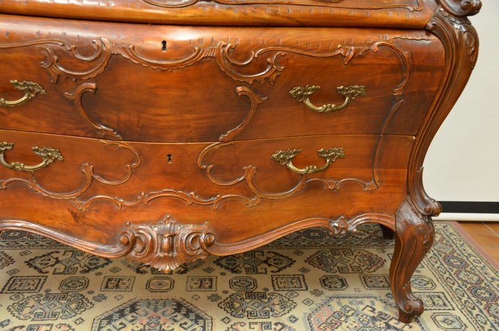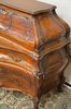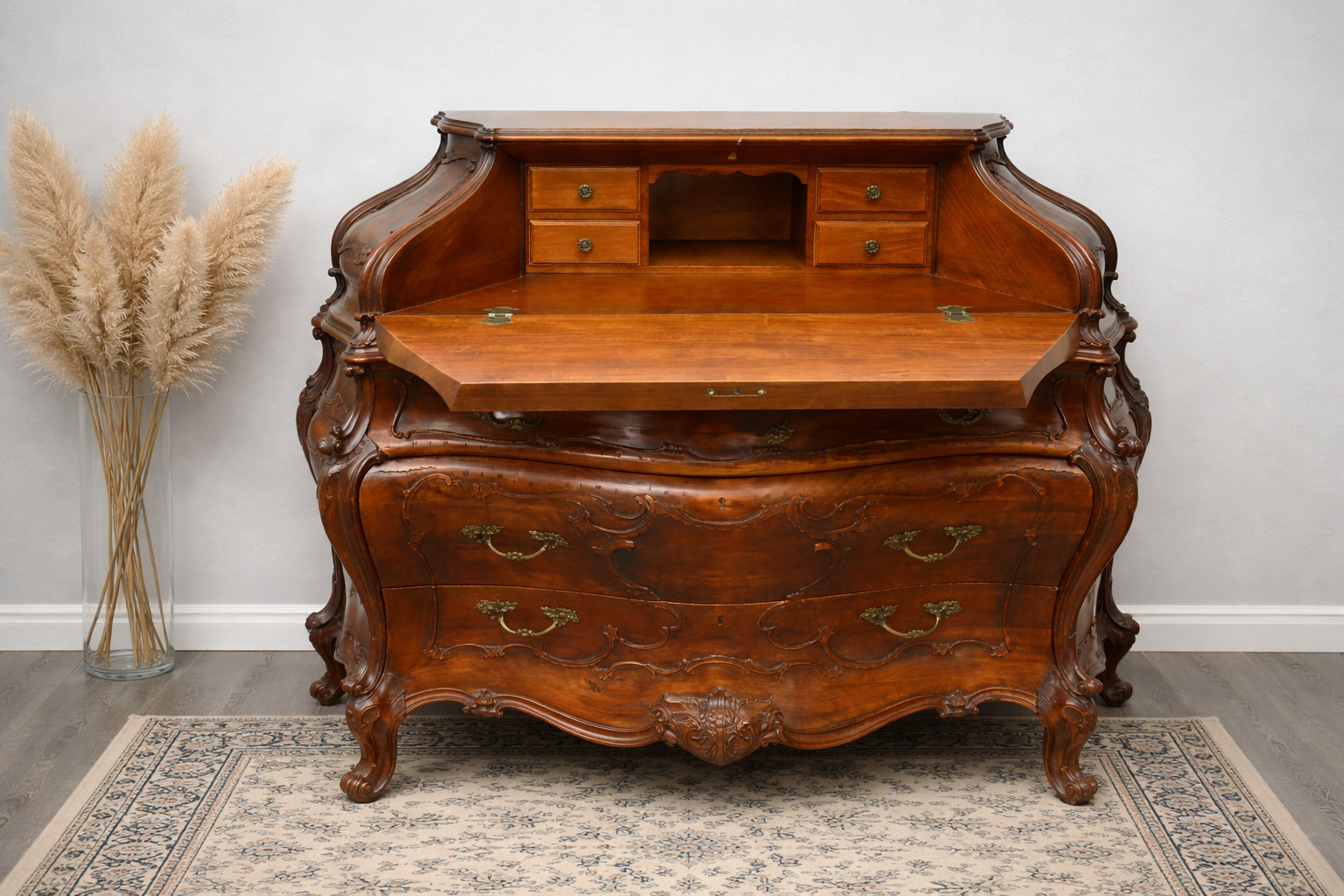 Tento výjimečný psací stolek z masivního dřeva vyniká svým charakteristickým břichatým tvarem a bohatým zdobením. Zakřivené linie ladně propojují jednotlivé části nábytku, které jsou navíc doplněny detailními intarziemi s florálními motivy. Vrchní část nabízí praktický úložný prostor se zásuvkami, zatímco precizně vyřezávané nohy podtrhují eleganci celého kusu. Tento psací stolek představuje mistrovské zpracování v duchu rokokového stylu, jehož hlavní rysy jsou asymetrie a jemná dekorativnost.