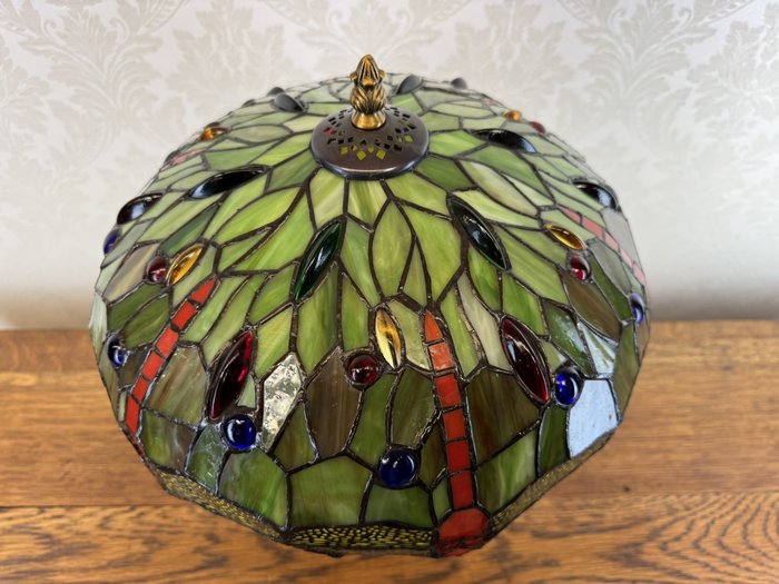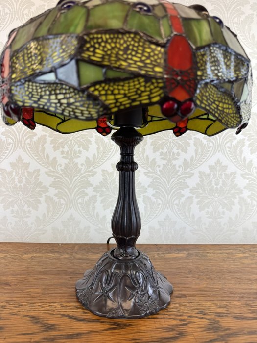 Replika stolnej lampy s vitrážovým tienidlom v zelených tónoch a motívom vážok, cena za ks - ax8