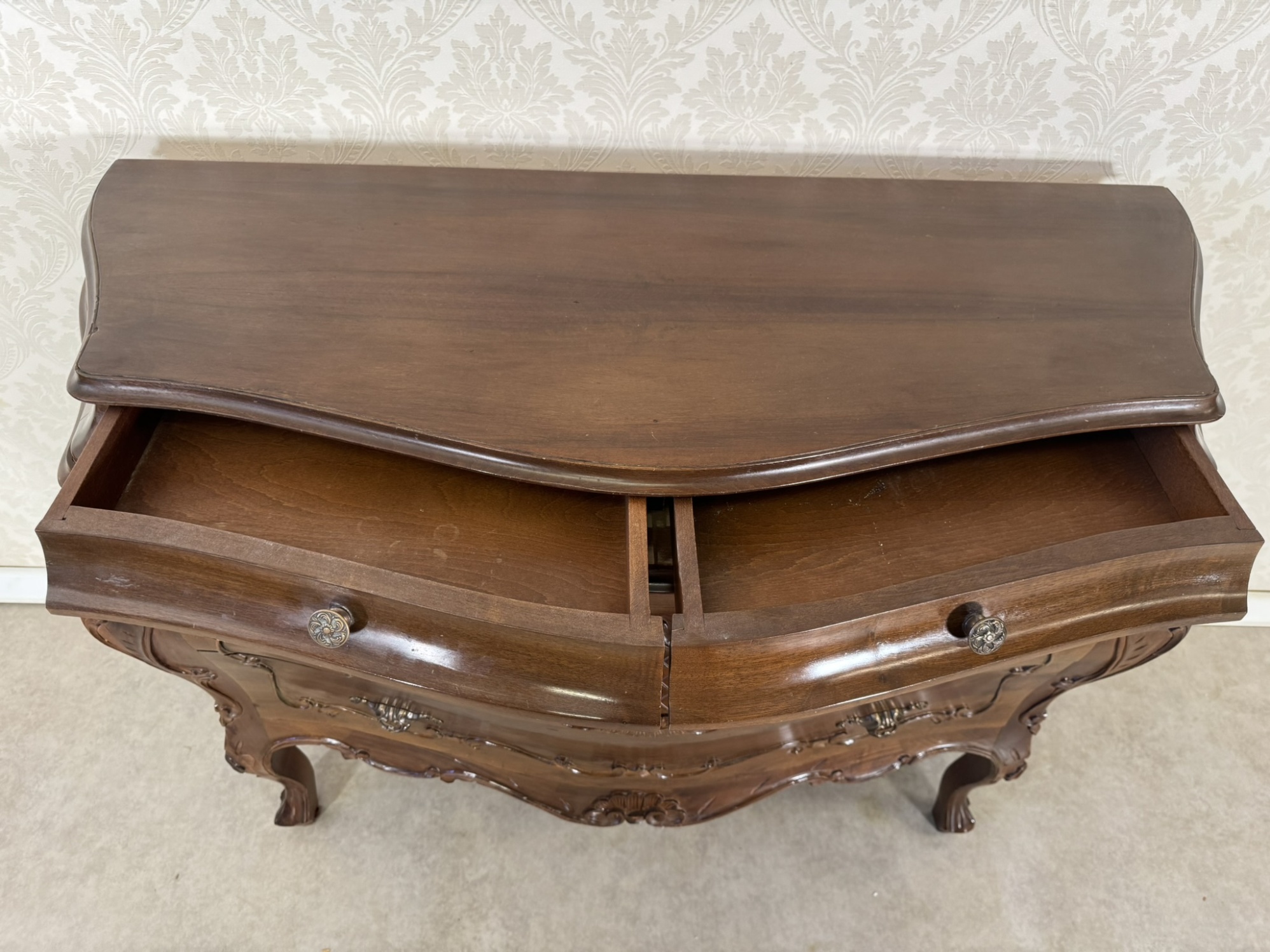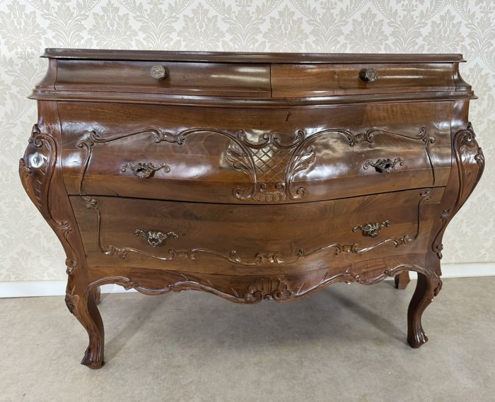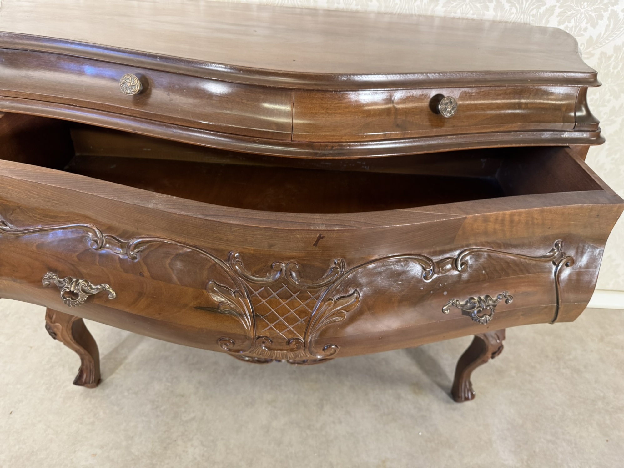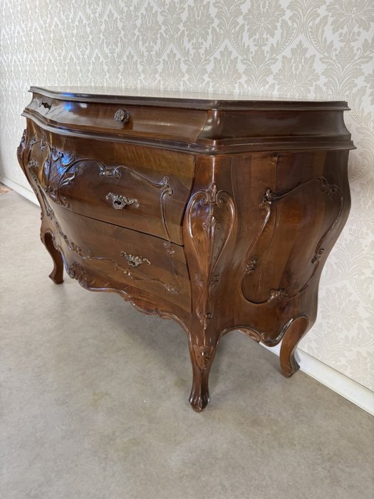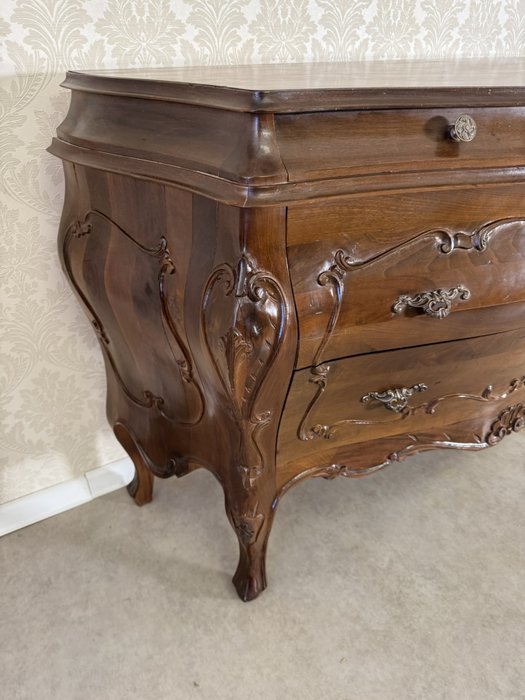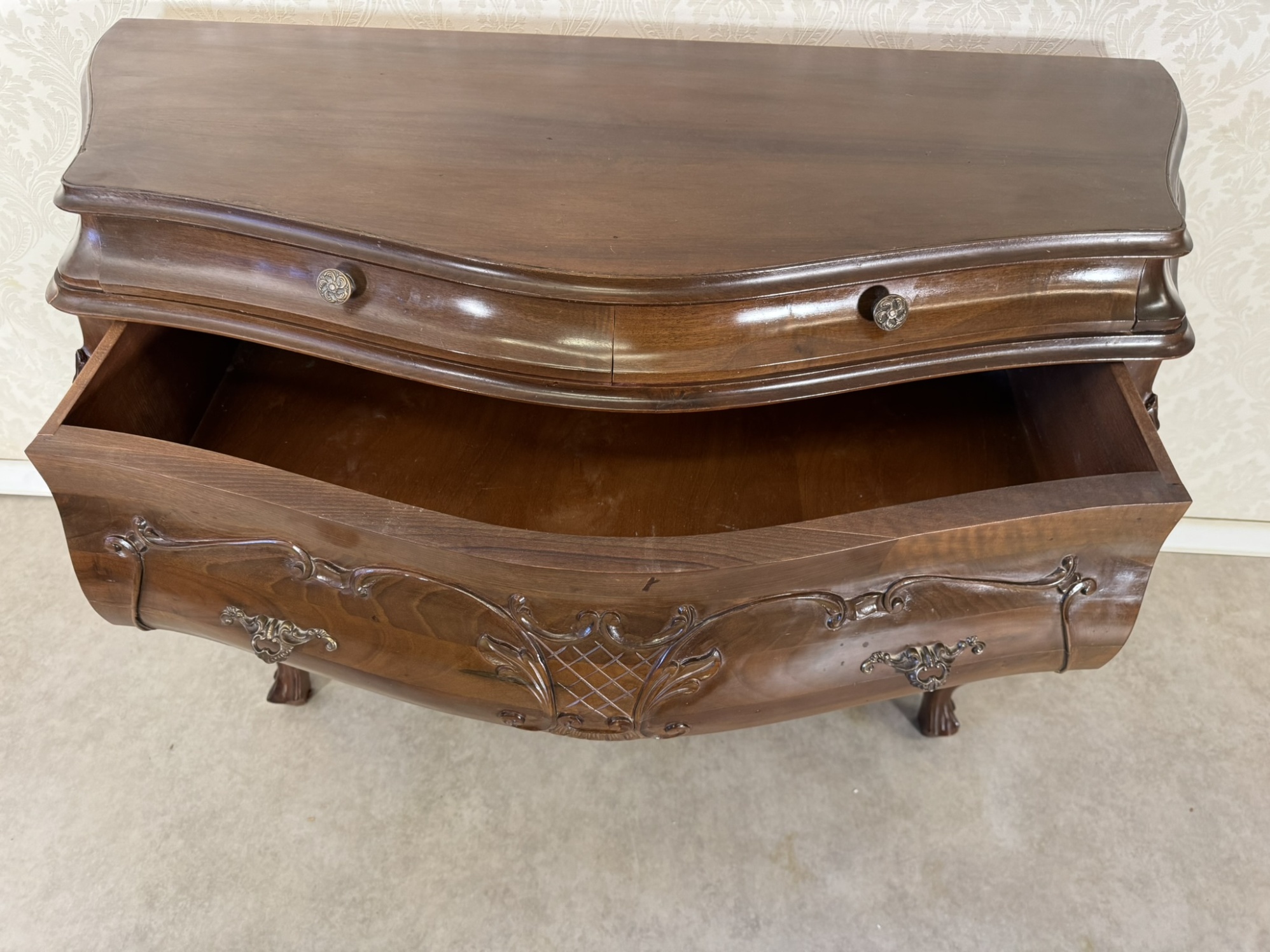 Prednú časť bruchatky zdobia jemné ornamenty a elegantné kovové úchyty, ktoré podčiarkujú jej noblesný charakter. Komoda disponuje priestrannými zásuvkami, ideálnymi na uloženie drobných predmetov. Stojí na krivkovito tvarovaných nohách, ktoré dodávajú celku ľahkosť a harmóniu.