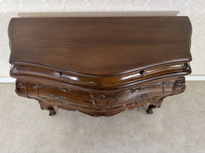 Reprezentatívna vitrína s bohato profilovanou rímsou a zdobením v hornej časti. Dvojité presklené dvierka s delenými sklami odhaľujú tri priestranné police, vhodné na vystavenie porcelánu či dekorácií. Spodné panely dvierok zdobia jemné rezbované ornamenty a celá vitrína stojí na elegantne tvarovaných nohách s decentným kvetinovým motívom.Reprezentatívna komoda s rezbou