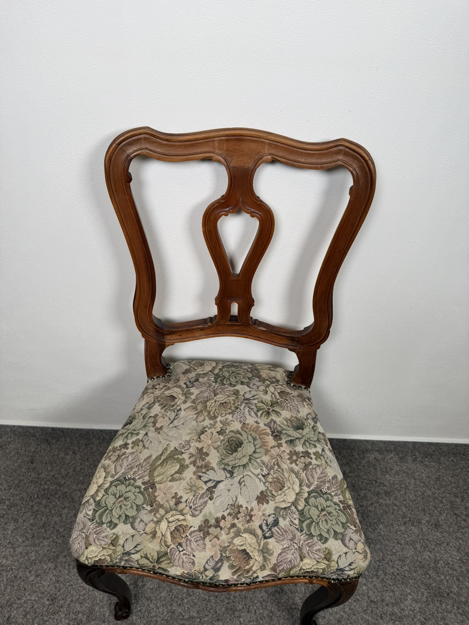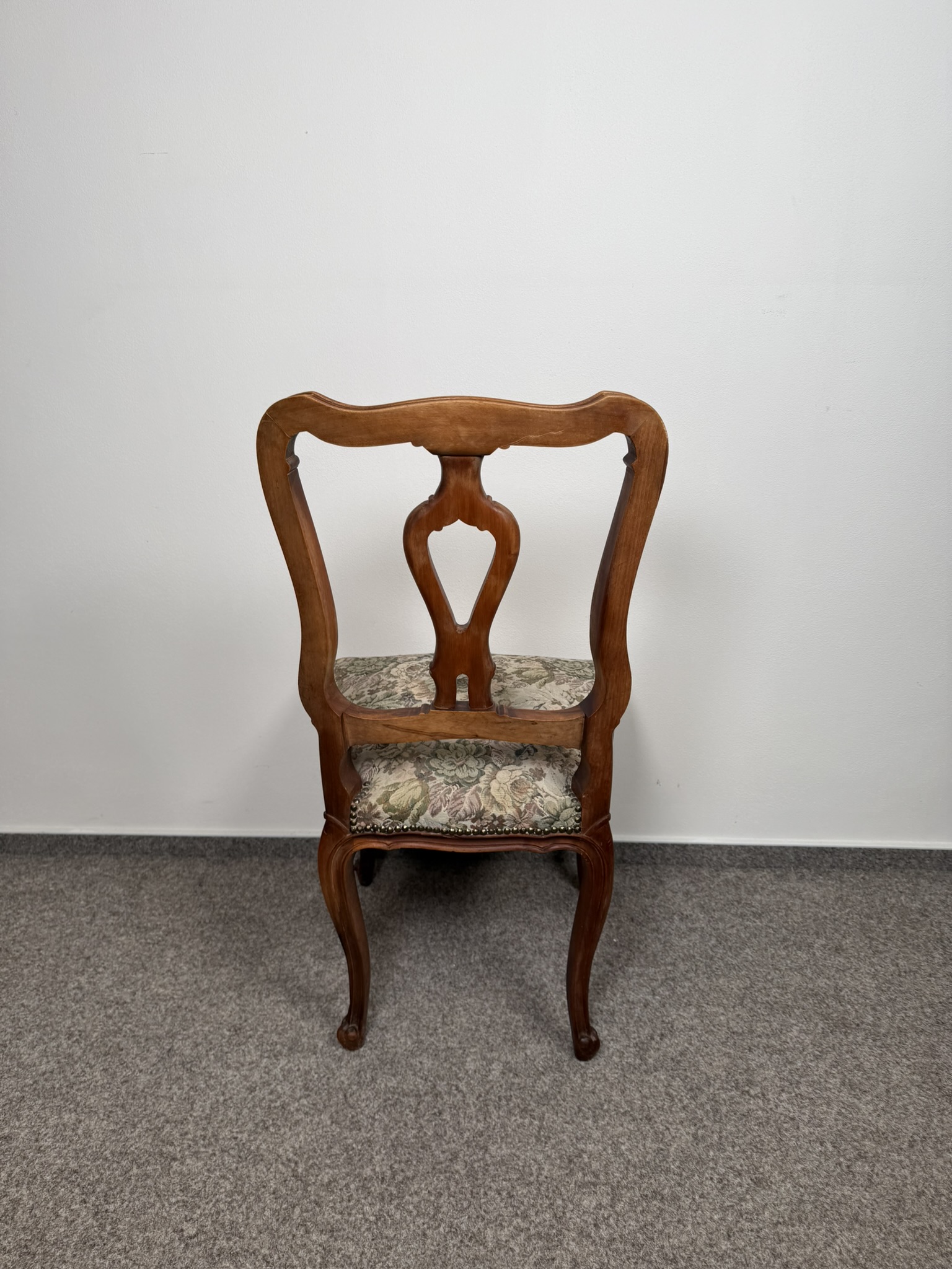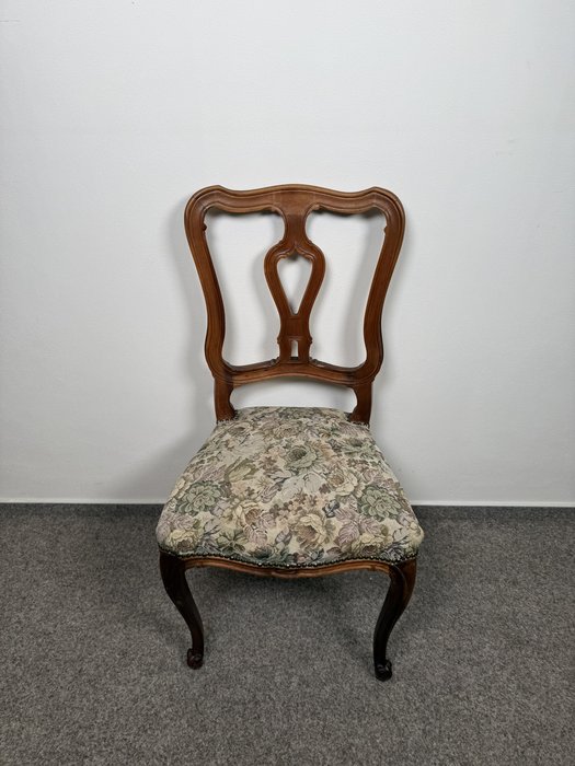 Jídelní sestava je tvořená rozkládacím stolem a šesti židlemi s čalouněnými sedáky v květovaném potahu. Stůl stojí na centrální řezbované noze s čtyřramenným podnožím, zakončeným volutami. Deska s vloženým středovým pásem, který se uplatní při rozložení. Židle mají tvarovaná opěradla s prořezem a esovitě prohnuté nohy. Po rozložení stůl měří 167 cm.