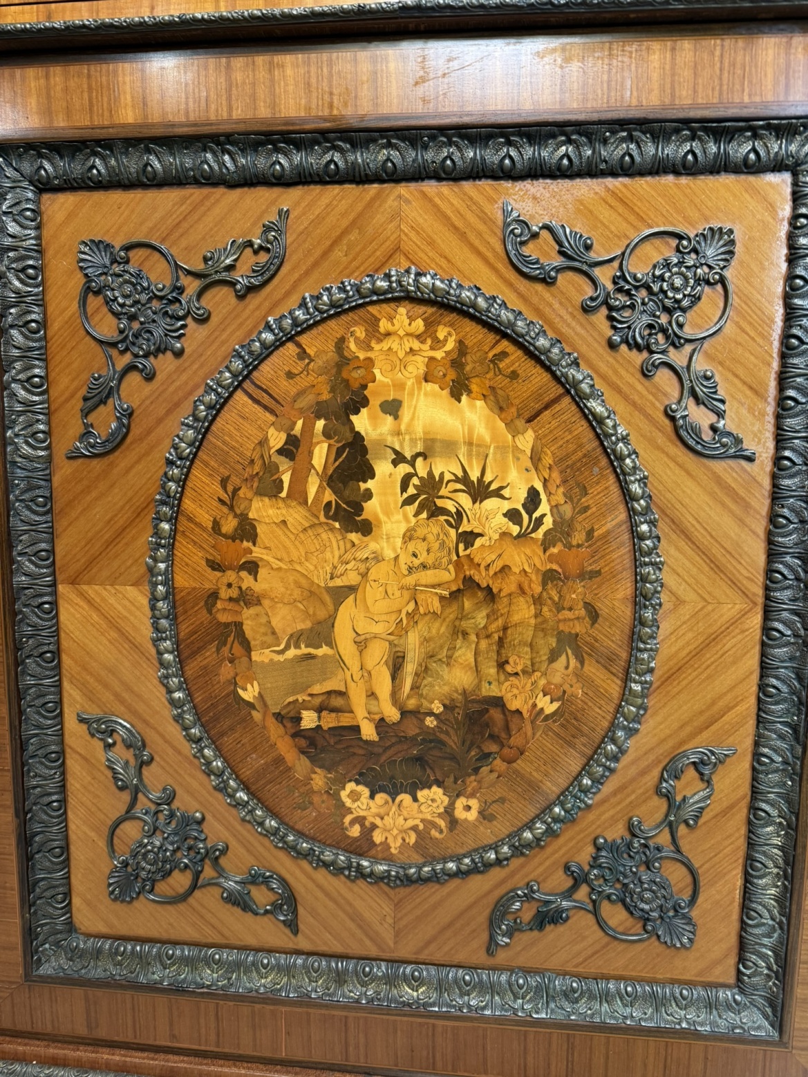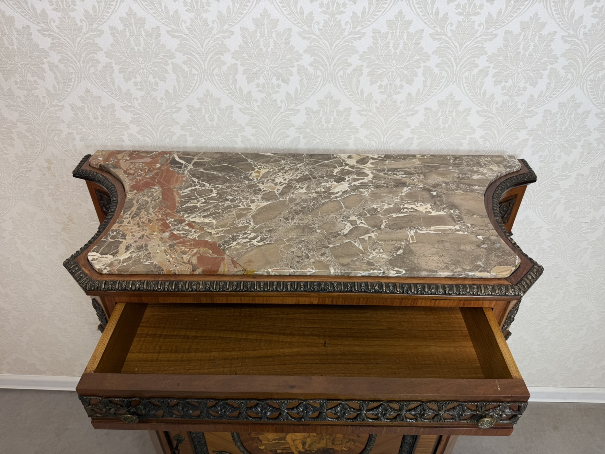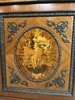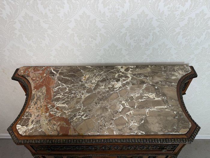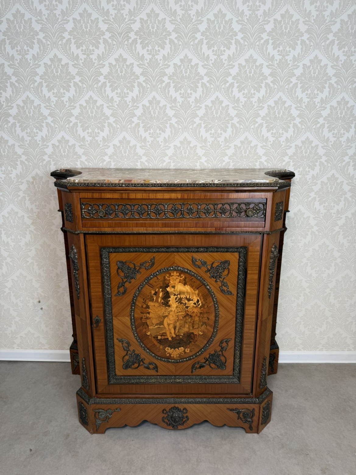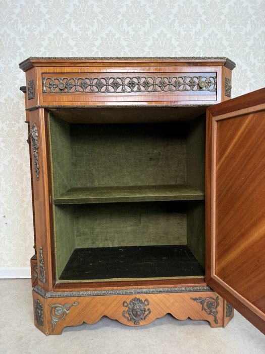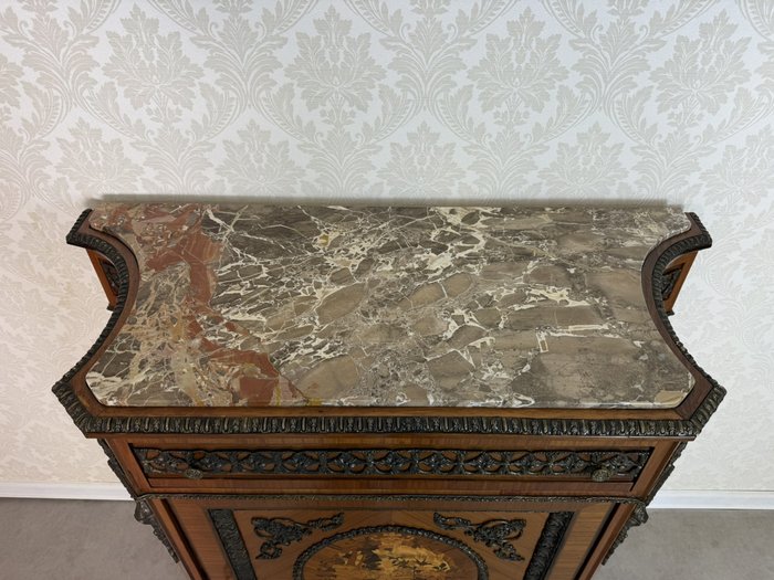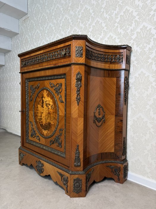 Luxusná jednodverová skrinka zdobená jemnou intarziou s výjavom anjela v prírodnom motíve, zasadenú do oválneho stredu dvierok. Mramorová doska ladí s teplým odtieňom dreva a je lemovaná bohatým bronzovým dekórom, ktorý sa opakuje na spodnej časti a rohoch. Vnútorný priestor je čalúnený. Vysoká remeselná úroveň a bohaté ozdoby odkazujú na francúzsky pôvod.1 550 €