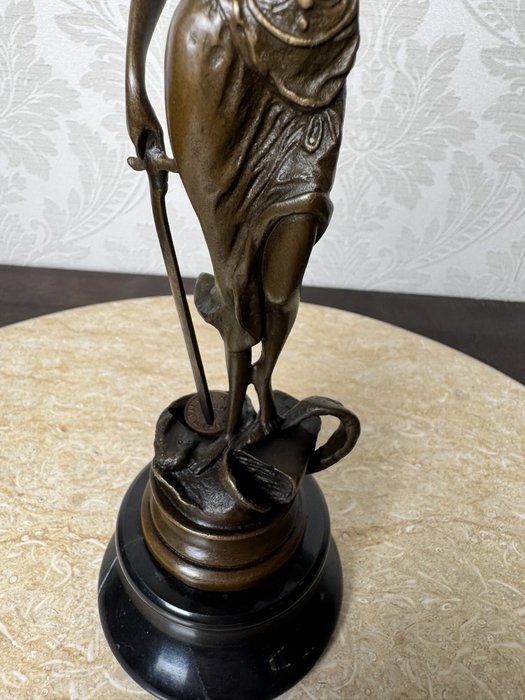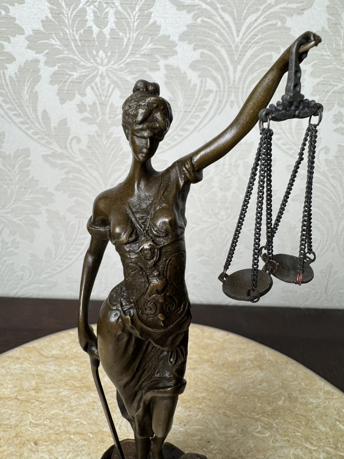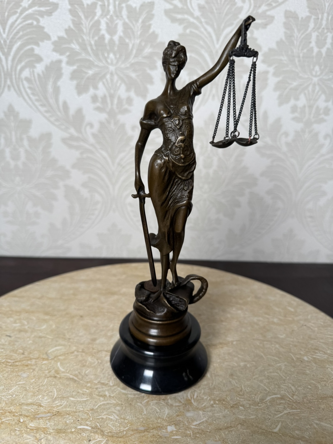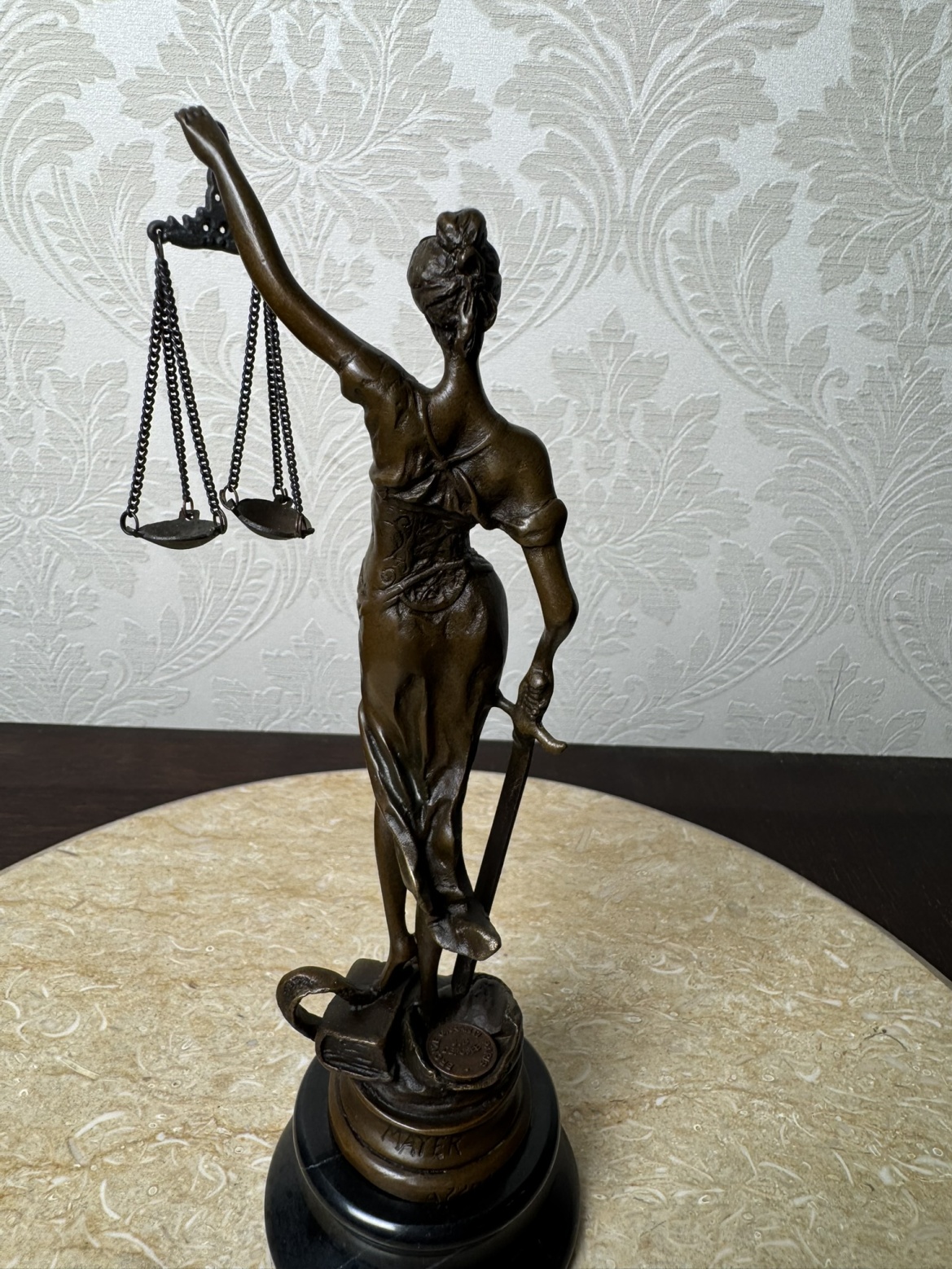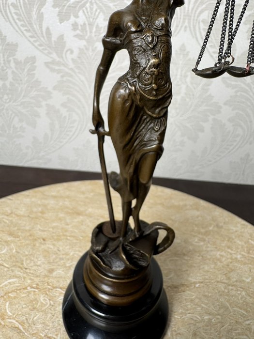 Elegantná socha Spravodlivosti (Justícia) z bronzu na podstavci z čierneho mramoru. Postava ženy s páskou cez oči drží váhy a meč - symboly spravodlivosti a pravdy. Precízne spracovanie aj podpis autora (Mayer) robí z tejto dekorácie dôstojný doplnok do kancelárie, pracovne alebo právnej inštitúcie.Nové