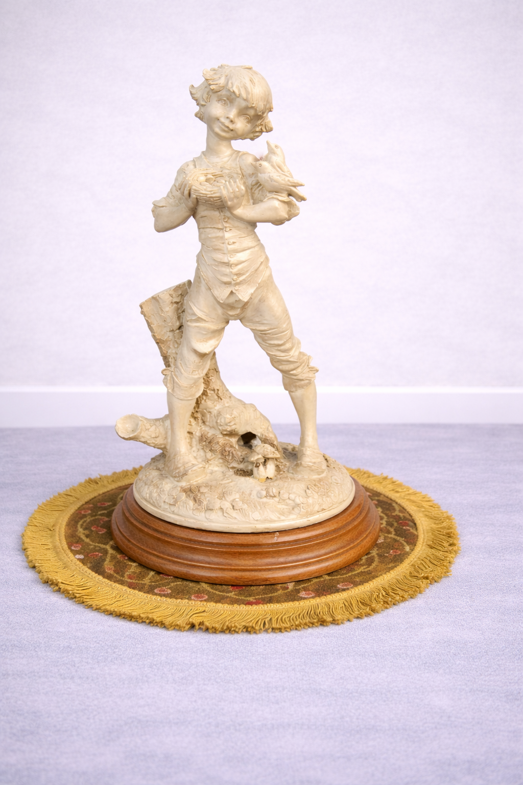 Detailne spracovaná soška chlapca, ktorý drží vtáčika, s jemnými prvkami a prirodzeným postojom. Postava chlapca je zasadená na dekoratívnom podstavci, čo dodáva soške pôvab a dôstojnosť. Jemné línie a realistické stvárnenie odkazujú na klasicistický štýl, ktorý si zakladá na harmónii a detaile.