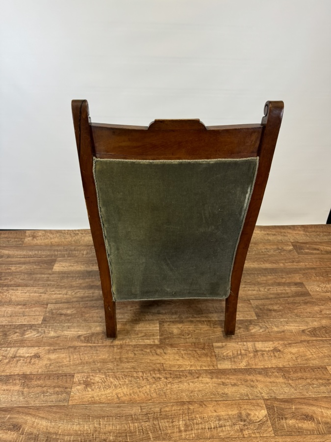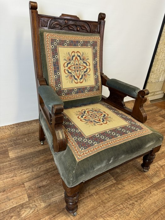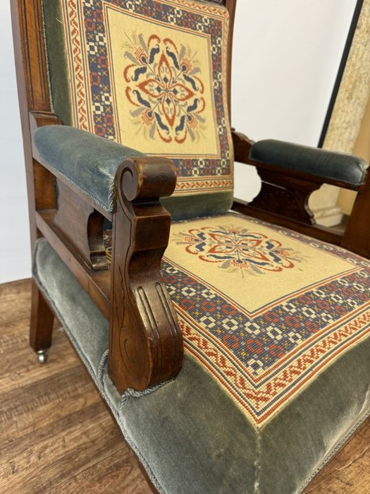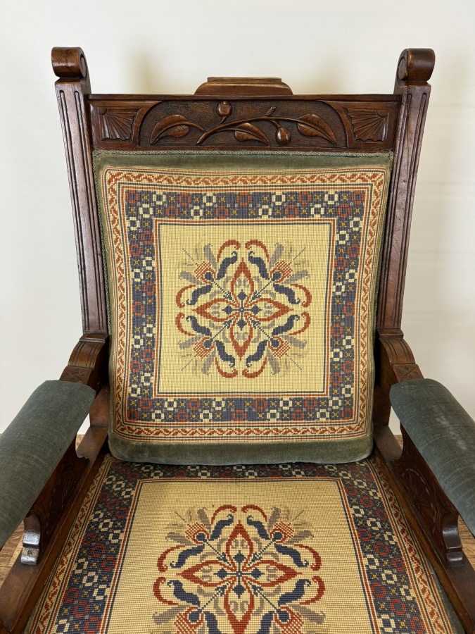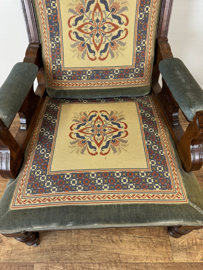 Starožitné vyrezávané kreslo s vyšívaným čalúnením, obdobie biedermeier