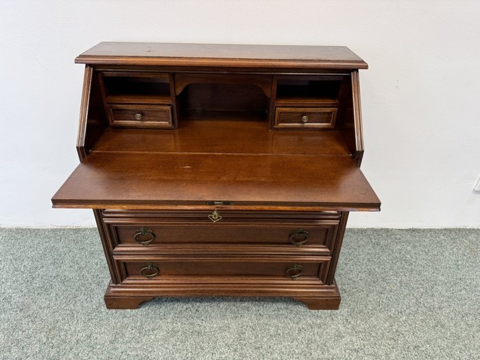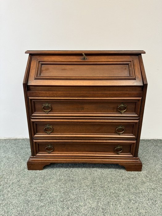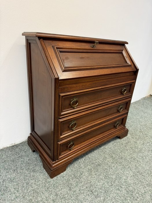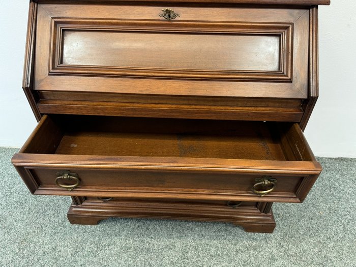 Elegantný sekretár s výklopnou písacou plochou, hornou zásuvkou a bohato členeným vnútrom s malými šuplíkmi. Vrchná doska z mramoru je lemovaná ozdobnými mosadznými prvkami, po stranách sa nachádzajú stĺpiky s mosadznými detailmi.Skrinka s výklopnou doskou