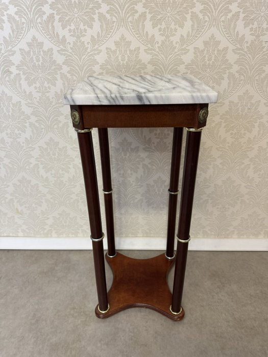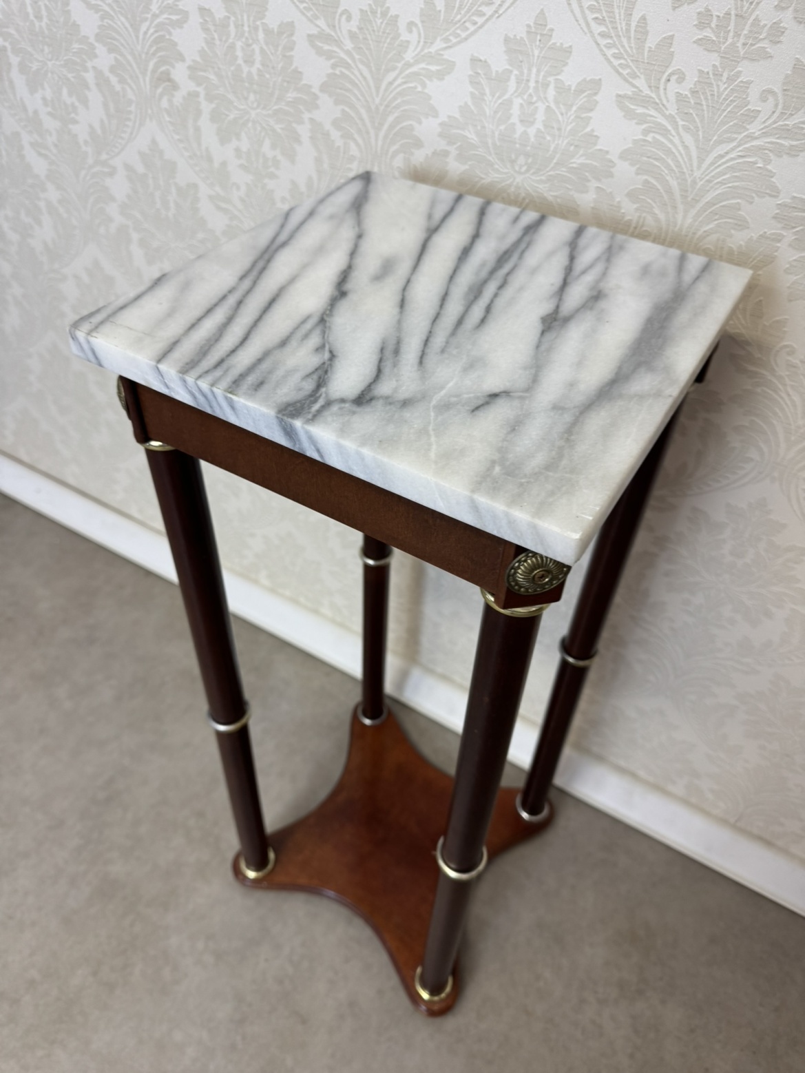 Luxusná komoda s tvarovanou ružovou mramorovou doskou, bohatou dyhou a intarziami kvetov vo vázach. Bronzové aplikácie, hlavičky, rozety a ozdobné lišty dotvárajú reprezentatívny charakter. Vybavená zásuvkou a dvoma dvierkami, vo vnútri police. Ukážka precízneho remesla a štýlového dekoru.Stolík s mramorovou doskou, cena za ks